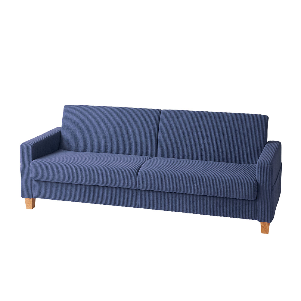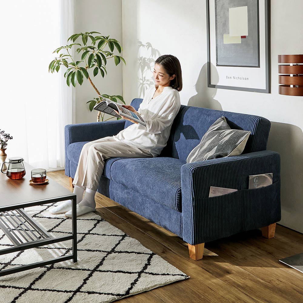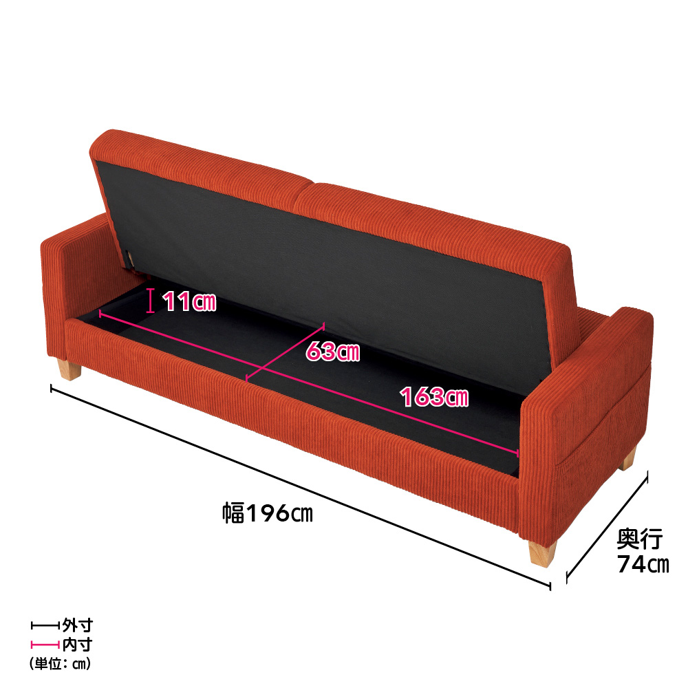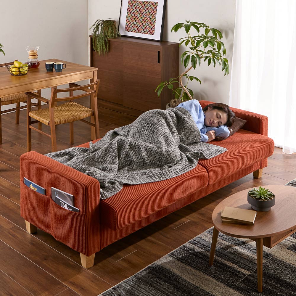狭いお部屋でも置ける、こだわりの奥行74cm。奥行コンパクトでも窮屈さを感じさせないソファベッドです。背もたれを倒せば、ソファからベッドに早変わり。さらに収納付きの1台3役! 生地には、肌触りなめらかなトレンドのコーデュロイを採用しました。幅は2サイズからお選びいただけます。奥行74cmのコンパクト設計。コーデュロイ素材がおしゃれな1台3役の収納ソファベッド(ア)ブルー ※写真は別売りの幅176cmタイプ ※モデル身長160cmこだわったのは、コンパクトでも座面の狭さを感じさせない奥行74cmというサイズ。狭いお部屋にも置けて、ゆったり座れます。しかも座面の下が収納庫になっていて、ベッドにも早変わりする、スペース効率抜群の1台3役。トレンドのコーデュロイ生地がおしゃれな、お部屋が狭い方におすすめしたいソファベッドです。そのままの場所で、ベッドに早変わり(イ)ブラッドオレンジ ※モデル身長160cm座面を持ち上げ、後方にぐっと押し込むだけでベッドに変身。戻すのも簡単なので、仮眠や客用のベッドとしても大活躍。ソファ時は奥行74cm、ベッド時でも奥行97cmとスリムだから、狭いLDKでもセンターに配置するレイアウトを楽しめます。壁際に置く際も、壁との間に約6cmあれば、そのままの位置でベッドにできます。座面の下は大容量の収納庫に※写真は別売りの幅176cmタイプですよく使うものやストック品をたっぷり収納でき、座面をさっと持ち上げて出し入れも簡単。生活感を隠せて、ごちゃごちゃのリビングを卒業できます。ソファのままでも、ごろ寝も快適(ア)ブルー ※写真は別売りの幅176cmタイプです。 ※モデル身長160cmちょっとごろ寝したいときは、ソファのままで。絶妙な高さの肘掛が枕になってくれます。脚部を外せば、床に近い暮らしで心が落ち着くローソファに(ウ)チャコール ※写真は別売りの幅176cmタイプです脚部はお好みで取り外すことも可能。ローソファにすれば、お部屋が広く見える効果も。座っても、寝ても、体が沈み過ぎない程よい硬さ(ウ)チャコール座面には弾力性に優れ、ヘタリにくいSバネ入り。やや硬めで少し沈み込みのある、しっかりとした座り心地です。両サイドのポケット付き。木製の脚付きでお掃除も簡単左:(イ)ブラッドオレンジ 右:(ウ)チャコール雑誌やリモコンなどを収納できて便利。下の空間は高さ約10cmで、床用ワイパーなどでさっとお掃除できます。鮮やか&ベーシックな、おしゃれな3カラーをセレクトしました左から(ア)ブルー、(イ)ブラッドオレンジ、(ウ)チャコール張り地はトレンドのコーデュロイ。肌触りなめらかで、オールシーズン快適です。詳細サイズは、こちらでご確認ください(イ)ブラッドオレンジ片付かないリビングは、「収納付きソファ」で解決!左:Before 右:After(小物類は左右とも同内容です) ※写真は別売りの幅176cmタイプです部屋が狭くてソファが置けない、リビングが物であふれて片付かない…というお悩みからは、もうお別れです。奥行スリム+収納庫付きのこのソファベッドなら、こんなにお部屋がすっきりします。しまった物の出し入れも簡単、ワンタッチでベッドになるので急な泊り客にも即対応。スペース活用の救世主として、是非あなたのお家にも。