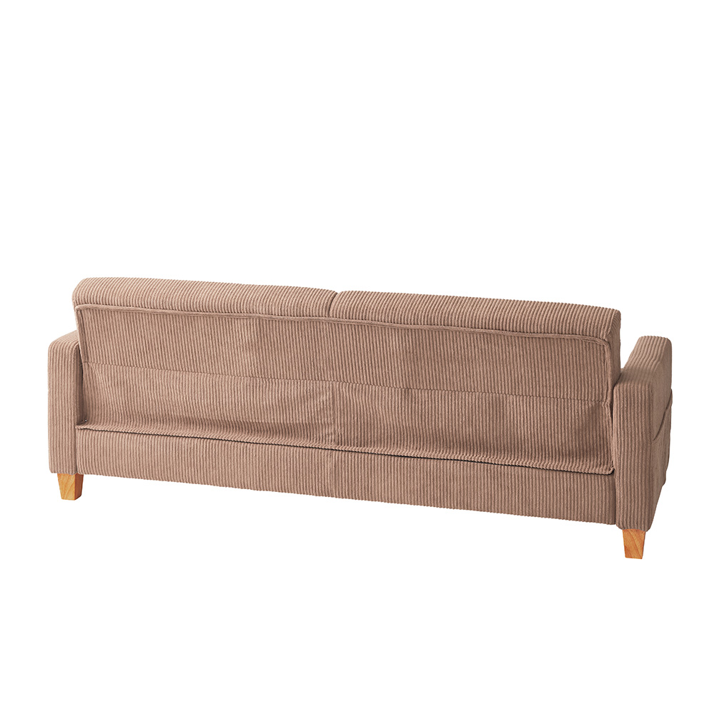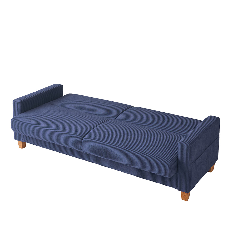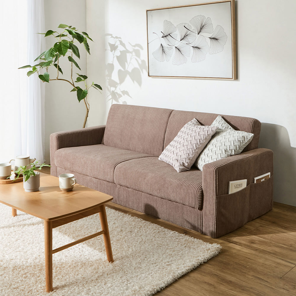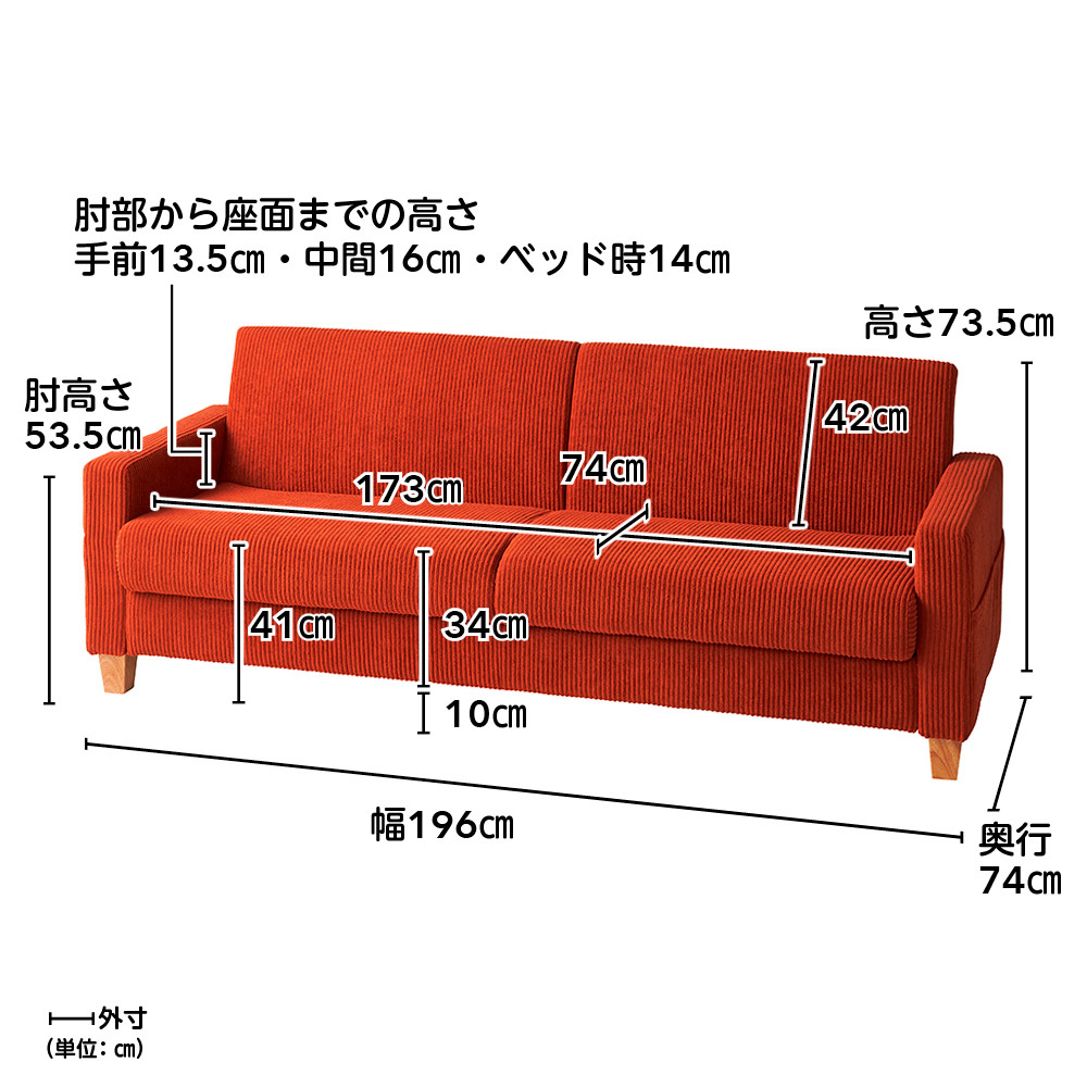 狭いお部屋でも置ける、こだわりの奥行74cm。奥行コンパクトでも窮屈さを感じさせないソファベッドです。背もたれを倒せば、ソファからベッドに早変わり。さらに収納付きの1台3役! 生地には、肌触りなめらかなトレンドのコーデュロイを採用しました。幅は2サイズからお選びいただけます。奥行74cmのコンパクト設計。コーデュロイ素材がおしゃれな1台3役の収納ソファベッド(ア)ブルー ※写真は別売りの幅176cmタイプ ※モデル身長160cmこだわったのは、コンパクトでも座面の狭さを感じさせない奥行74cmというサイズ。狭いお部屋にも置けて、ゆったり座れます。しかも座面の下が収納庫になっていて、ベッドにも早変わりする、スペース効率抜群の1台3役。トレンドのコーデュロイ生地がおしゃれな、お部屋が狭い方におすすめしたいソファベッドです。そのままの場所で、ベッドに早変わり(イ)ブラッドオレンジ ※モデル身長160cm座面を持ち上げ、後方にぐっと押し込むだけでベッドに変身。戻すのも簡単なので、仮眠や客用のベッドとしても大活躍。ソファ時は奥行74cm、ベッド時でも奥行97cmとスリムだから、狭いLDKでもセンターに配置するレイアウトを楽しめます。壁際に置く際も、壁との間に約6cmあれば、そのままの位置でベッドにできます。座面の下は大容量の収納庫に※写真は別売りの幅176cmタイプですよく使うものやストック品をたっぷり収納でき、座面をさっと持ち上げて出し入れも簡単。生活感を隠せて、ごちゃごちゃのリビングを卒業できます。ソファのままでも、ごろ寝も快適(ア)ブルー ※写真は別売りの幅176cmタイプです。 ※モデル身長160cmちょっとごろ寝したいときは、ソファのままで。絶妙な高さの肘掛が枕になってくれます。脚部を外せば、床に近い暮らしで心が落ち着くローソファに(ウ)チャコール ※写真は別売りの幅176cmタイプです脚部はお好みで取り外すことも可能。ローソファにすれば、お部屋が広く見える効果も。座っても、寝ても、体が沈み過ぎない程よい硬さ(ウ)チャコール座面には弾力性に優れ、ヘタリにくいSバネ入り。やや硬めで少し沈み込みのある、しっかりとした座り心地です。両サイドのポケット付き。木製の脚付きでお掃除も簡単左:(イ)ブラッドオレンジ 右:(ウ)チャコール雑誌やリモコンなどを収納できて便利。下の空間は高さ約10cmで、床用ワイパーなどでさっとお掃除できます。鮮やか&ベーシックな、おしゃれな3カラーをセレクトしました左から(ア)ブルー、(イ)ブラッドオレンジ、(ウ)チャコール張り地はトレンドのコーデュロイ。肌触りなめらかで、オールシーズン快適です。詳細サイズは、こちらでご確認ください(イ)ブラッドオレンジ片付かないリビングは、「収納付きソファ」で解決!左:Before 右:After(小物類は左右とも同内容です) ※写真は別売りの幅176cmタイプです部屋が狭くてソファが置けない、リビングが物であふれて片付かない…というお悩みからは、もうお別れです。奥行スリム+収納庫付きのこのソファベッドなら、こんなにお部屋がすっきりします。しまった物の出し入れも簡単、ワンタッチでベッドになるので急な泊り客にも即対応。スペース活用の救世主として、是非あなたのお家にも。