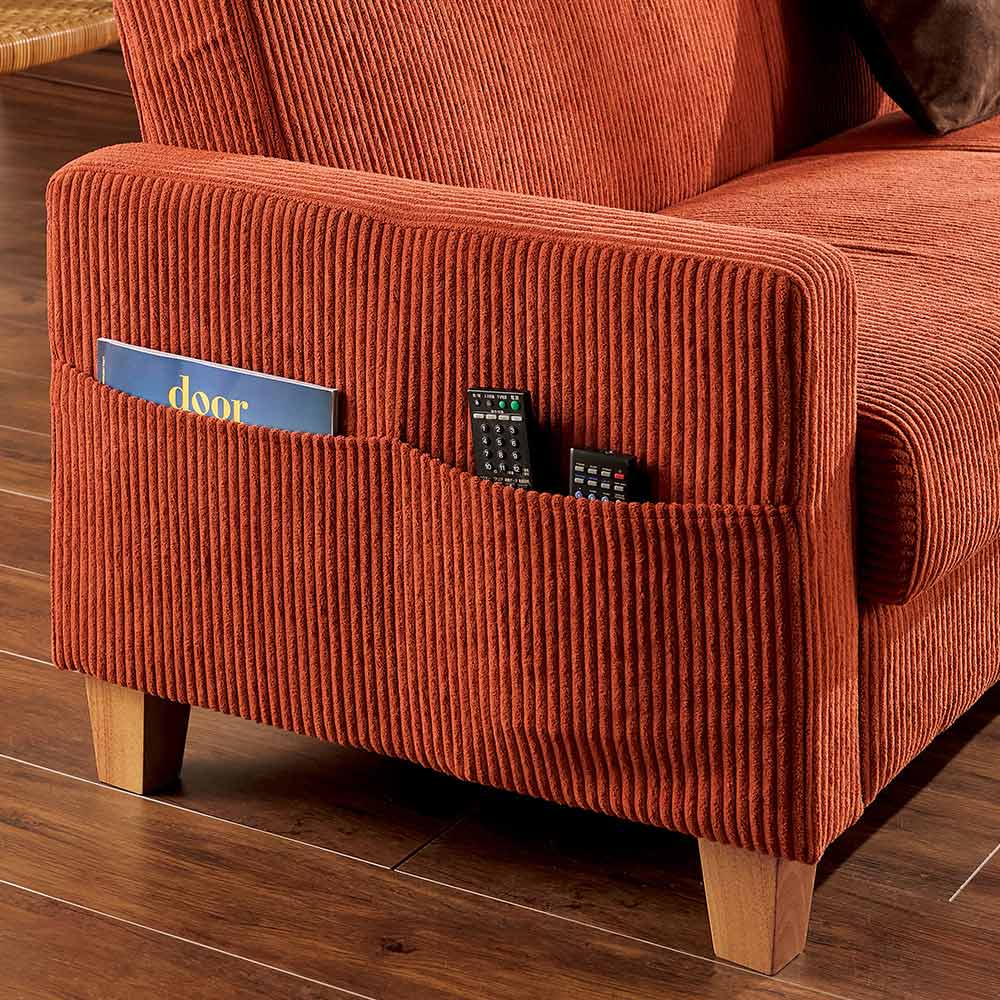 手元でさっと使いたいリモコンやメガネケース、新聞などを入れられるポケットを両サイドに配置。すぐ手に取れて便利です。