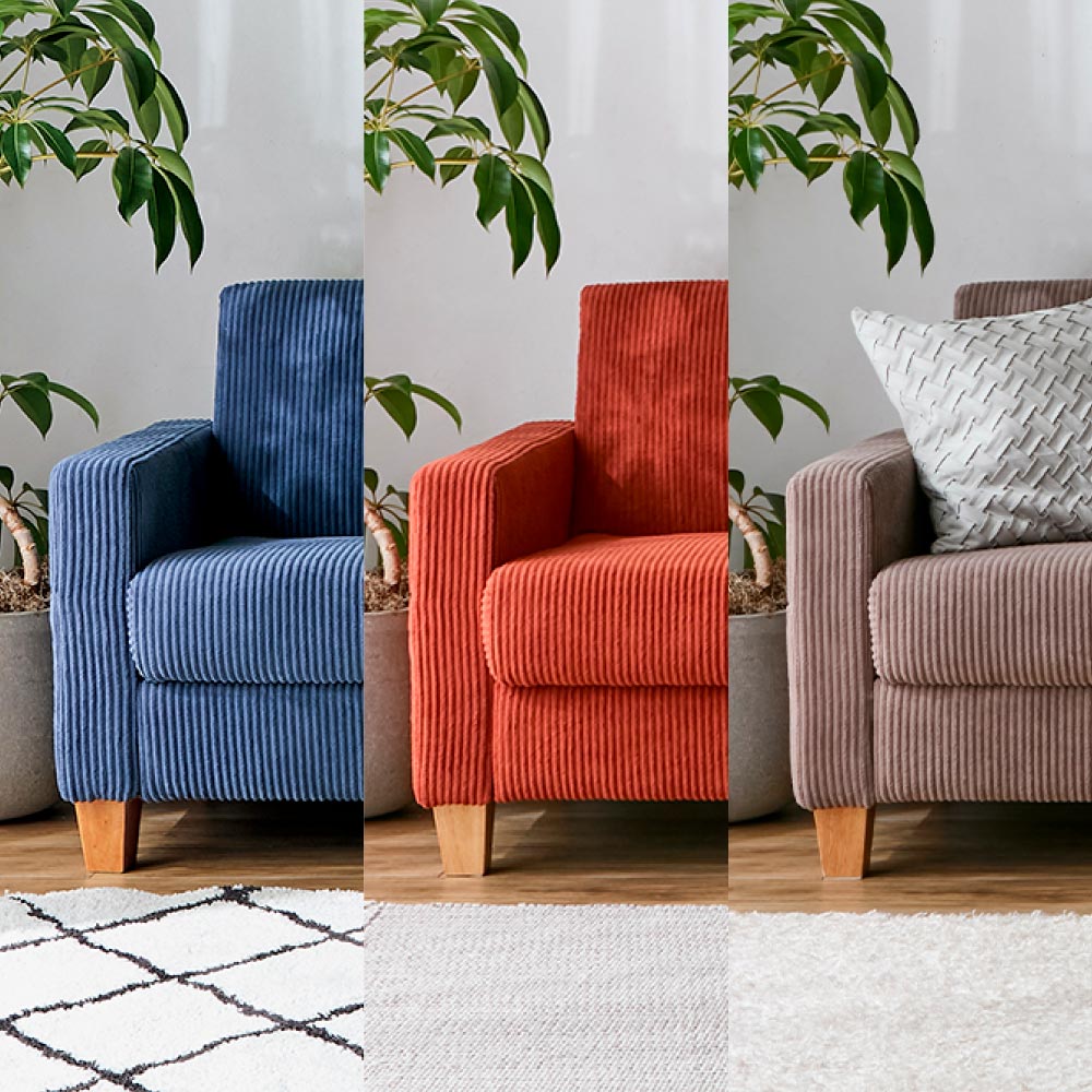 写真左から(ア)ブルー、(イ)ブラッドオレンジ、(ウ)チャコール お部屋に合わせて選べる3カラー。肌触りのいい、つい触りたくなる毛足の長いコーデュロイを使用しました。
