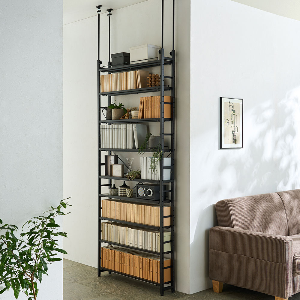 奥行17cmの薄型突っ張りラックが、可動棚板と頑丈仕様でさらに便利に!棚板の高さが簡単に変えられるので、スペースを無駄なく使って大量収納できます。棚板可動だから大量収納もディスプレイもおまかせ写真は幅80cmタイプ(イ)フレーム:ブラック / 棚板:ブラウン省スペースで大量収納が可能な突っ張り式ラック。棚板の高さを調節できるので、スペースをムダなく活用することができます。廊下に置いても邪魔にならない奥行17cm写真は幅80cmタイプ(イ)フレーム:ブラック / 棚板:ブラウン奥行17cmの薄型仕様。狭い場所やドアのある廊下に設置しても邪魔になりません。壁面を活かして圧迫感のないリビング収納を写真は幅100cmタイプ(ア)フレーム:アイボリー / 棚板:ナチュラル奥行17cmだから圧迫感がなく、コンパクトなリビングでもディスプレイ&収納が楽しめます。北欧テイストにもなじむカラーリング(ア)フレーム:アイボリー / 棚板:ナチュラル 写真左 : 幅80cm 写真右 : 幅100cm可動棚仕様のコンパクトブックシェルフシリーズは、幅は80cm、100cmの2タイプ。色はアイボリー(フレーム色)、ブラック(フレーム色)の2色があり、お部屋に合わせてお選びいただけます。(ア)アイボリー×ナチュラルは北欧調のお部屋にも馴染みます。異素材ミックスでブルックリンテイストにもマッチ(イ)フレーム:ブラック / 棚板:ブラウン 写真左 : 幅80cm 写真右 : 幅100cm(イ)ブラックのフレームとブラウンの棚板を組み合わせた配色は、人気のブルックリンテイストにもマッチ。見た目と機能を両立したスタイリッシュなお部屋が完成します。こぼれ止めとサイドガードが安心感をアップ物が落ちるのを防ぐこぼれ止めとサイドガード付き。こぼれ止めは前後どちらにも設定できます。棚板は設置も移動も工具不要でラクラク工具不要で簡単に設置できる可動棚。内側から取り外せるので、複数台並べて設置した後でも簡単に棚の位置を変えられます。1.支柱のスリットに棚受けを差し込む。2.前から棚板を差し込んで棚受けに乗せる。3.付属のネジで棚受けと棚板を固定する。棚板を補強し、総耐荷重約180kgを実現強度アップと反りやたわみを防止するために、棚板の裏側を2本のスチールバーで補強。全体で180kg、棚板1枚当たり20kgの耐荷重を可能にしました。薄型でも安心な天井突っ張り式4本の支柱で天井にしっかり突っ張る仕様。1本ずつ高さを変えられるので、梁や段差にも対応可能です。