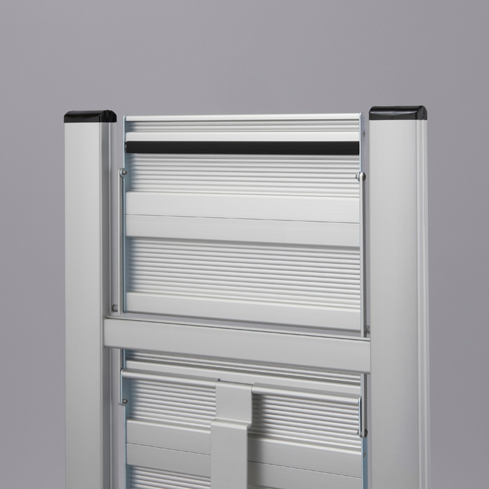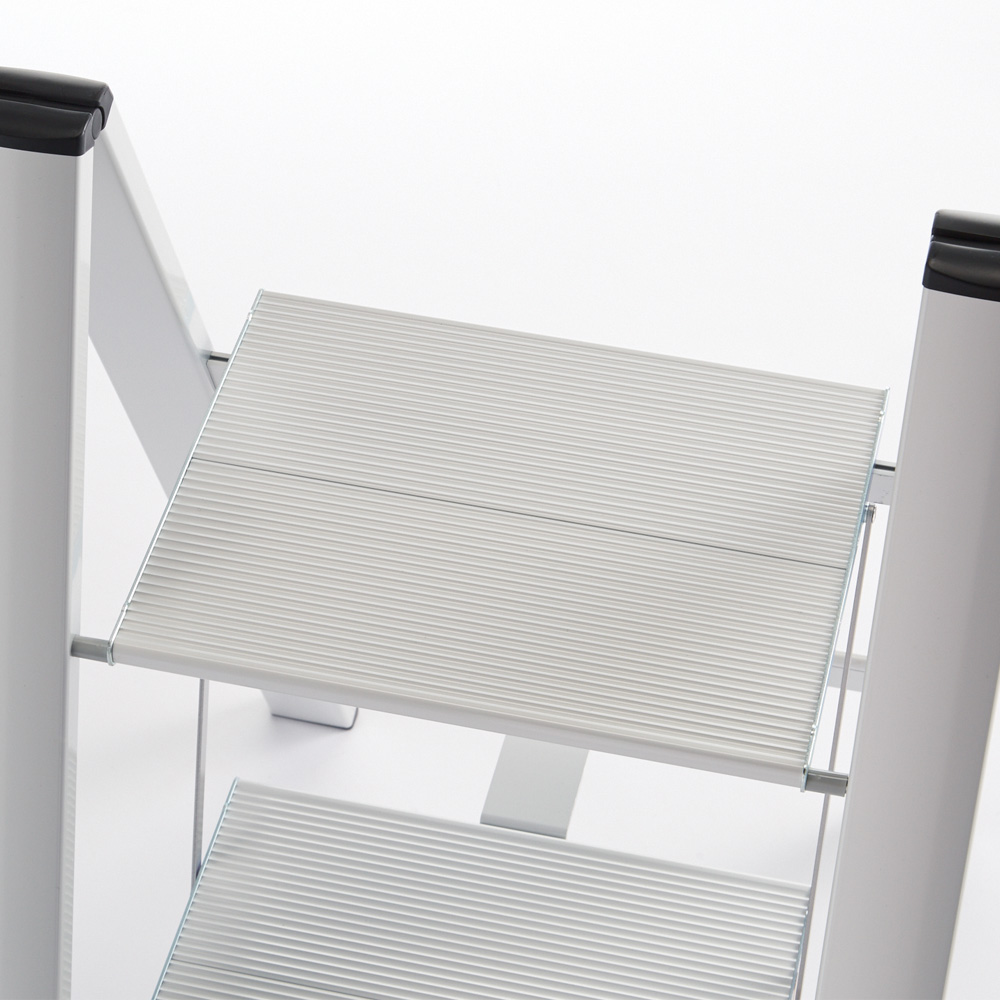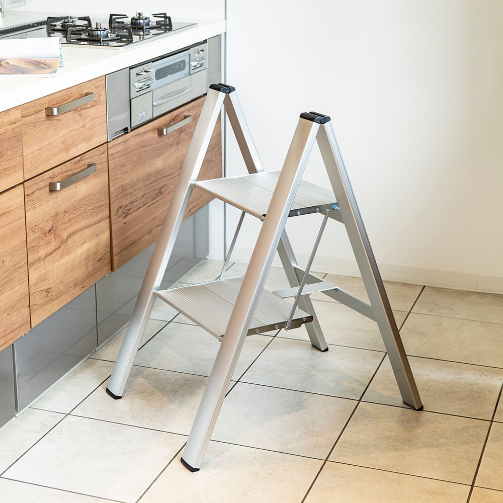 座れる脚立。限られたスペースを生かす工夫、使い勝手のよさを究めた仕様、さらに、インテリアとしてのデザイン性にこだわりました。座れる脚立。限られたスペースを生かす工夫、使い勝手のよさを究めた仕様、さらに、インテリアとしてのデザイン性にこだわりました。女性でもラクに持ち運べるアルミ製の軽量ステップ。広いステップと幅広の脚が安定感をサポート■グッドデザイン、ロングライフデザイン賞受賞。 ■折りたたみ時4.8cmの薄型なので、すき間に収納できます。■天板幅33.0cmの幅広タイプで安心の乗り心地、また腰を掛けての作業にも最適。【ここがポイント】●軽量なアルミ製ながら、安心の「SGマーク」を取得。●機能的でスマートなデザインのステップはインテリアにもなって活躍の場も広がります。●どのステップも広いステップ面(33×26cm)なので、安定していて足が疲れにくく、登った時の作業性が抜群です。●幅広のフレームがしっかりと支える耐久性のある踏み台です。●収納時は48mmのコンパクトな厚みなので、狭い隙間にもスッと入ります。●機能性や安全性を考慮し、スムーズな開閉や持ち運びに便利な形状です。●軽量でスリムなので、持ち運びもラクラク!●2010年度にグットデザイン賞の中でロングライデザイン賞を受賞。●長年愛されるスッキリとしたデザインです。