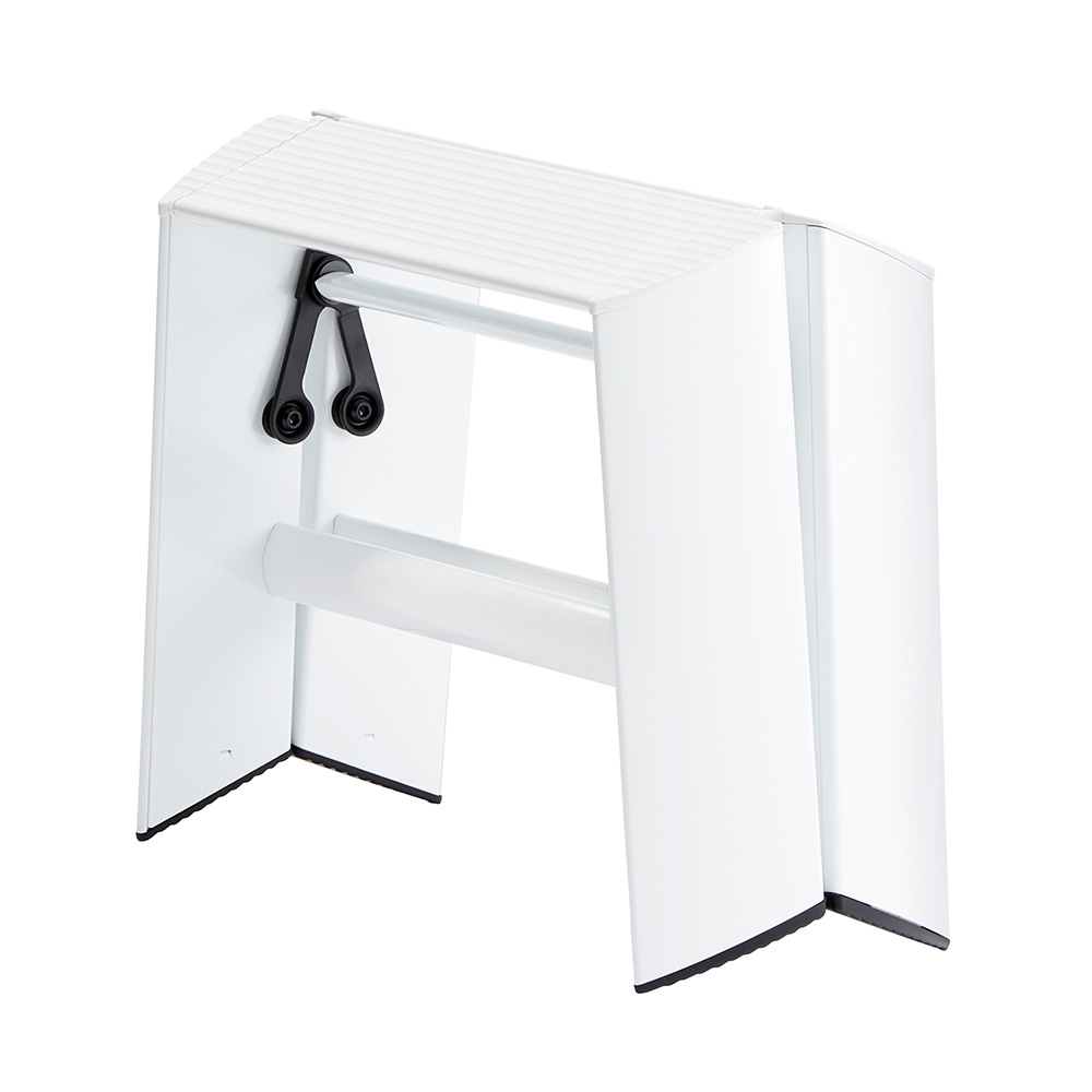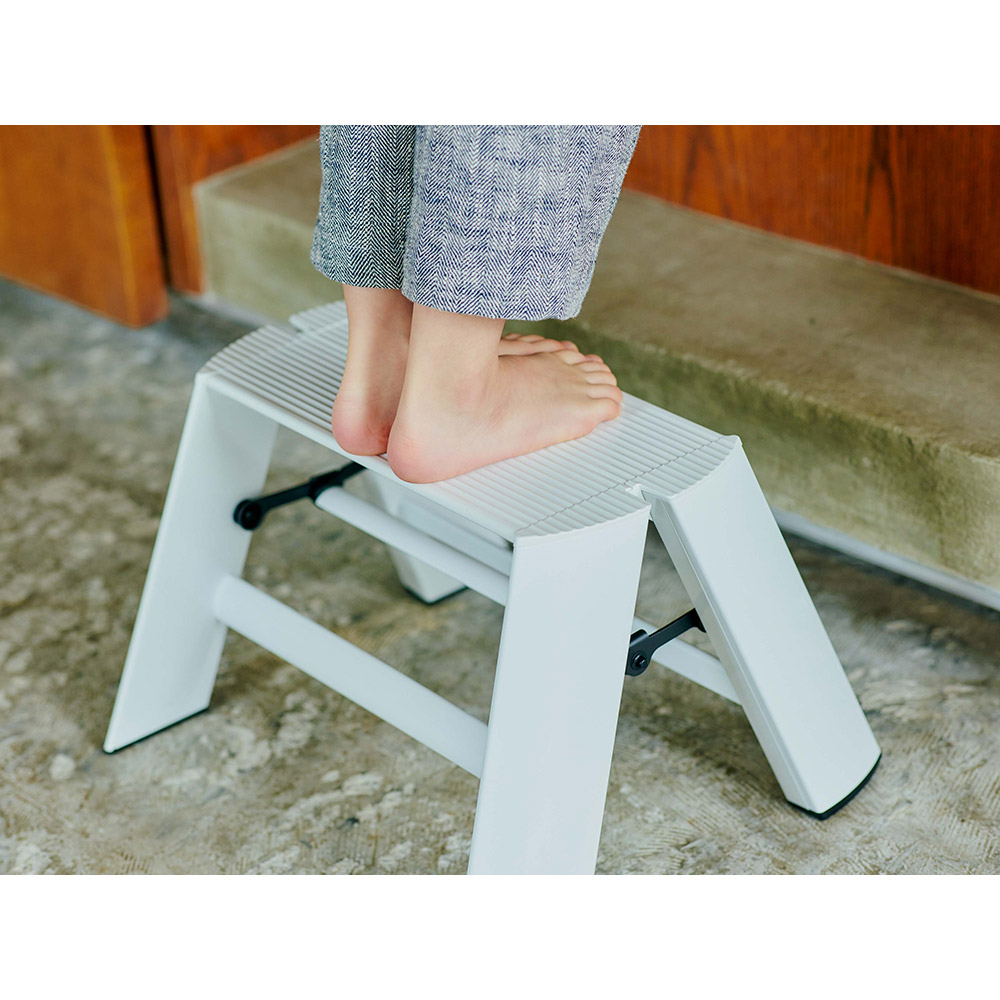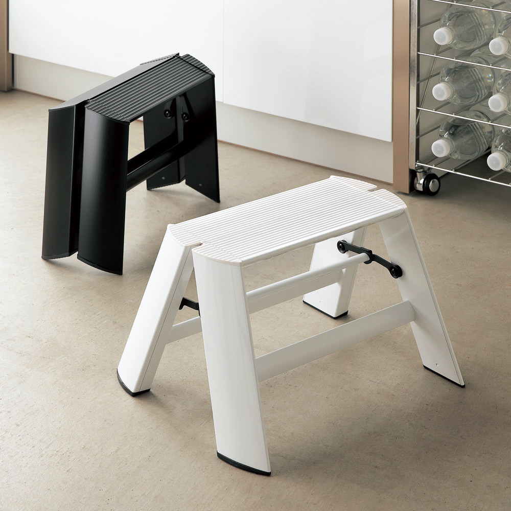 ちょっと手が届かない、そんな時に便利な踏み台。子どもの踏み台にもぴったりの1ステップ。キッチンや洗面所に手軽に持ち運べます。ちょっと手が届かない、そんな時に便利な踏み台。コンパクトながら耐荷重100kgでSGマーク付きだから安心です。1.7kgととっても軽量で片手でサッと畳めるから移動もラクラクです。世界に認められたデザイン ■IFデザインアワード、レッドドットデザインアワード、グッドデザイン賞を受賞。美しいフォルムと機能美で数々のデザイン賞を受賞しました。■外観からビスが見えないすっきりとしたデザイン。■使い方次第で、日々の暮らしがよりスマートに、よりスタイリッシュに。カタチだけではない、その先にある時間もデザインしました。■脚立の置き場所といえば押入れや物置が定番かもしれませんが、あえてお部屋に置いておきたくなる、美しいデザインの脚立です。■デザインは気鋭のデザインユニット「METAPHYS」が担当しました。安全性だけでなく使いやすさにもこだわりました ■表面にアルマイト加工を施す事により、見た目の質感に加えて高い耐久性や心地よい手ざわりを実現。(ホワイト・ブラック)■幅が広く、滑りにくい波型ステップ。■簡単・安心に取り扱えるワンタッチバー。■折りたたんだ状態でも自立可能。■製造は梯子・脚立の専門メーカー、創業60年の長谷川工業です。【メタフィス】METAPHYSとは、株式会社ハーズ実験デザイン研究所がデザイン開発、ブランディングを行っているデザインブランドで、ブランドコンセプトに共感を抱く多くのパートナー企業により構築されています。全ての商品のデザイン、プロデュースを、ハーズの代表であるムラタ・チアキが手がけ、それぞれの企業の持つコア・コンピタンスに基づいた商品開発を行っています。METAPHYSの語源は、「すべての存在の基本原理を追及する学問」を意味するMETAPHYSICSです。そのモノの存在意義、最もあるべき姿を1から考え直す作業を経て、一つ一つ再構築し、出来上がったものがMETAPHYSの商品です。メタフィスはこの思想を共用する企業や個人の協業でつくられたブランドです。それぞれの専門分野で、得意な商品を、共通思想によって造り出していきます。METAPHYSは、いくつもの企業が連携して、「モノのあり方」、「モノの創り方」、「モノの流れ」を本質へと導くデザイン事業なのです。
