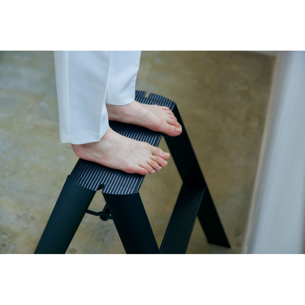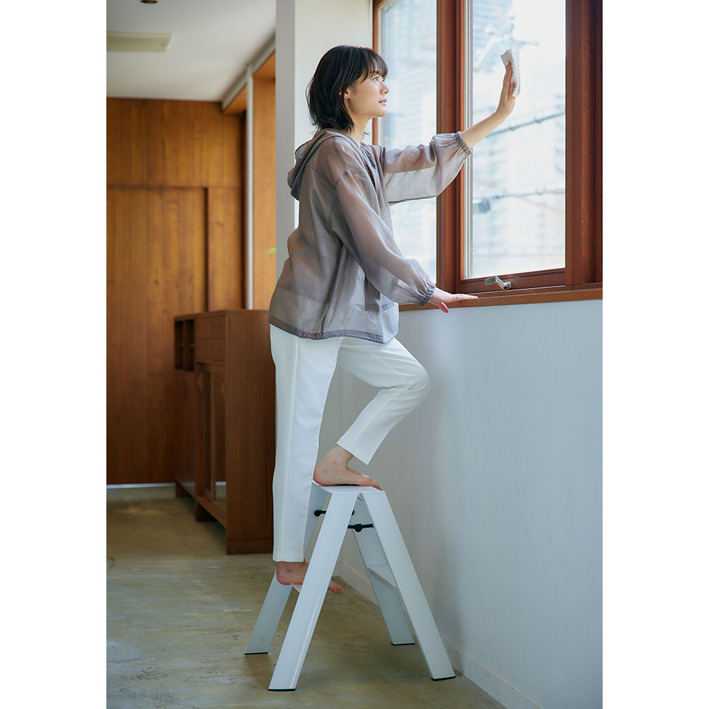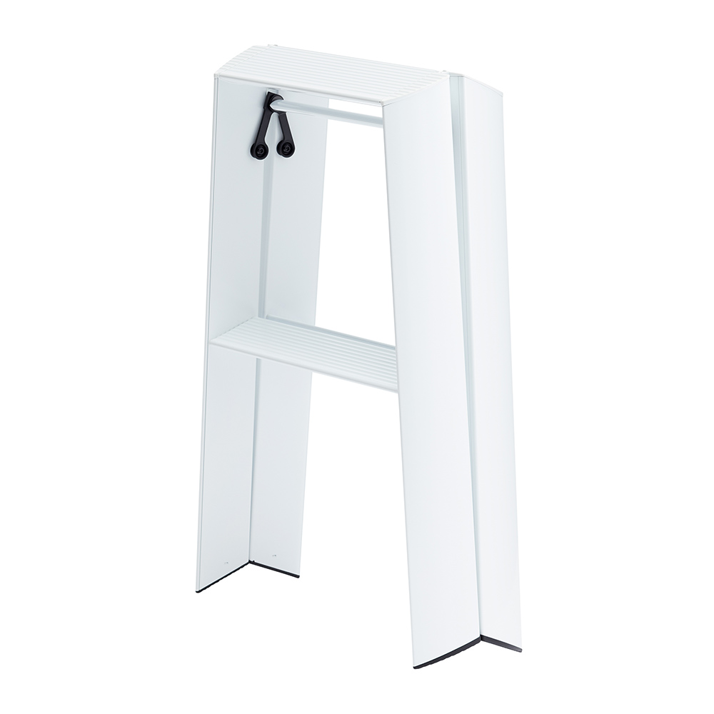 インテリアになるアルミ製脚立。Lucano(ルカーノ)は道具としての踏み台を少し進化させ、空間調和のためのディテールを考えデザインされた製品です。脚立としてはもちろん、スツールとしても使えて1台2役の2ステップ。外側からはビスひとつ見えない、美しい仕上げ。軽量だから使いたい場所への持ち運びラクラク。折りたたみ時は自立し、収納場所を選びません。ステップ上部は、安全性とデザイン面の両方から、滑りにくいなだらかな形状になっています。また、安全性品質の認定基準であるSGマークを取得。安定性やバランス、耐荷重などの品質に配慮しています。出しっぱなしでもさまになるので、ちょっとしたスツール代わりとしてもお使いいただけます。世界に認められたデザイン ■IFデザインアワード、レッドドットデザインアワード、グッドデザイン賞を受賞。美しいフォルムと機能美で数々のデザイン賞を受賞しました。■外観からビスが見えないすっきりとしたデザイン。■使い方次第で、日々の暮らしがよりスマートに、よりスタイリッシュに。カタチだけではない、その先にある時間もデザインしました。■脚立の置き場所といえば押入れや物置が定番かもしれませんが、あえてお部屋に置いておきたくなる、美しいデザインの脚立です。■デザインは気鋭のデザインユニット「METAPHYS」が担当しました。安全性だけでなく使いやすさにもこだわりました ■表面にアルマイト加工を施す事により、見た目の質感に加えて高い耐久性や心地よい手ざわりを実現。(ホワイト・ブラック)■幅が広く、滑りにくい波型ステップ。■簡単・安心に取り扱えるワンタッチバー。■折りたたんだ状態でも自立可能。■製造は梯子・脚立の専門メーカー、創業60年の長谷川工業です。【メタフィス】METAPHYSとは、株式会社ハーズ実験デザイン研究所がデザイン開発、ブランディングを行っているデザインブランドで、ブランドコンセプトに共感を抱く多くのパートナー企業により構築されています。全ての商品のデザイン、プロデュースを、ハーズの代表であるムラタ・チアキが手がけ、それぞれの企業の持つコア・コンピタンスに基づいた商品開発を行っています。METAPHYSの語源は、「すべての存在の基本原理を追及する学問」を意味するMETAPHYSICSです。そのモノの存在意義、最もあるべき姿を1から考え直す作業を経て、一つ一つ再構築し、出来上がったものがMETAPHYSの商品です。メタフィスはこの思想を共用する企業や個人の協業でつくられたブランドです。それぞれの専門分野で、得意な商品を、共通思想によって造り出していきます。METAPHYSは、いくつもの企業が連携して、「モノのあり方」、「モノの創り方」、「モノの流れ」を本質へと導くデザイン事業なのです。
