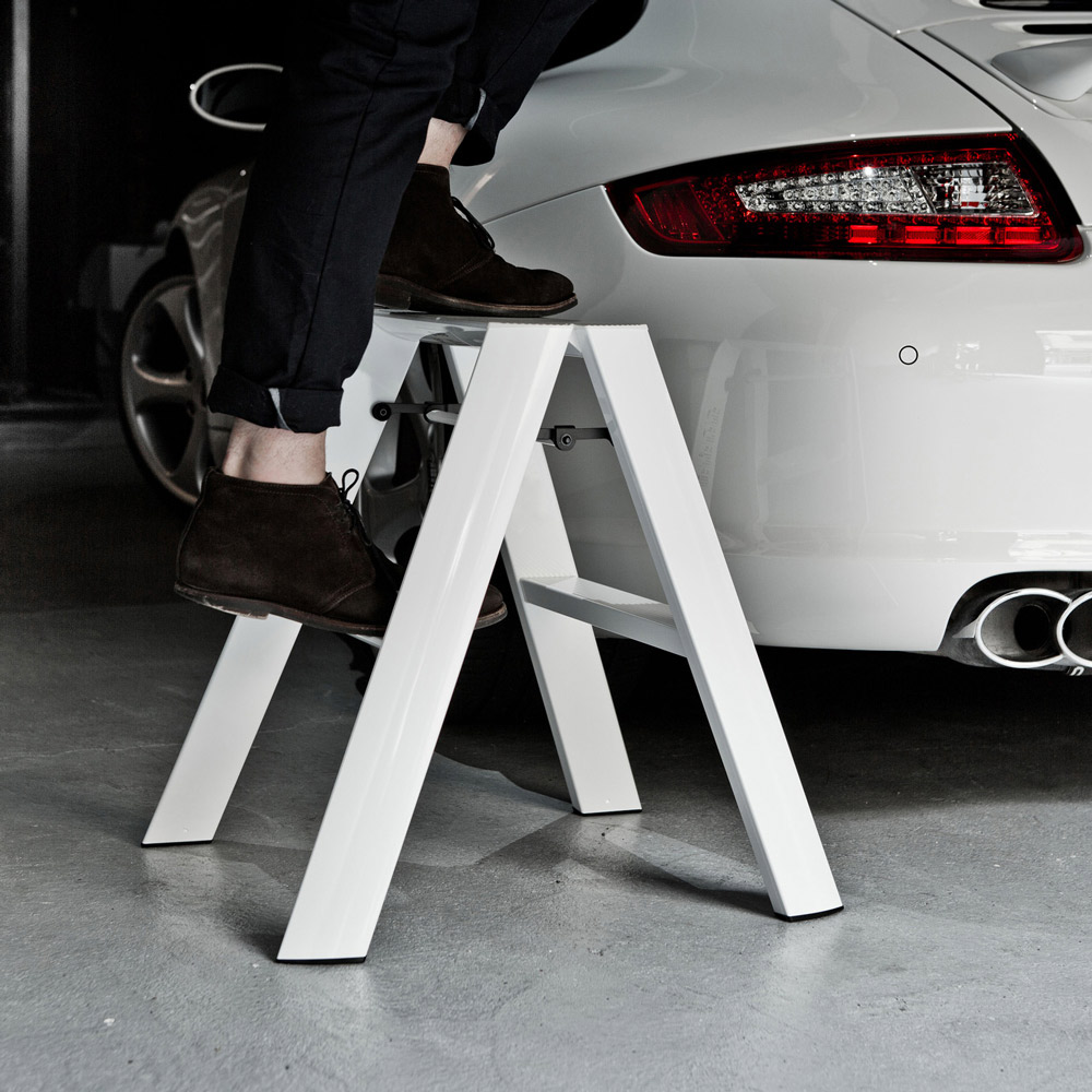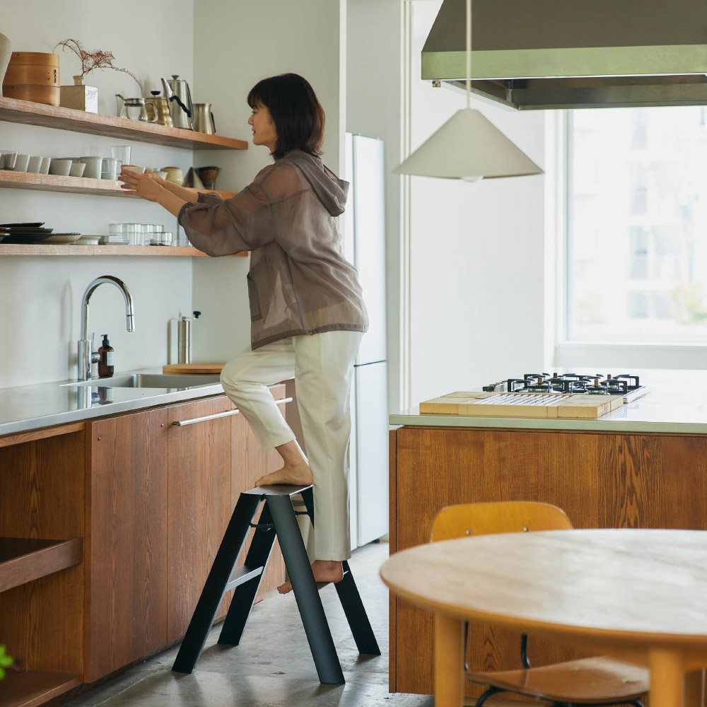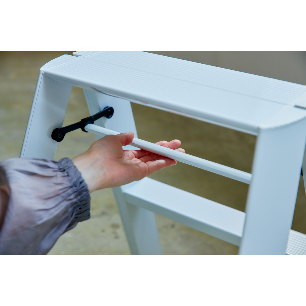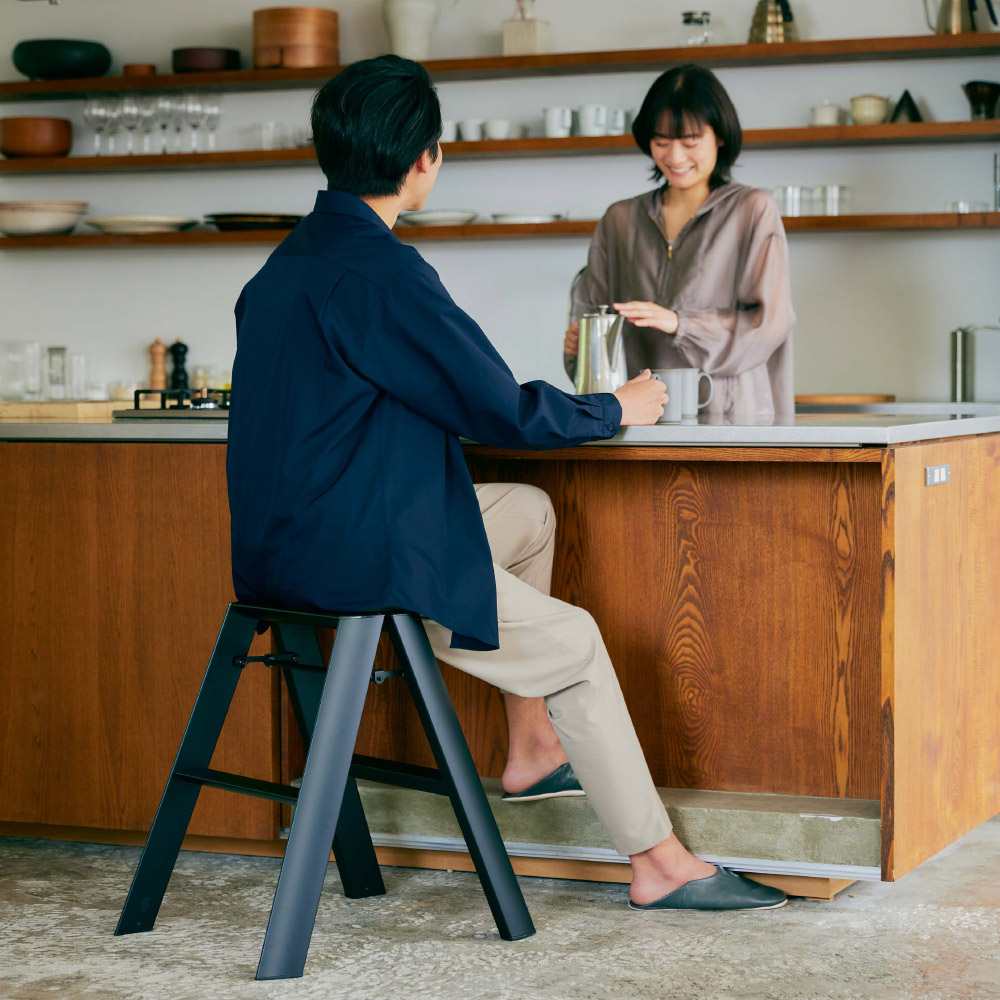 インテリアになるアルミ製脚立。Lucano(ルカーノ)は道具としての踏み台を少し進化させ、空間調和のためのディテールを考えデザインされた製品です。脚立としてはもちろん、スツールとしても使えて1台2役の2ステップ。外側からはビスひとつ見えない、美しい仕上げ。軽量だから使いたい場所への持ち運びラクラク。折りたたみ時は自立し、収納場所を選びません。ステップ上部は、安全性とデザイン面の両方から、滑りにくいなだらかな形状になっています。また、安全性品質の認定基準であるSGマークを取得。安定性やバランス、耐荷重などの品質に配慮しています。出しっぱなしでもさまになるので、ちょっとしたスツール代わりとしてもお使いいただけます。世界に認められたデザイン ■IFデザインアワード、レッドドットデザインアワード、グッドデザイン賞を受賞。美しいフォルムと機能美で数々のデザイン賞を受賞しました。■外観からビスが見えないすっきりとしたデザイン。■使い方次第で、日々の暮らしがよりスマートに、よりスタイリッシュに。カタチだけではない、その先にある時間もデザインしました。■脚立の置き場所といえば押入れや物置が定番かもしれませんが、あえてお部屋に置いておきたくなる、美しいデザインの脚立です。■デザインは気鋭のデザインユニット「METAPHYS」が担当しました。安全性だけでなく使いやすさにもこだわりました ■表面にアルマイト加工を施す事により、見た目の質感に加えて高い耐久性や心地よい手ざわりを実現。(ホワイト・ブラック)■幅が広く、滑りにくい波型ステップ。■簡単・安心に取り扱えるワンタッチバー。■折りたたんだ状態でも自立可能。■製造は梯子・脚立の専門メーカー、創業60年の長谷川工業です。【メタフィス】METAPHYSとは、株式会社ハーズ実験デザイン研究所がデザイン開発、ブランディングを行っているデザインブランドで、ブランドコンセプトに共感を抱く多くのパートナー企業により構築されています。全ての商品のデザイン、プロデュースを、ハーズの代表であるムラタ・チアキが手がけ、それぞれの企業の持つコア・コンピタンスに基づいた商品開発を行っています。METAPHYSの語源は、「すべての存在の基本原理を追及する学問」を意味するMETAPHYSICSです。そのモノの存在意義、最もあるべき姿を1から考え直す作業を経て、一つ一つ再構築し、出来上がったものがMETAPHYSの商品です。メタフィスはこの思想を共用する企業や個人の協業でつくられたブランドです。それぞれの専門分野で、得意な商品を、共通思想によって造り出していきます。METAPHYSは、いくつもの企業が連携して、「モノのあり方」、「モノの創り方」、「モノの流れ」を本質へと導くデザイン事業なのです。