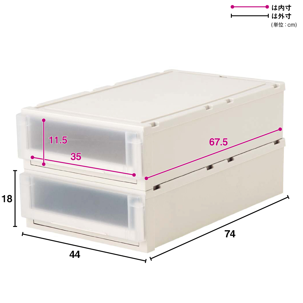 頑丈仕様のフィッツでクローゼットを使いやすく、収納力をアップ!収納スペースを無駄なく活用できます。引き出しはスムーズ開閉できるフィッツならではの仕様。奥行74cmの人気の押入れ対応サイズ2個組。引き出しがスムーズ、使いやすさにこだわった衣類収納ケース●ワンランク上の仕様・ワンランク上の使いやすさが自慢のフィッツケース。●安いプラスチックケースを買ったけど使いにくかったという方におすすめです。●長く使うことを考えたユニット収納ケースです。●洋服やタオルなどサイズに合わせて、3種類の高さがお選びいただけます。たっぷりの奥行で季節の衣替えにも、毎日の衣類収納にも使えます●ウォークインクローゼットに積み上げて使えば大量収納が可能です。●クローゼットや押し入れのすき間にも収まるサイズ展開です。●設置場所に合わせて、組み合わせるアイデア収納も可能です。フィッツならではの機能と頑丈性があります。【1】天板に「内蔵したアルミ補強板」がたわみやゆがみを防ぎます。【2】ケース上部に前倒れ防止機能付き。引き出しを大きく開けても転倒しません。【3】底にはフローリングを傷つけないゴム脚付きです。【4】引き出し底部の特殊機構により、たくさん収納してもスムーズに開閉ができます。●樹脂ケースはかさばるため、お店で買うと持って帰るのが大変です。●通販で購入していただければ、ご自宅までお届けしますので便利です。〜掃除や移動時に便利な専用キャスター対応〜別売りで専用キャスターをご用意しております。