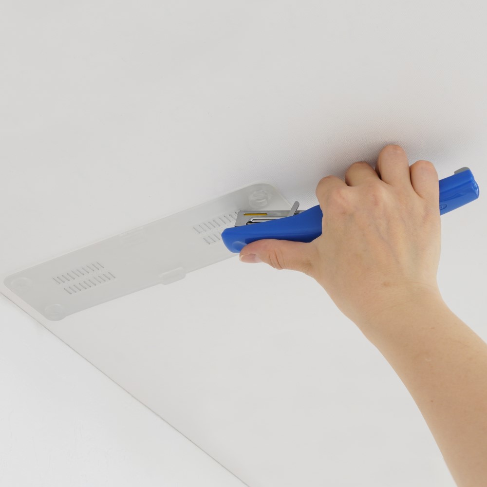 石膏ボード天井の場合は、クリアパネルをホチキスで止めることも可能です。(固定しなくても使用可能)