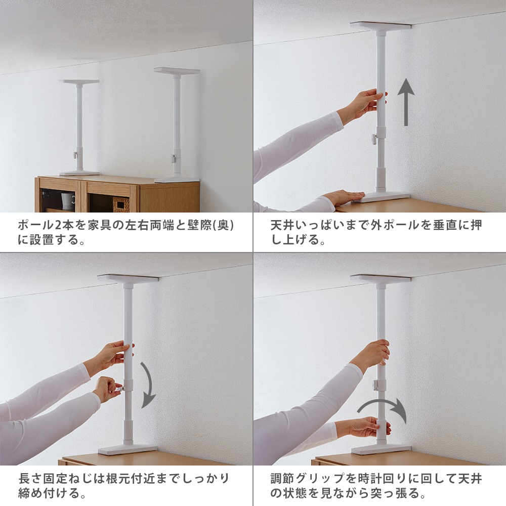 工具不要で簡単に取り付けられる耐震ポール。震災時の家具の転倒を予防。暮らしになじむシンプルなデザインで、インテリア性を損なうことなく設置できます。〜万が一の時に安心を!転倒防止用の防災用品〜 ◆家具を固定して、震災に備える耐震ポールです。◆耐圧は約200kgです。(公的機関による圧縮試験結果による)◆工具やネジ・クギも不要。簡単に取付けられるつっぱり棒タイプ。◆長さ固定ねじ先端部の溝を改良し、従来よりねじ穴を開ける力が軽くなりました。◆賃貸でも天井や家具を傷つけずに設置できます。※設置時に、クリアパネルを天井に固定すると、より安定感が増します。※石膏ボード天井の場合は、クリアパネルをホチキスで止めることも可能です。(固定しなくても使用可能)〜普段も見えるものだから、インテリア性にこだわりました〜 ◆お気に入りの家具やインテリアにもなじみやすい、シンプルなデザインです。◆つや消しのホワイト・ブラックをご用意。◆マットカラーで、落ち着きがありお部屋の雰囲気にも溶け込みやすいので、耐震ポールの設置に抵抗があった方にもおすすめです。