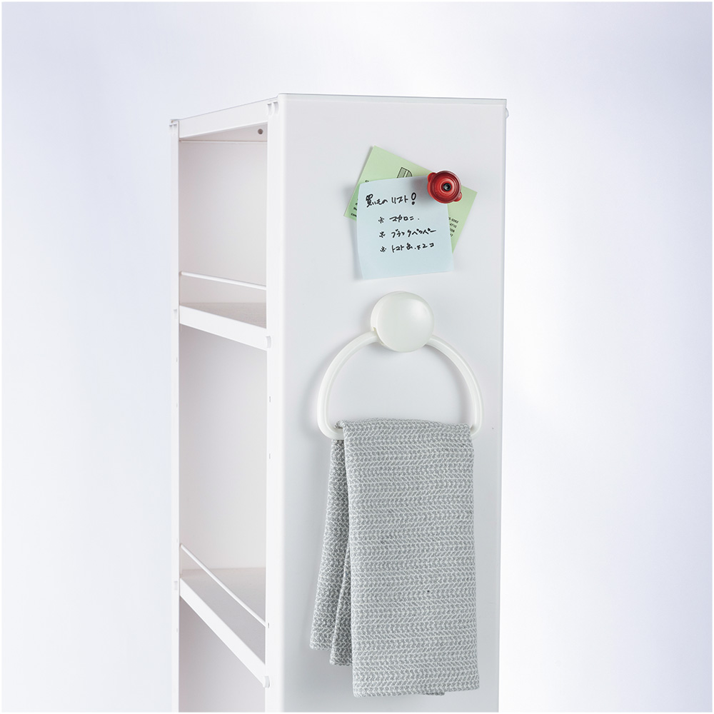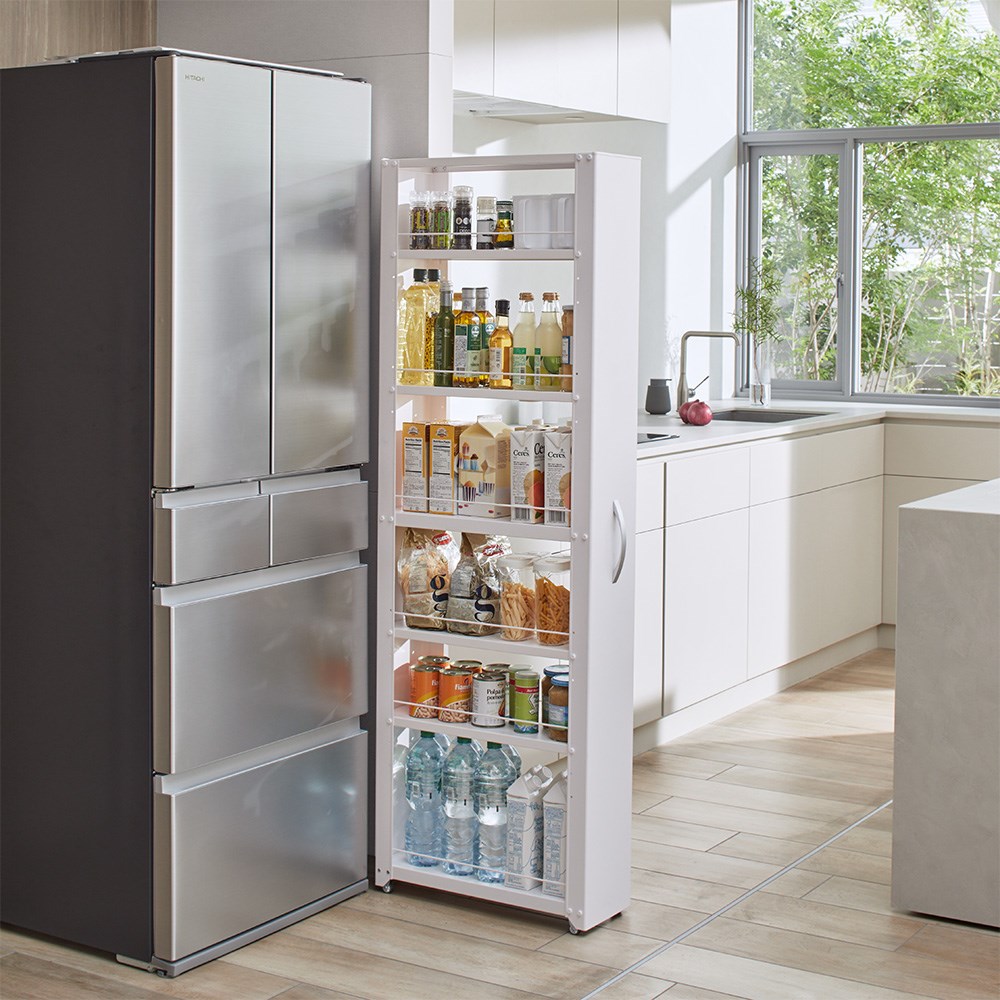 スリムなすき間に収まるスチール製キッチンワゴンに、物置レベルの頑丈さを実現!背板がないオープン仕様で両側から出し入れでき、キッチンのわずかなスペースに重いボトルやストック類を心おきなくたっぷり収納できます。物置メーカーのノウハウが詰まった安心のつくり●棚板1枚当たり約8kgの耐荷重を誇るキッチンワゴンです。●スリムなのに頑丈!さらに使い勝手のよさが自慢。「華奢なストッカーは強度が心配」とお考えの方におすすめです。●本体は丈夫で耐久性に優れたスチール製。水や汚れ、熱にも強くお手入れが簡単です。●総耐荷重はなんと約50kg(耐荷重試験では約160kgをクリア※)。スチールの扱いに精通している日本の物置メーカーが細部にまでこだわり、重い物をぎっしり詰め込んでもビクともしない安心設計を実現しました。※耐荷重50kgの3倍以上にあたる約160kgのおもりを乗せて耐荷重試験を行い、異常なしと認められました。幅が選べて、随所に使いやすい工夫が満載●幅は10cm、15cm、20cmの3タイプから選べ、どの家のキッチンにもある半端なすき間が、収納スペースに生まれ変わります。・幅10cmタイプはこまごました調味料の整理整頓にも便利。細長い瓶や小さなストックを見やすく管理できます。・幅15cmは大きめの調味料ボトルや食品ストッカーとして活躍。ラップやふきん・タオルなどのキッチンアイテムの収納にも便利です。・幅20cmタイプは2リットルのペットボトルを1列に収納できるサイズ。頑丈仕様だから、置き場に悩むお米の袋も気兼ねなく置けます。●キャスター&取っ手付きだからキッチンのすき間からサッと引き出すだけ。普段はすき間に隠せるため、生活感を見せずにスマートに収納できます。●すき間から引き出した際の転倒を防ぐチェーン付きで安心です。●棚の左右から取り出せるオープン仕様なので、収納物が見やすく整理できます。●奥に入れた食器や食品なども出し入れしやすいので、使い忘れを防げます。●奥行は全タイプ58cmです。高さは2タイプから選べます●高さ85.4cmのロータイプと高さ165.4cmのハイタイプをご用意。●ロータイプはキッチンカウンター横で、ハイタイプは冷蔵庫と並べて使いやすい高さです。【ロータイプの特長】・左右どちら側からでも出し入れしやすいつくりです。・調味料ボトルやストック類が見やすく整理できます。・最上段によく使う調味料を置けばすぐ手に取れて、料理の時短にも♪・可動棚は収納物に合わせて5cm間隔で高さ調節でき、棚板には物の落下を防ぐこぼれ止めバー付き。【ハイタイプの特長】・左右どちら側からでも出し入れしやすいつくりです。・高さを活かして調味料ボトルやストック類がたっぷり収納できます。・可動棚は収納物に合わせて5cm間隔で高さ調節でき(中央の1枚は固定棚)、棚板には物の落下を防ぐこぼれ止めバー付き。・キャスター付きで安定感のある設計。重い物をぎっしり載せたまま、スムーズに引き出せます。※このページでご購入できるのは幅20cmハイタイプです。 マグネットが付くのはスチール製ならでは●キッチン周りのちょっとしたメモなどをマグネットで固定できます。●キッチンタオルやラップホルダーなどマグネット式の便利グッズを付ければ空間を有効活用できます。キッチン以外でも活躍する使い勝手の良さ●色は清潔感のある(ア)ホワイトと、シックな印象の(イ)ブラックをご用意しました。●キッチンだけでなく、サニタリーで洗剤やシャンプー類、洗濯用品を収納するのにも便利です。●新築やリフォーム、模様替えの時にもおすすめの逸品です。