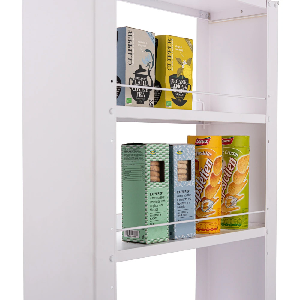 (ア)ホワイト 棚板1枚当たり約8kgの耐荷重。総耐荷重は約50kg。キッチンのわずかなスペースに、重いボトルやストック類を心おきなくたっぷり収納できます。