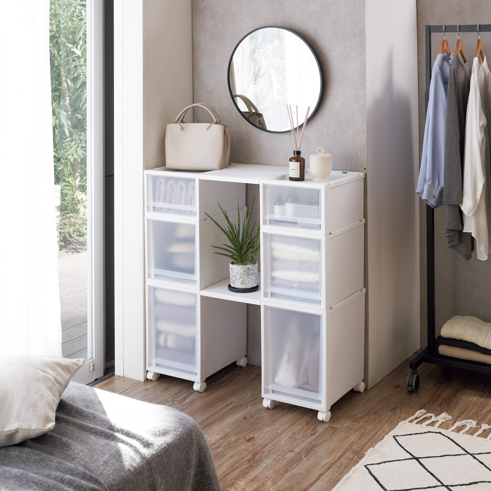 【組み合せ例】寝室やワンルームなどの収納スペースとしても。 ※写真は別売りの連結棚と専用差込キャスターを使用しています。