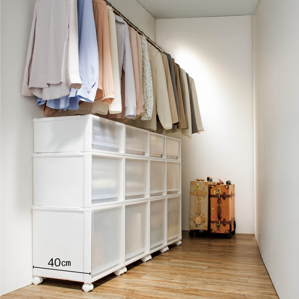 【組み合せ例】廊下に置いても圧迫感のない奥行40cm。 ※写真は別売りのフィッツケース本体に、キャスターを使用しています。