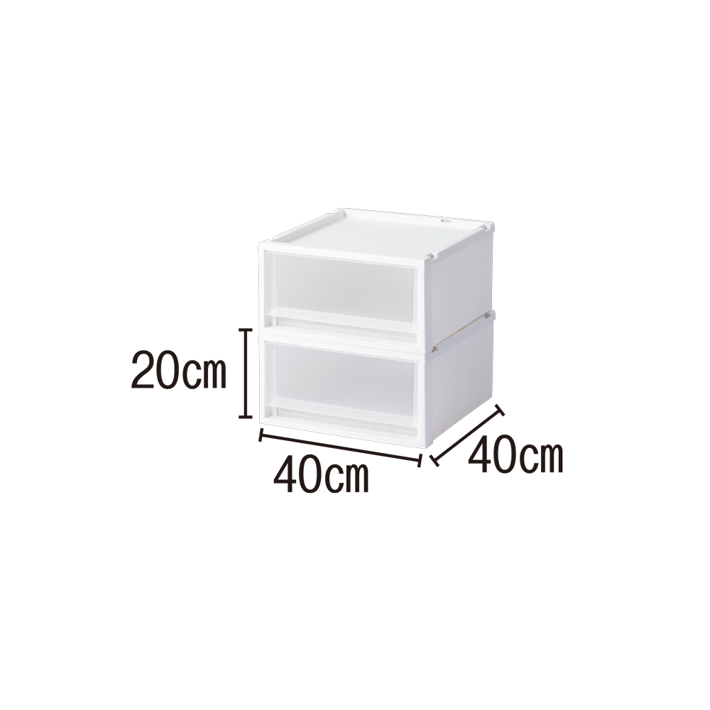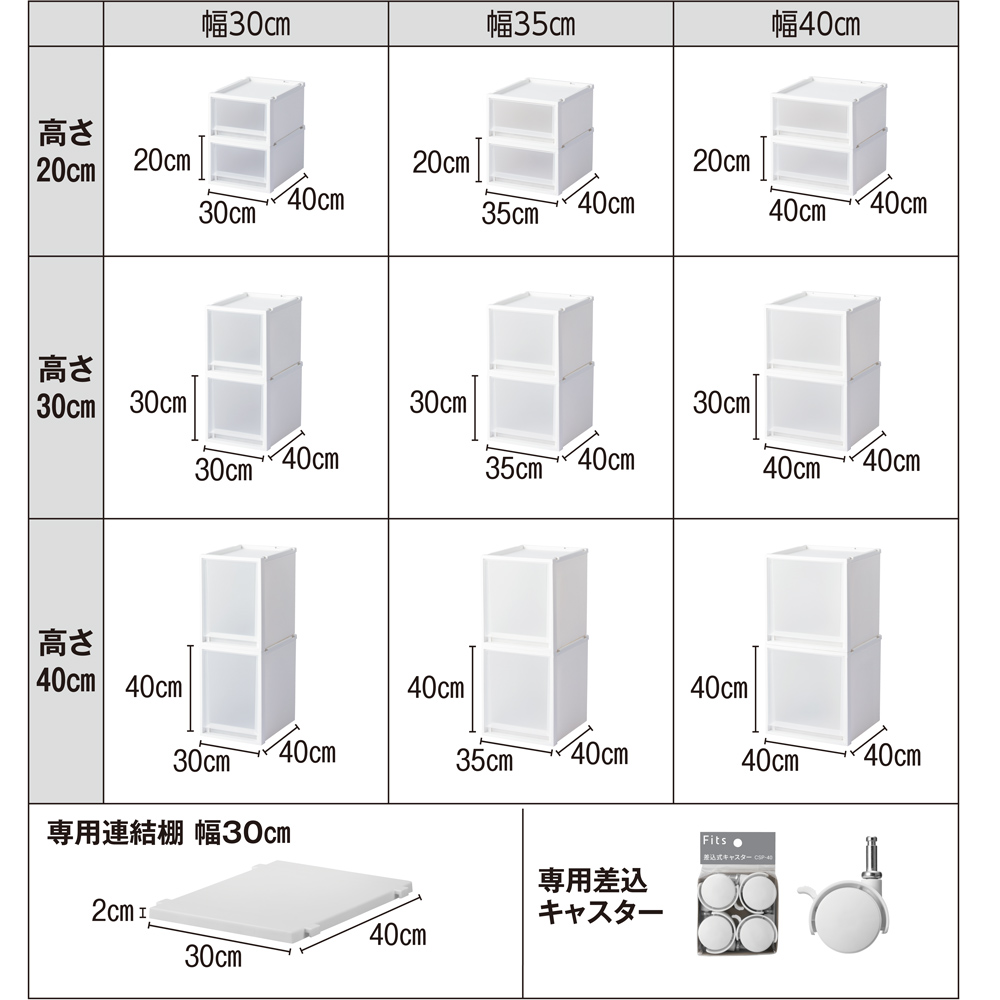 収納の定番アイテムとして人気の天馬フィッツシリーズに、奥行40cmのFits FC40が登場!置き場所を選ばない絶妙なサイズ感で、クローゼットや押し入れ以外の空間でも、すっきりと統一感のある収納を叶えます。どこに置く? 何を入れる? 使い勝手のよい奥行40cmで、収納をもっと自由に、もっと楽しく。廊下にも収納空間が作れる奥行40cm圧迫感のない奥行40cmなので、ちょっとした空きスペースや廊下も収納空間に活かすことができ、お部屋がすっきりかたづきます。2個組でお届けします。スペースと収納したいものに合わせて組み合わせできます幅・高さが3種類から選べるので多様なシーンに対応します。お好みのサイズをお選びください。家の中のあらゆる場所で、さまざまなモノの収納に!●押し入れ・クローゼット・寝室などで:衣類収納に●キッチンで:キッチンツールや食品のストックにも●リビングで:さまざまな生活用品や防災用品などの収納に●ランドリーで:ハンガーなどの洗濯用品やタオルの収納に●玄関で:キャンプ用品、子どものスポーツ用品、シューズケアグッズに●子ども部屋で:衣類やおもちゃなど、おかたづけ習慣のファーストステップにも奥行浅めの40cmだから、取り扱いがラクラク奥行浅めの分、衣類を入れても従来の奥行サイズより取り扱いしやすい重さなので、女性やご年配の方にもおすすめです。また、衣替えの季節や模様替えの際など、ケースの配置替えも手軽にできます。洗練された収納空間でお部屋をイメージアップ機能的にすぐれた収納ツールでありながら、インテリア性にも秀でたところが魅力。凹凸の少ないシンプルデザインに、前面は高級感のある半透明のすりガラス調を採用しました。うっすら透けて見えるため、収納物も一目瞭然です。便利な連結棚でさらに充実空間に合わせて別売りの専用連結棚を使えば、収納量がさらにアップ。隙間のデッドスペースを活用できて、小物のディスプレイも楽しめます。さりげなくロゴ入り前枠上部に「Fits」のロゴを印字。買い足しをする際、どんな収納ケースを購入したか把握できます。使いやすさと強さのための工夫●アルミ補強板内蔵天板のたわみを防ぐために、アルミ補強板を内蔵。積み重ねても下段が変形しにくく、引き出しやすくなりました。●前倒れ防止機能付き引出しを引いた時に、後部が浮き上がり前に倒れてしまうことを防ぎます。●滑りにくいゴム脚付きゴム脚が付くことで滑りにくく、引き出しやすくなります。最下段にお使いください。●キャスター対応掃除や模様替えの際の移動に便利な差込式キャスターも別売りでご用意。キャスター使用時は高さが約5cmアップします。