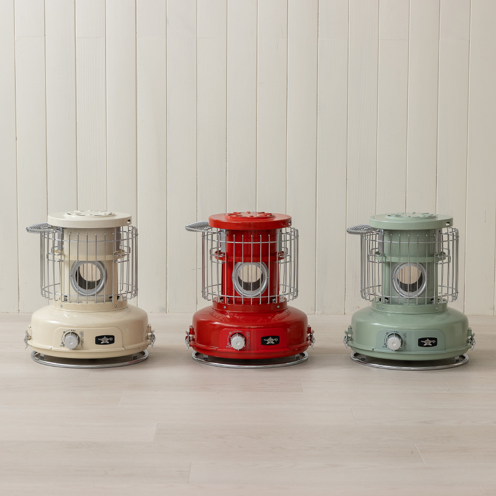 「ブルーフレーム」をモチーフにデザインされた、カセットボンベ式のコンパクトなガスストーブです。 左から (イ)グリーン (ウ)ホワイト