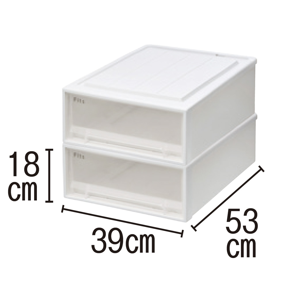 シリーズ累計販売数1億個を突破!フィッツケースには、選びたくなる、リピート買いしたくなる理由があります。豊富なサイズ展開と自在な組み合わせ方で、家中の空間にすっきりとフィット。手こずっていた収納も、フィッツケースがあれば楽しみに変わります。さまざまな空間にフィットする収納の定番衣装ケースの代名詞として長年愛される収納の定番「フィッツ」。dinosなら店頭から持ち帰る大変な手間は不要!欲しいサイズがすぐに見つかり、2個組で家まで届きます。引っ越しや模様替えの際に、1人でも手軽に組み直しできるフレキシビリティも魅力。ラクして便利な収納体験、フィッツケースで始めませんか。スペースと収納したいものに合わせて組み合わせできますクローゼットタイプ(奥行53cm)は9サイズ、押し入れタイプ(奥行74cm)は7サイズ、奥行47cmと45cmも各1サイズあり、多様なシーンに対応します。お好みのサイズをお選びください。【クローゼットタイプ】奥行53cmで、クローゼットにぴったり。ハンガー下の空きスペースを、たたんだ衣類の収納に有効活用できます。深すぎず、出し入れしやすい奥行で衣類や小物をスッキリ整理。【押し入れタイプ】奥行74cmで、押し入れの深さを活かせる大容量。奥行たっぷりだからかさばる厚手の服や、シーツや寝具カバーなどの収納にも大活躍。押し入れにそのまましまうと行方不明になりがちな小物類も、まとめて収納できて便利です。家の中のあらゆる場所で、さまざまなモノの収納に!●押し入れ・クローゼット・寝室などで:衣類収納に●キッチンで:キッチンツールや食品のストックにも●リビングで:さまざまな生活用品や防災用品などの収納に●ランドリーで:ハンガーなどの洗濯用品やタオルの収納に●玄関で:キャンプ用品、子どものスポーツ用品、シューズケアグッズに●子ども部屋で:衣類やおもちゃなど、おかたづけ習慣のファーストステップにも洗練された収納空間でお部屋をイメージアップ機能的にすぐれた収納ツールでありながら、インテリア性にも秀でたところが魅力。凹凸の少ないシンプルデザインに、前面は高級感のある半透明のすりガラス調を採用しました。うっすら透けて見えるため、収納物も一目瞭然です。さりげなくロゴ入り前枠上部に「Fits」のロゴを印字。買い足しをする際、どんな収納ケースを購入したか把握できます。使いやすさと強さのための安心構造●スタッキングOKレールと溝がしっかりかみ合う構造により、重ねたときのぐらつきや滑りがありません。●丈夫な前枠付きたくさん収納してもたわみにくく、ケースを積み重ねたときに上段の重みで下段が引き出せないストレスも解消されます。●引き出しの飛び出しを防止クローゼットタイプ幅44cmは引き出しの飛び出しを防ぐ「引き出しロック機能」付きです。●キャスター対応掃除や模様替えの際の移動に便利なネジ式キャスター(幅39cm奥行74cmタイプ以外の押し入れタイプに対応)と差込式キャスター(クローゼットタイプとフィッツケースマルチに対応)も別売りでご用意。キャスター使用時は高さが約5cmアップします。サステナビリティへの取り組み本体素材のポロプロピレンには再生材を10%以上使用しています。シリーズ商品のご案内フィッツケースは以下のシリーズ商品がございます。※このページはクローゼットタイプ奥行53cmの販売ページです。・クローゼットタイプ奥行53cm・押し入れタイプ奥行74cm・サイズいろいろ奥行47cm・45cm・フィッツケースマルチ奥行40cm