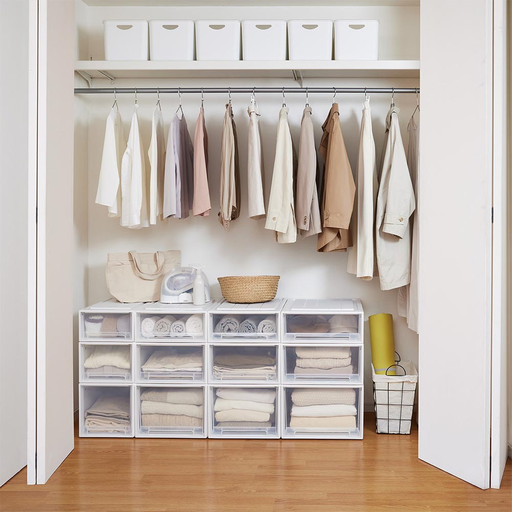 【組み合せ例】奥行53cmタイプはクローゼット収納に最適なサイズ。奥行が深すぎず、衣類や小物をスッキリ整理できます。