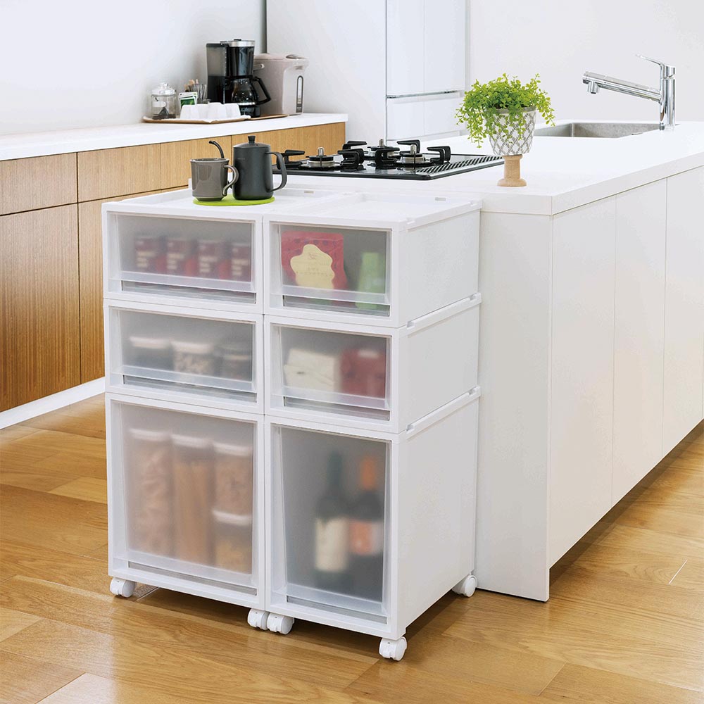 9タイプの豊富なサイズ展開で、自由に組み合わせても高さが揃いやすい設計。奥行40cmのフィッツケースマルチは置き場所を選ばない絶妙なサイズ感で、クローゼットや押し入れ以外の空間でも、すっきりと統一感のある収納を叶えます。どこに置く? 何を入れる? 使い勝手のよい奥行40cmで、収納をもっと自由に、もっと楽しく。さまざまな空間にフィットする奥行40cm圧迫感のない奥行40cmなので、ちょっとした空きスペースや廊下も収納空間に活かすことができ、お部屋がすっきりかたづきます。引っ越しや模様替えの際に、1人でも手軽に組み直しできるフレキシビリティも魅力。dinosなら店頭から持ち帰る手間いらずで欲しいサイズがすぐに見つかり、2個組で家まで届きます。スペースと収納したいものに合わせて組み合わせできます幅・高さが3種類から選べるので多様なシーンに対応します。お好みのサイズをお選びください。家の中のあらゆる場所で、さまざまなモノの収納に!●押し入れ・クローゼット・寝室などで:衣類収納に●キッチンで:キッチンツールや食品のストックにも●リビングで:さまざまな生活用品や防災用品などの収納に●ランドリーで:ハンガーなどの洗濯用品やタオルの収納に●玄関で:キャンプ用品、子どものスポーツ用品、シューズケアグッズに●子ども部屋で:衣類やおもちゃなど、おかたづけ習慣のファーストステップにも奥行浅めの40cmだから、取り扱いがラクラク奥行浅めの分、衣類を入れても従来の奥行サイズより取り扱いしやすい重さなので、女性やご年配の方にもおすすめです。また、衣替えの季節や模様替えの際など、ケースの配置替えも手軽にできます。洗練された収納空間でお部屋をイメージアップ機能的にすぐれた収納ツールでありながら、インテリア性にも秀でたところが魅力。凹凸の少ないシンプルデザインに、前面は高級感のある半透明のすりガラス調を採用しました。うっすら透けて見えるため、収納物も一目瞭然です。便利な連結棚でさらに充実空間に合わせて別売りの専用連結棚を使えば、収納量がさらにアップ。隙間のデッドスペースを活用できて、小物のディスプレイも楽しめます。さりげなくロゴ入り前枠上部に「Fits」のロゴを印字。買い足しをする際、どんな収納ケースを購入したか把握できます。使いやすさと強さのための工夫●アルミ補強板内蔵天板のたわみを防ぐために、アルミ補強板を内蔵。積み重ねても下段が変形しにくく、引き出しやすくなりました。●前倒れ防止機能付き引出しを引いた時に、後部が浮き上がり前に倒れてしまうことを防ぎます。●滑りにくいゴム脚付きゴム脚が付くことで滑りにくく、引き出しやすくなります。最下段にお使いください。●キャスター対応掃除や模様替えの際の移動に便利な差込式キャスターも別売りでご用意。キャスター使用時は高さが約5cmアップします。サステナビリティへの取り組み本体素材のポロプロピレンには再生材を10%以上使用しています。シリーズ商品のご案内フィッツケースは以下のシリーズ商品がございます。※このページはフィッツケースマルチ奥行40cmの販売ページです。・クローゼットタイプ奥行53cm・押し入れタイプ奥行74cm・サイズいろいろ奥行47cm・45cm・フィッツケースマルチ奥行40cm
