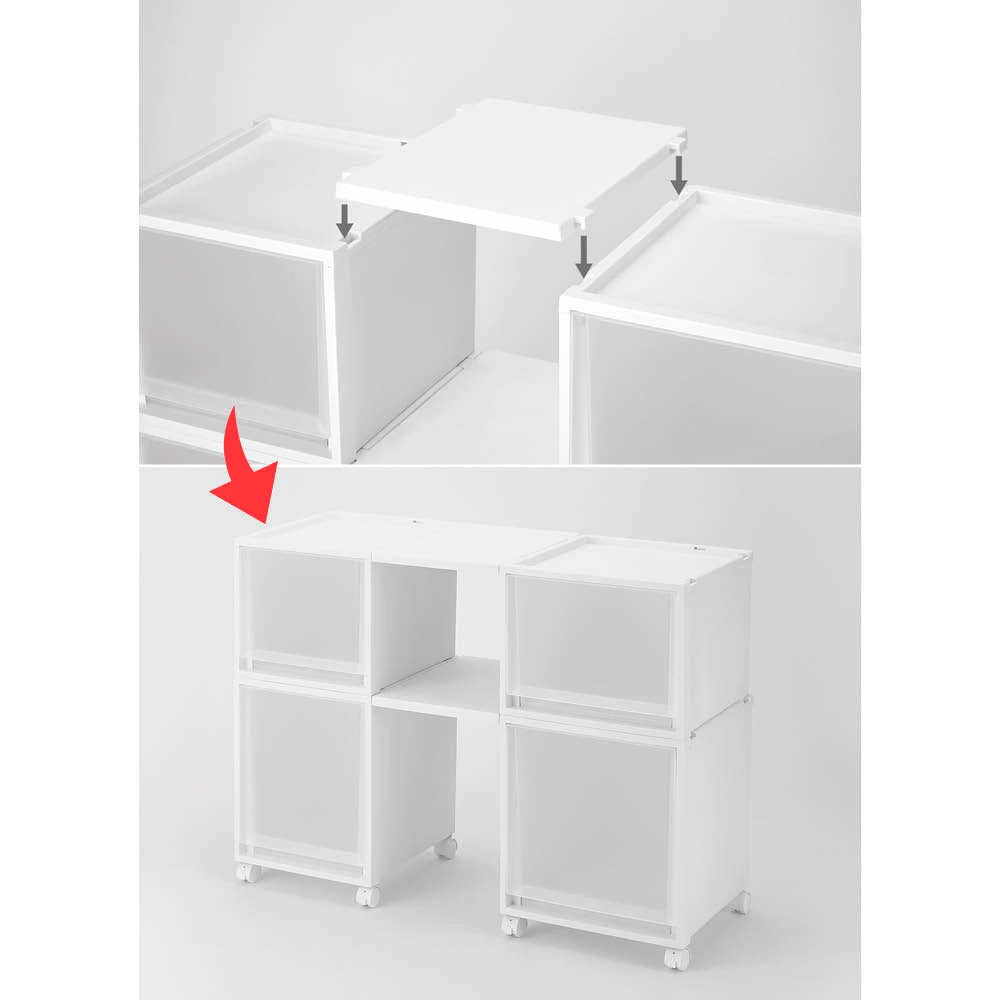 【組み合せ例】キッチン収納ワゴンにも。天板はシンクと高さを合わせてちょい置きに便利。 ※写真は別売り専用差込キャスターを使用しています。