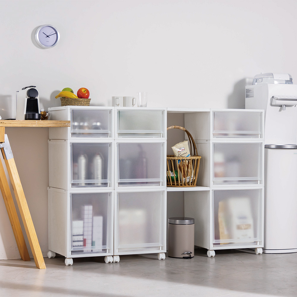 【高級感のある「すりガラス調」】引き出しは「すりガラス調」になっているので高級感を演出します。半透明でうっすら透けて見える為、収納物が認識できる実用性も兼ね備えています。
