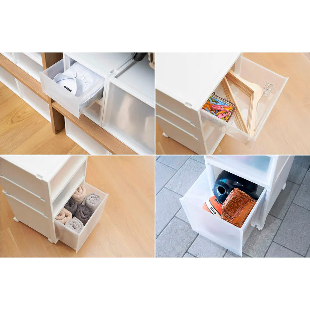 押し入れやクローゼットの衣類収納に。リビングに置いて生活用品の収納に。ランドリーでタオルやハンガーの収納に。玄関でキャンプ用品や子供のスポーツ用品の収納に。あらゆる空間でお使いいただけます。