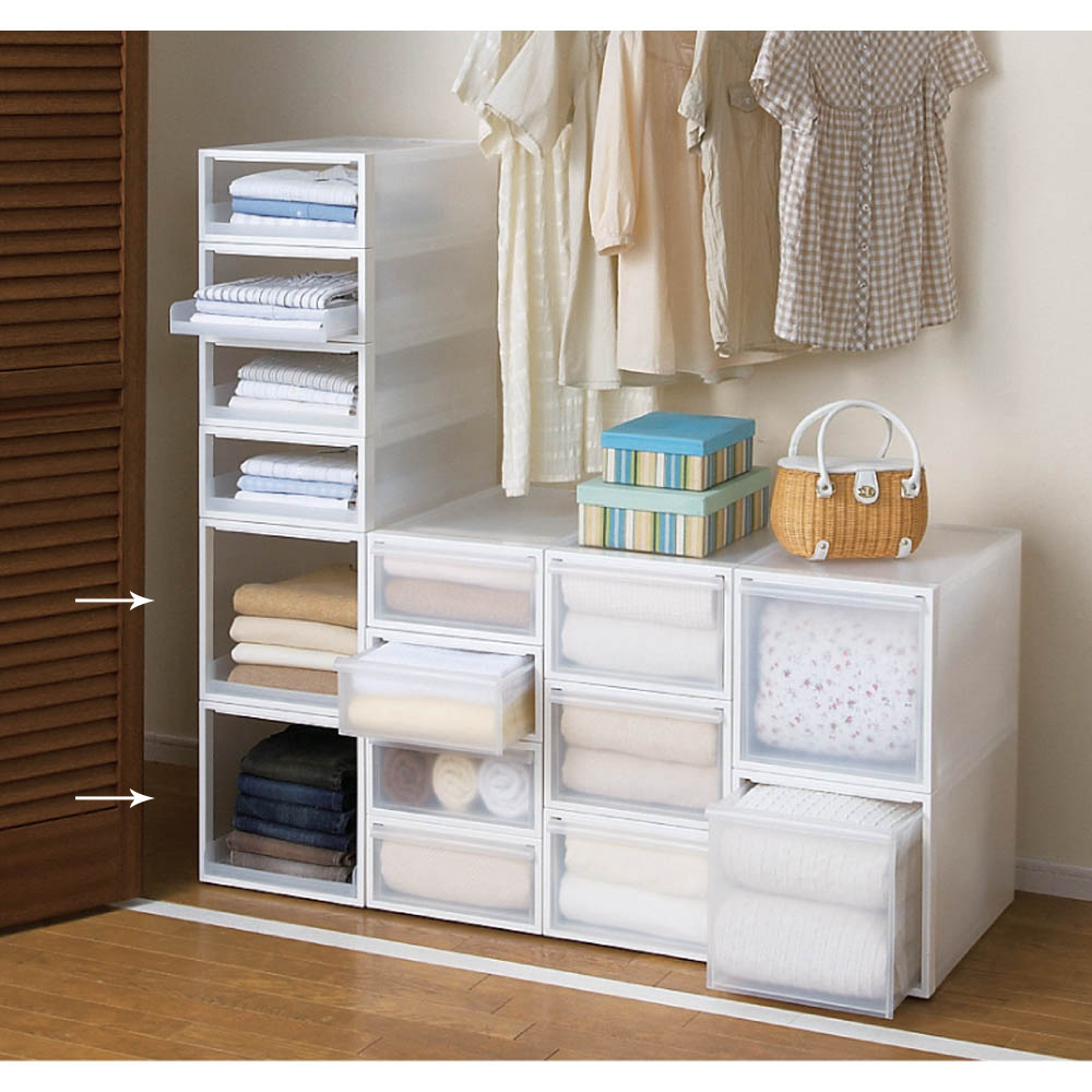 クローゼットがすっきり片付き、機能的に生まれ変わる!引き出し収納とトレー収納を組み合わせるだけで使いやすい収納空間に。高さの異なる3サイズから選べるので、クローゼットのちょっとした隙間を有効利用!クローゼットの整理整頓のために、クローゼットにぴったりサイズに作られた衣装ケースタイプの収納システム◆クローゼット内のハンガー下などの空いたスペースを機能的に!◆引き出しタイプとトレータイプの2種類!◆引き出しタイプは奥行を活かして大量にしまえる収納ケース。◆トレータイプは物が探しやすく、取り出しやすいので頻繁に使用するYシャツやパンツ類の収納に。◆上下左右に組み合わせて、いろいろアレンジできます!◆高さ16.1cmタイプ×4個、高さ21.5cmタイプ×3個、高さ31.8cmタイプ2個はタテに積み上げた時、同じ高さになるように設計!
