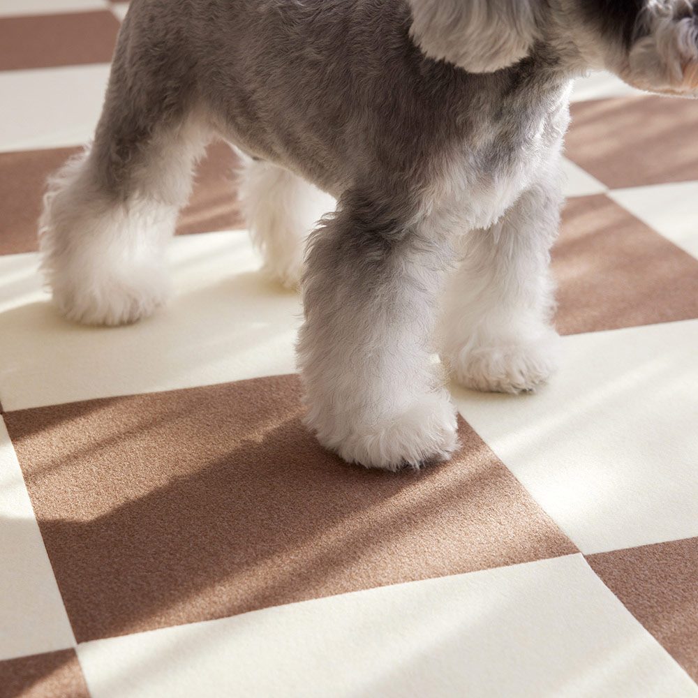 もうすべらないワン!愛犬の足腰にやさしい、はっ水&消臭機能付きの「置くだけ吸着マット」。スリップ防止に、気になるニオイに。置くだけで吸着するタイルマットがサポート。ディノスロングセラーの大人気商品。信頼の日本製です。床に置くだけでペットのスリップ軽減につながり、緑茶カテキンの効果でアンモニアなどのニオイも消臭。はっ水加工でお手入れも簡単なうえ、タイルマットだから汚れた部分だけ外して水洗いも可能です。特殊な吸着加工で、繰り返し貼り直して使えるのも◎。床に置くだけで設置完了!手軽で簡単だから失敗もなし。粘着性の物質を使用しているわけではないので、テープのようにべたべたせず、繰り返しはがして貼り直せます。床に跡が残りにくいのも特徴。裏面に特殊吸着加工。吸盤のようにピタッと床に貼りつくから、掃除機をかけてもはがれません。毛羽立ちが少なく、毛足が短いマットなので、犬や猫の爪がひっかかりにくく、ペットも快適に上を歩き回れます。マットなしの場合、ありの場合の比較フローリングはつるつるとすべりやすく、ペットの足腰に負担が掛かってしまいます。マットを敷けばすべりにくくなり、ペットが元気に動き回っても安心。ソファーなどの高いところから降りる時も、すべらずクッションになります。表面には、はっ水加工!万が一、水やペットのおしっこがかかってしまっても大丈夫。はっ水加工がされているので、すぐにふき取ればほとんど染み込むこともありません。汚れた部分だけはがして、洗濯機で丸洗いもOKタイルカーペットなので、汚れた時は必要なところだけを取り外し、水洗いできます。何度洗っても吸着力は持続し、乾きも早いので、洗濯待ちのストレスもなし。薄いので、部屋の大きさや形に合わせてカットしてもOKマットの厚みは約3mm。ハサミで簡単にカットすることができるので、お部屋のサイズや、柱などの形状に合わせて、ぴったりと敷き込むこともできます。厚さ3mmだから、ドアの下に敷いても開閉がスムーズ!滑りにくいからペットの脚への負担を軽減!「フローリングは滑りやすく、歩いたり走ったりするときはもちろん、おすわりしているだけでも滑ってしまい、ペットの膝に大きな負担がかかります。このマットを敷いておけば、ペットの脚をしっかりグリップ。毛足が短くループもないので、爪も引っかかりません。滑らないことでペットもリラックスでき、歩くモチベーションも上がるので、足腰の老化を遅らせるのにも◎」