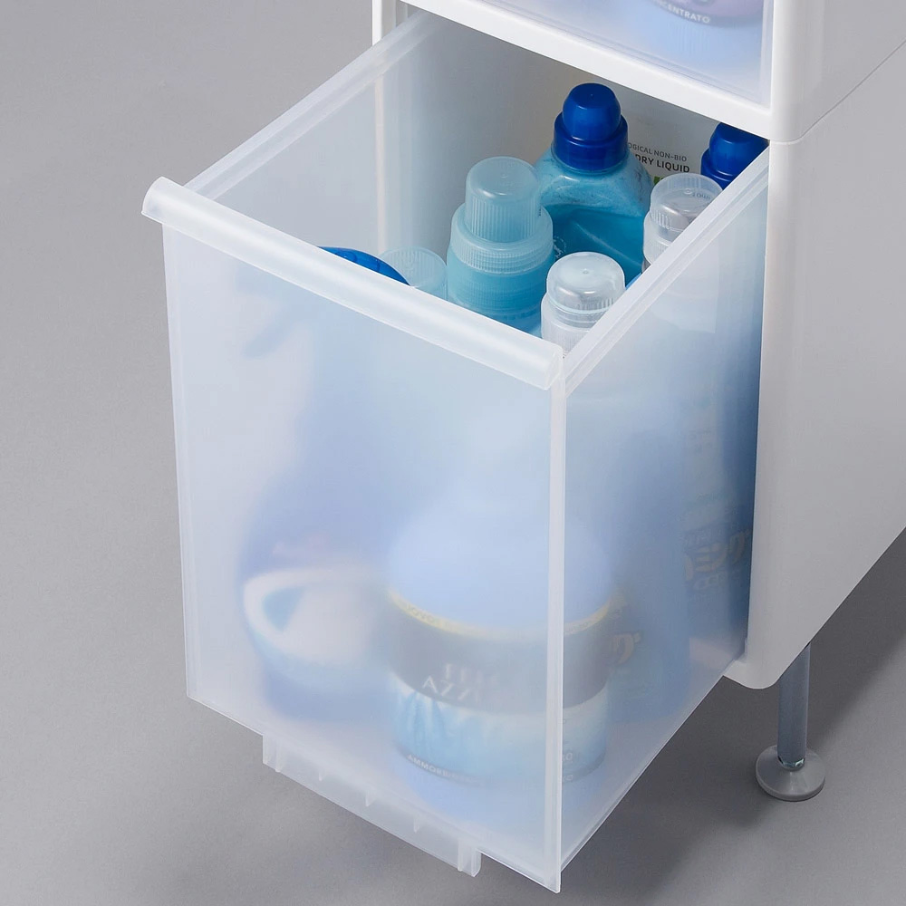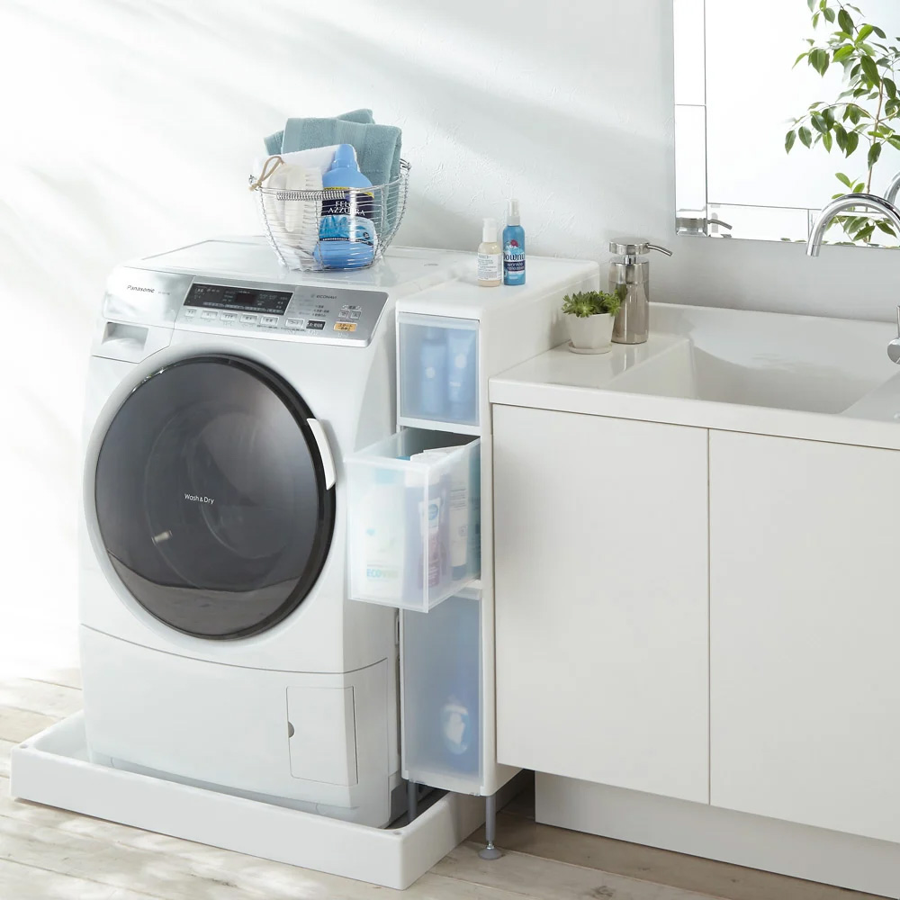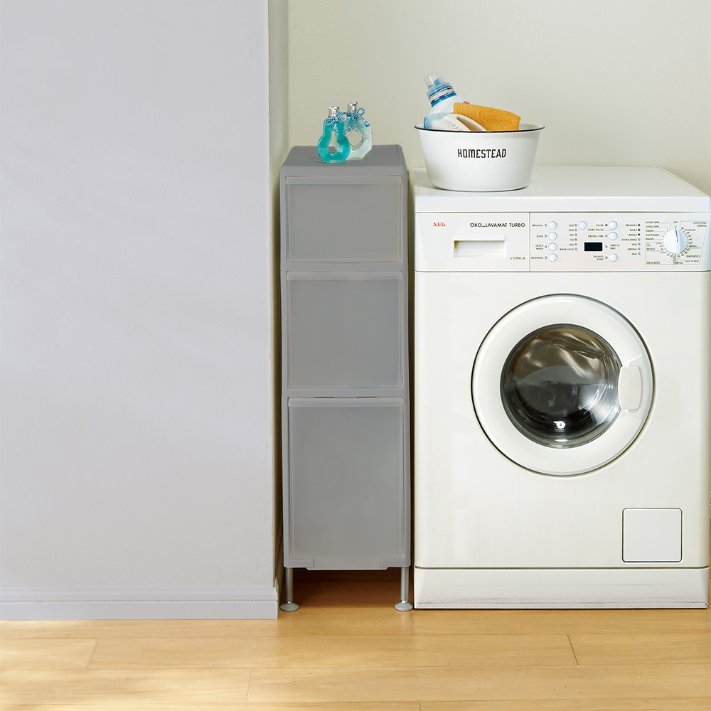 防水パン(洗濯機パン)をまたいで設置し、狭いすき間を有効活用できるアジャスター付きの洗濯機サイドストッカー。水ハネに強い樹脂製なので洗面台の横や脱衣所のすき間でも安心して使えます。洗面台脇や洗濯機横のすき間におさまるランドリー収納●脱衣所や洗面所が狭くてチェストが置けないという方や、洗面所の収納棚をお探しの方にぜひともおすすめの商品です。●幅14cm、幅17cm、幅25.5cmの3サイズから選べる引き出しタイプの収納家具です。●わずかなすき間を活かして、引き出しにしっかり小分けして収納することができます。●すき間を奥までしっかり使える奥行46.5cmで、スリム幅でも収納力があります。●高さは洗面台より少し高い92cmなので洗面台の補助スペースとして使え、天板に物をちょい置きできて便利。●天板は、洗面所で置き場所に困るティッシュの指定席としてもおすすめです。高さのあるアジャスター付き脚部で防水パンにおさまる、またげる●段差に対応できる高さ10〜12.5cm(アジャスター込み)の脚付きです。●アジャスターで2.5cmの調整が可能です。●アジャスター径は3.8cmなので、防水パンの中のわずかなスペースを利用して設置できます。大きさの異なるものを整理・収納できる便利な3段引き出し●引き出しの深さが3種類あるので、収納するものに合わせてすっきり整理できます。・浅引き出し…内寸高さ16cm。洗面台で使う化粧品や歯ブラシ、歯磨き粉などがおすすめです。・中引き出し…内寸高さ22.5cm。スプレーボトルや詰め替え用のパック類、洗濯洗剤の箱などの収納に。・深引き出し…内寸高さ31cmなので大きめの洗剤ボトルや柔軟剤がしまえるサイズです。※収納物はあくまで目安となります。各引き出しの内寸については仕様・サイズ欄の詳細をご覧ください。クリーンな樹脂製だから水まわりでも安心して使えます●液漏れなどの心配のある洗剤も安心して収納できる素材を使用しています。●水に強い樹脂製なので、洗面化粧台の水ハネが気になる場所に設置してもOKです。●シンプルで清潔感あふれるデザインは、ランドリー空間にぴったりです。隠す収納・見える収納が選べる3色を取り揃えました●引き出し部分のカラーは、3種類からお選びいただけます。●(ア)クリア/ホワイトは入れたものがほんのり透けて、中身がわかりやすい仕様。●(イ)ホワイト、(ウ)グレーは透けない素材なので洗面所がすっきりした印象に。●不透明タイプは生活感を出したくないという方にもおすすめします。シリーズ商品のご案内防水パンがまたげるアジャスター付きストッカーは以下のシリーズ商品がございます。※このページはミドル 幅17cmタイプの販売ページです。・スリム 幅14cm ・ミドル 幅17cm ・ワイド 幅25.5cm