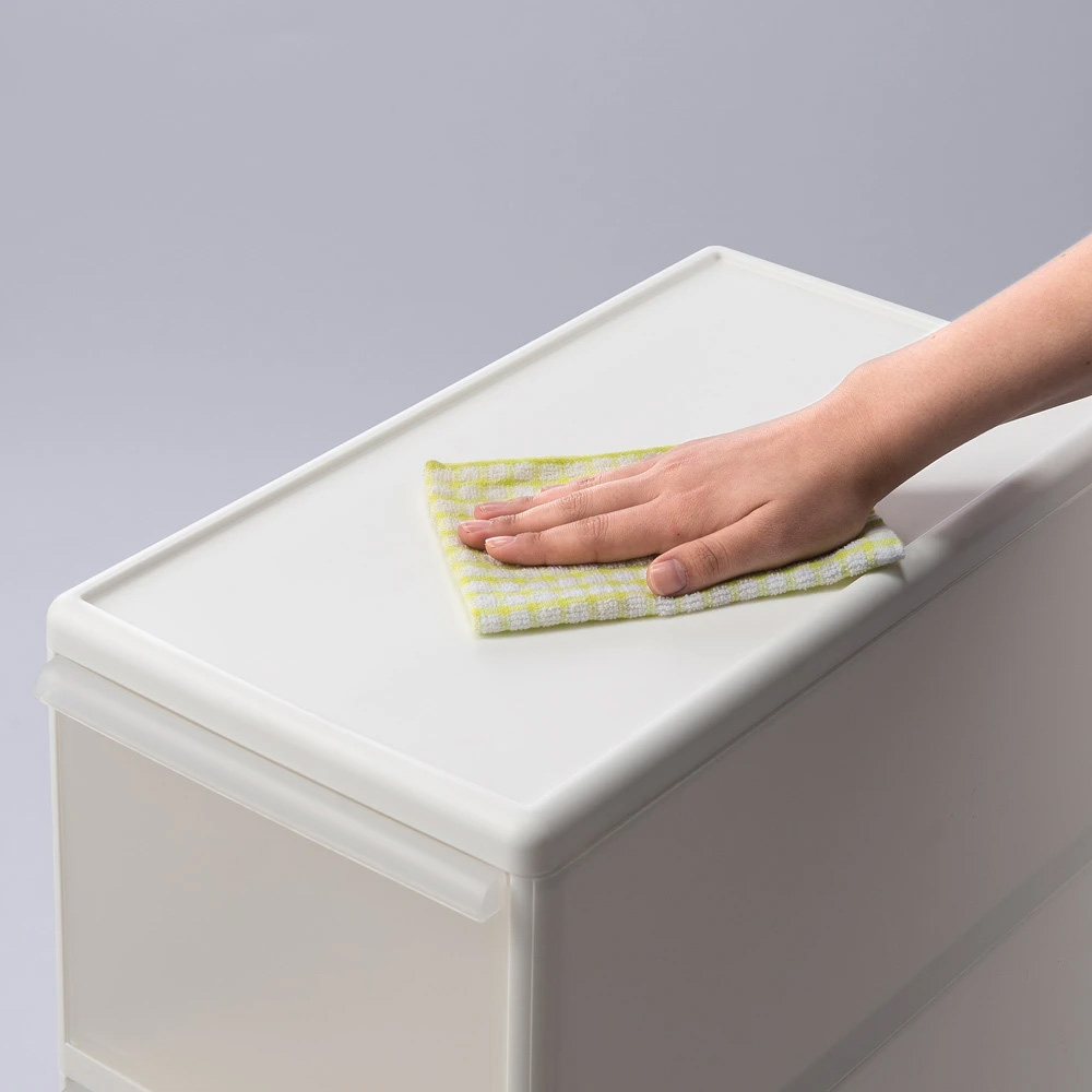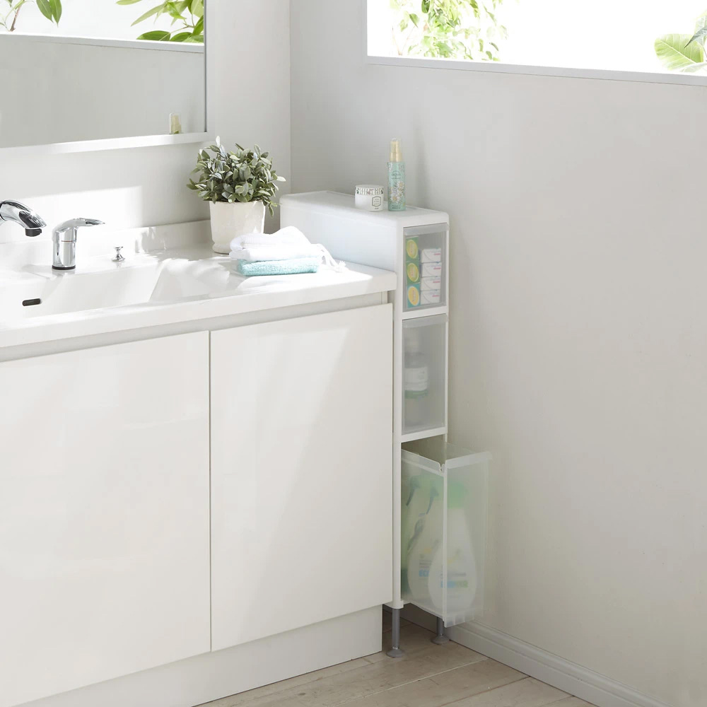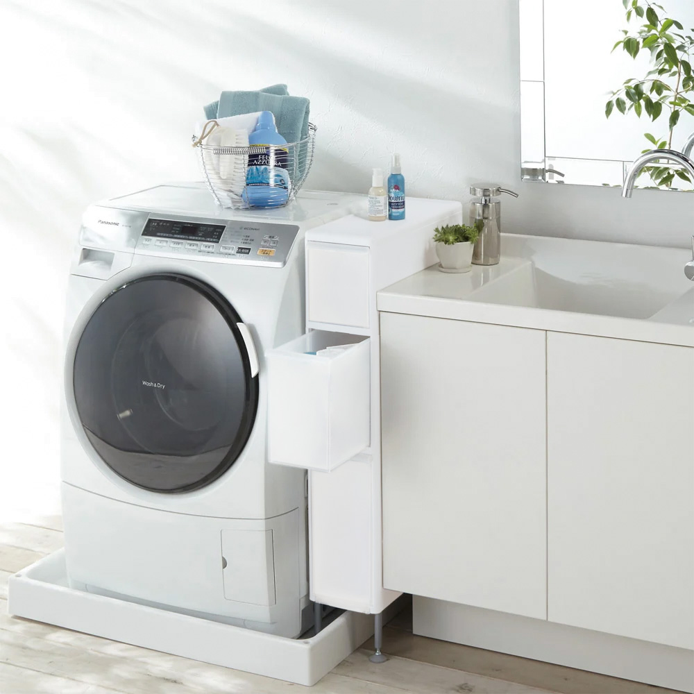 防水パン(洗濯機パン)をまたいで設置し、狭いすき間を有効活用できるアジャスター付きの洗濯機サイドストッカー。水ハネに強い樹脂製なので洗面台の横や脱衣所のすき間でも安心して使えます。洗面台脇や洗濯機横のすき間におさまるランドリー収納●脱衣所や洗面所が狭くてチェストが置けないという方や、洗面所の収納棚をお探しの方にぜひともおすすめの商品です。●幅14cm、幅17cm、幅25.5cmの3サイズから選べる引き出しタイプの収納家具です。●わずかなすき間を活かして、引き出しにしっかり小分けして収納することができます。●すき間を奥までしっかり使える奥行46.5cmで、スリム幅でも収納力があります。●高さは洗面台より少し高い92cmなので洗面台の補助スペースとして使え、天板に物をちょい置きできて便利。●天板は、洗面所で置き場所に困るティッシュの指定席としてもおすすめです。高さのあるアジャスター付き脚部で防水パンにおさまる、またげる●段差に対応できる高さ10〜12.5cm(アジャスター込み)の脚付きです。●アジャスターで2.5cmの調整が可能です。●アジャスター径は3.8cmなので、防水パンの中のわずかなスペースを利用して設置できます。大きさの異なるものを整理・収納できる便利な3段引き出し●引き出しの深さが3種類あるので、収納するものに合わせてすっきり整理できます。・浅引き出し…内寸高さ16cm。洗面台で使う化粧品や歯ブラシ、歯磨き粉などがおすすめです。・中引き出し…内寸高さ22.5cm。スプレーボトルや詰め替え用のパック類、洗濯洗剤の箱などの収納に。・深引き出し…内寸高さ31cmなので大きめの洗剤ボトルや柔軟剤がしまえるサイズです。※収納物はあくまで目安となります。各引き出しの内寸については仕様・サイズ欄の詳細をご覧ください。クリーンな樹脂製だから水まわりでも安心して使えます●液漏れなどの心配のある洗剤も安心して収納できる素材を使用しています。●水に強い樹脂製なので、洗面化粧台の水ハネが気になる場所に設置してもOKです。●シンプルで清潔感あふれるデザインは、ランドリー空間にぴったりです。隠す収納・見える収納が選べる3色を取り揃えました●引き出し部分のカラーは、3種類からお選びいただけます。●(ア)クリア/ホワイトは入れたものがほんのり透けて、中身がわかりやすい仕様。●(イ)ホワイト、(ウ)グレーは透けない素材なので洗面所がすっきりした印象に。●不透明タイプは生活感を出したくないという方にもおすすめします。シリーズ商品のご案内防水パンがまたげるアジャスター付きストッカーは以下のシリーズ商品がございます。※このページはワイド 幅25.5cmタイプの販売ページです。・スリム 幅14cm ・ミドル 幅17cm ・ワイド 幅25.5cm