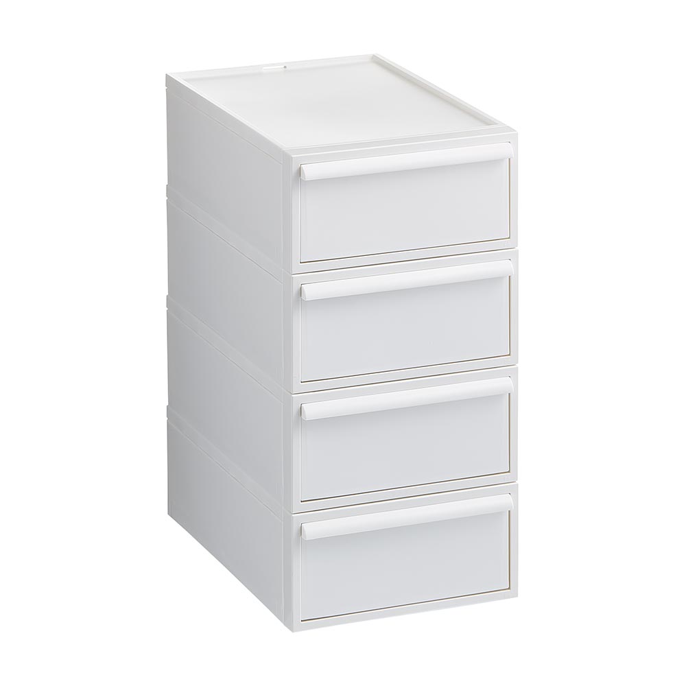 積み重ねて使える、衣類収納でクローゼット周りがすっきり。洋服の大量収納の叶う収納力なのに、中身が隠せるチェストでお部屋がおしゃれに片付きます。すき間収納としても使えるスリムなサイズで省スペースが叶います。ウォークインクローゼットや押入れにも収まる奥行き52cm。シンプルなデザインにこだわった衣類チェストミニマルデザインのスクエアフォルムにこだわったお洒落な洋服収納ケースのご紹介です。隠せる収納で、すっきりと整理整頓ができます。引き出しの取っ手もシンプルなデザインです。クローゼットの中はもちろんお部屋で使ってもオシャレに決まるクローゼット収納です。用途に合わせて選べる深さお好みに合わせて高さが3種類から選べます。浅型:下着やハンカチの収納におすすめ。中型:シャツやスポーツタオルの収納に。深型:トレーナーやニットなども収納可能。浅型×4個、中型×3個、深型×2個を縦に積み上げた時に、同じ高さになる設計です。衣替えにも便利なスタッキング仕様重ねて使用できるので面倒な季節ごとの衣替えもそのまま入れ替えるだけで簡単に完了♪3サイズ展開ですが、幅と奥行きは同じなので積み方・組み合わせは自由自在です。隙間収納にもなるスリムなサイズ幅32cmなのでハンガーラック横の隙間にも。樹脂ケースなので汎用性が高く、キッチン収納、ストッカー、サニタリ収納、サニタリチェスト、トイレ収納など衣類収納以外でも活躍します。汚れづらくお手入れが簡単なのもポイント。スリムさはもちろん、シャツを畳んでちょうどよく収まるサイズも意識した設計です。