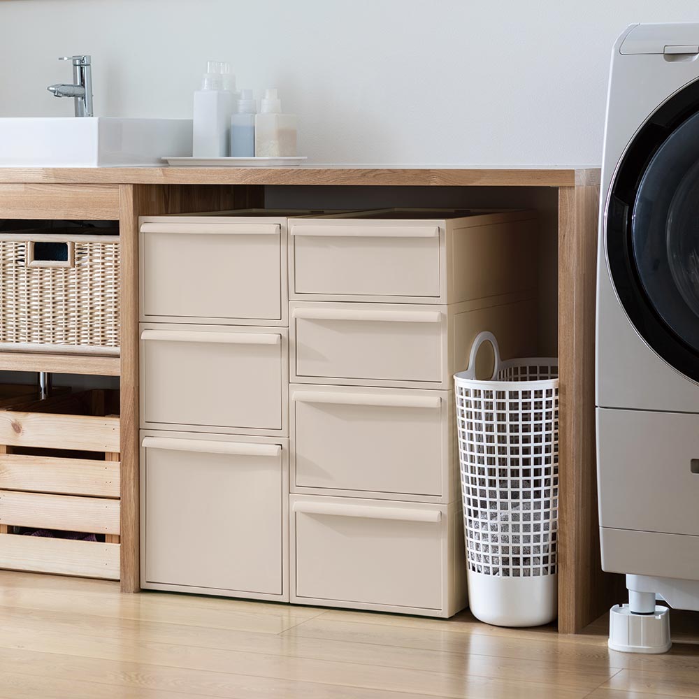 コーディネート例(ウ)ベージュ 洗面台下でタオルや洗剤のストック類、ハンガーなどの収納にもおすすめです。