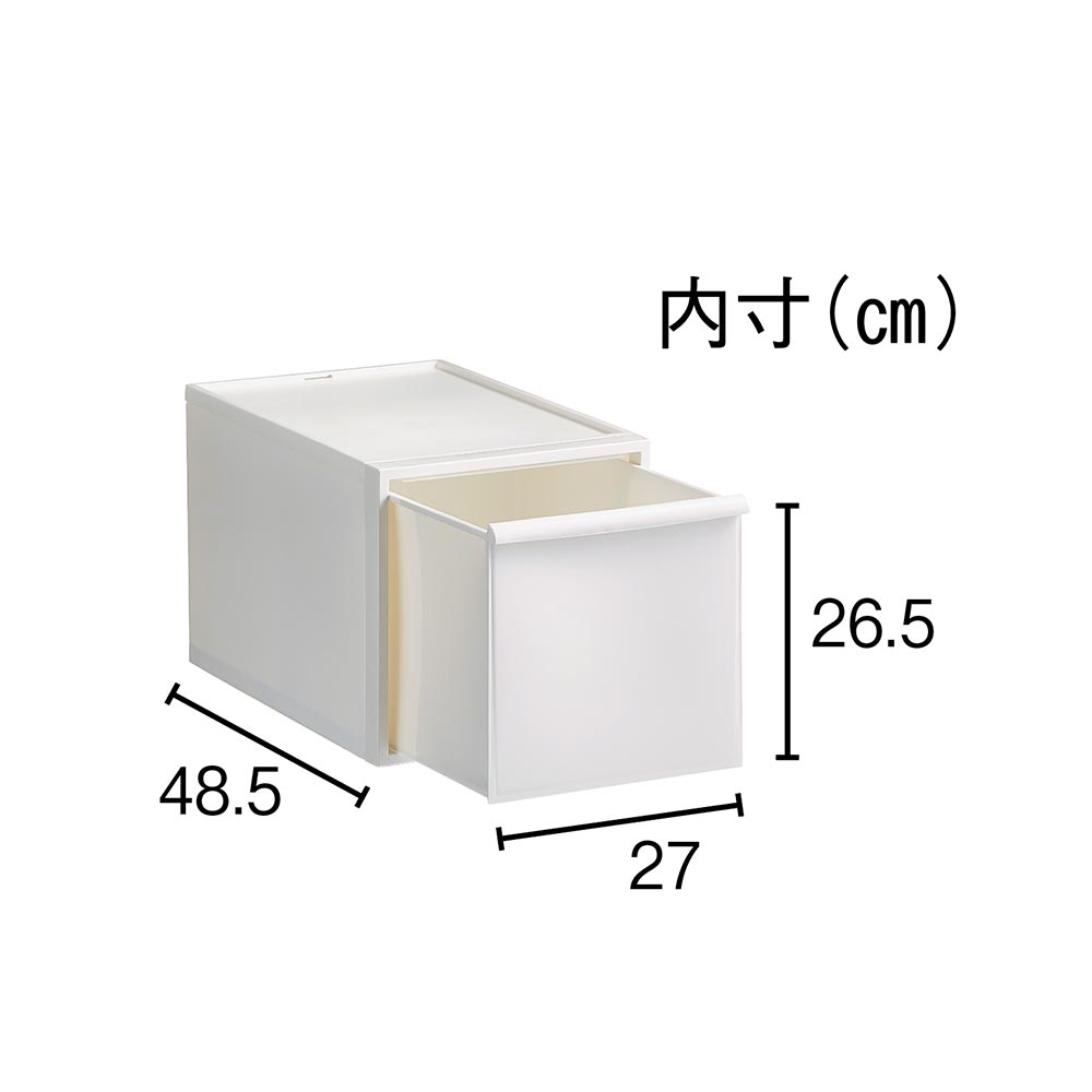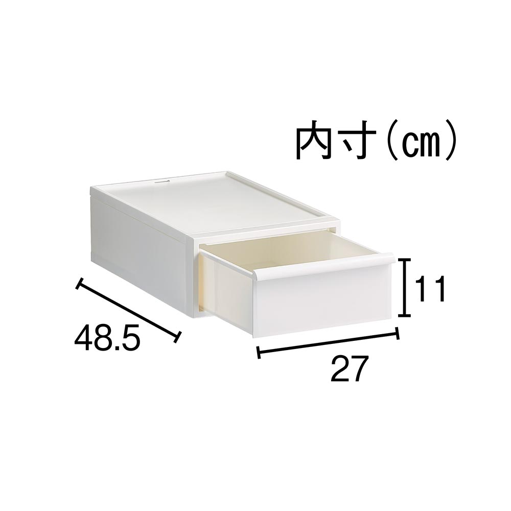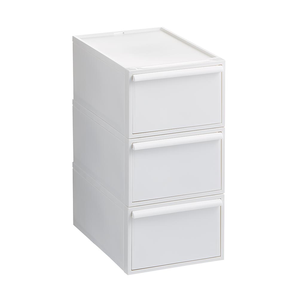 積み重ねて使える、衣類収納でクローゼット周りがすっきり。洋服の大量収納の叶う収納力なのに、中身が隠せるチェストでお部屋がおしゃれに片付きます。すき間収納としても使えるスリムなサイズで省スペースが叶います。ウォークインクローゼットや押入れにも収まる奥行き52cm。シンプルなデザインにこだわった衣類チェストミニマルデザインのスクエアフォルムにこだわったお洒落な洋服収納ケースのご紹介です。隠せる収納で、すっきりと整理整頓ができます。引き出しの取っ手もシンプルなデザインです。クローゼットの中はもちろんお部屋で使ってもオシャレに決まるクローゼット収納です。用途に合わせて選べる深さお好みに合わせて高さが3種類から選べます。浅型:下着やハンカチの収納におすすめ。中型:シャツやスポーツタオルの収納に。深型:トレーナーやニットなども収納可能。浅型×4個、中型×3個、深型×2個を縦に積み上げた時に、同じ高さになる設計です。衣替えにも便利なスタッキング仕様重ねて使用できるので面倒な季節ごとの衣替えもそのまま入れ替えるだけで簡単に完了♪3サイズ展開ですが、幅と奥行きは同じなので積み方・組み合わせは自由自在です。隙間収納にもなるスリムなサイズ幅32cmなのでハンガーラック横の隙間にも。樹脂ケースなので汎用性が高く、キッチン収納、ストッカー、サニタリ収納、サニタリチェスト、トイレ収納など衣類収納以外でも活躍します。汚れづらくお手入れが簡単なのもポイント。スリムさはもちろん、シャツを畳んでちょうどよく収まるサイズも意識した設計です。