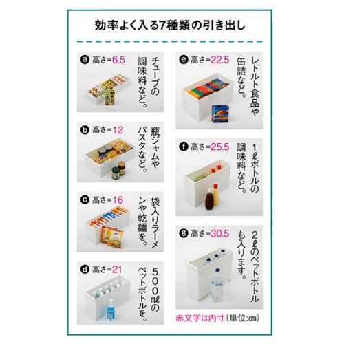 引き出しc・内寸高さ16cm。袋入りラーメンや乾麺を。