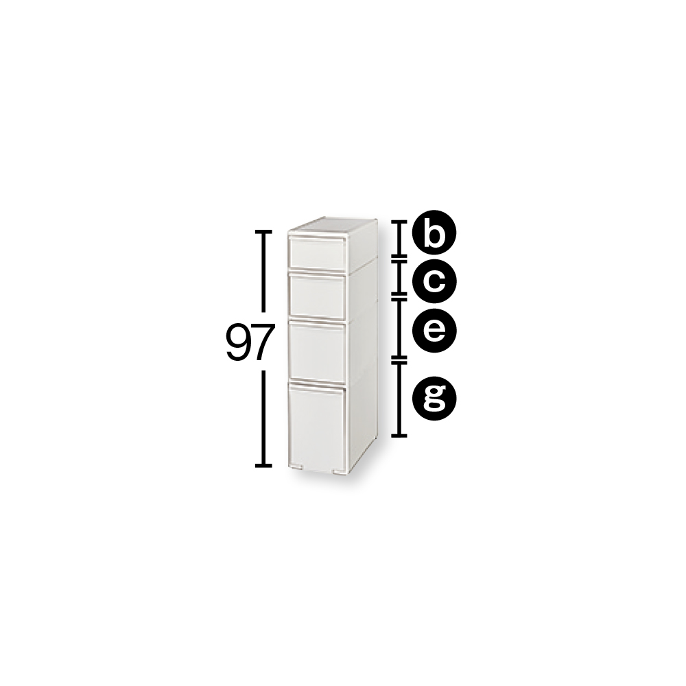 深さが異なる多段引き出しで、物に合わせた分類収納がしやすいストッカー。キッチンのわずかなすき間にすっぽり収まり、内部が透けないので見た目もすっきり!25.5cmのすき間にストック類を上手に収納●シンクや冷蔵庫横などのすき間を有効利用できる幅25.5cm。●狭いキッチンでも使いやすいスリムサイズ。並べて置いても場所を取りません。●4段の引き出しにストック類が効率よく整理でき、シンクと並べても置きやすい高さ97cm。●収納物が透けて見えないので、生活感が漂わず見た目もスマートです。●水回りでも気兼ねなく使える樹脂製。汚れもサッとひと拭きで、お手入れがラクです。●引き出しは抜け落ち防止のストッパー付きで安心です(最下段を除く)。●体底面には小さなキャスター(コロ)が付いており、お掃除の際の移動もスムーズ。※コロは後ろ側の2箇所のみ付属しております。●清潔感のあるホワイト色。キッチンだけでなく、洗面所やトイレ、子供部屋などでも便利に使えます。●もしもの災害時用にストックしている非常食や備蓄品の保存場所としてもおすすめです。●丈夫で丁寧なつくりの日本製です。引き出しの深さが異なり、物に合わせた分類がラク!●1段目は瓶ジャムやパスタなどが入れやすい内寸高12cmの引き出し。●2段目は袋入りラーメンがちょうどよく収まる内寸高16cmの引き出し。●3段目はレトルト食品や缶詰など入れやすい内寸高22.5cmの引き出し。●最下段は2リットルボトルが入る内寸高30.5cmの引き出し。●最下段の引き出しはローラー付きで、重い物を入れてもラクに引き出せます。収納量やスペースに合わせて選べる12種類のラインナップ●すき間に収まる幅17cmタイプは4段・5段・6段・7段・8段・9段の6種類。●収納力のある幅25.5cmタイプも4段・5段・6段・7段・8段・9段の6種類をご用意。