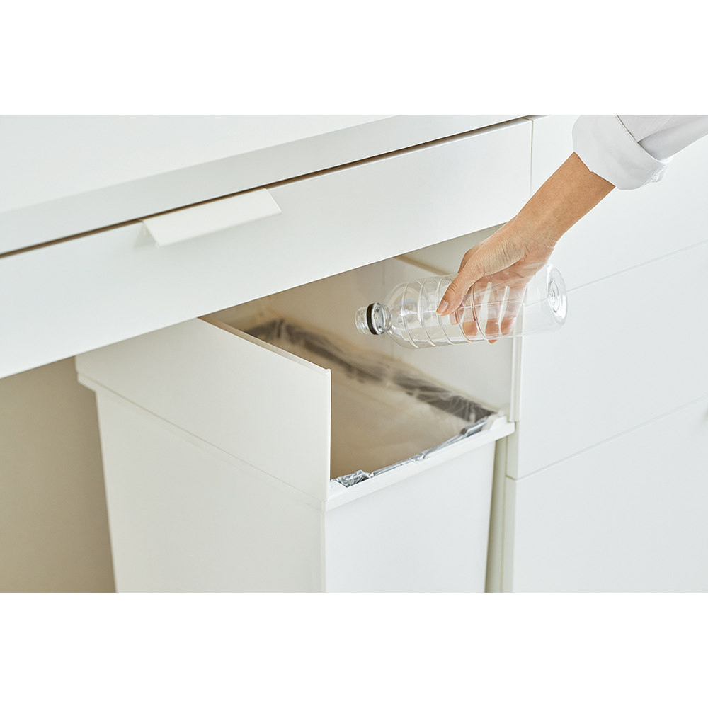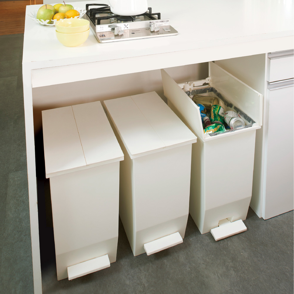 使用イメージ(ア)ホワイト コンロ下にも置けて、狭くても動線スムーズ。 ※写真は45リットル・3個組みタイプです。