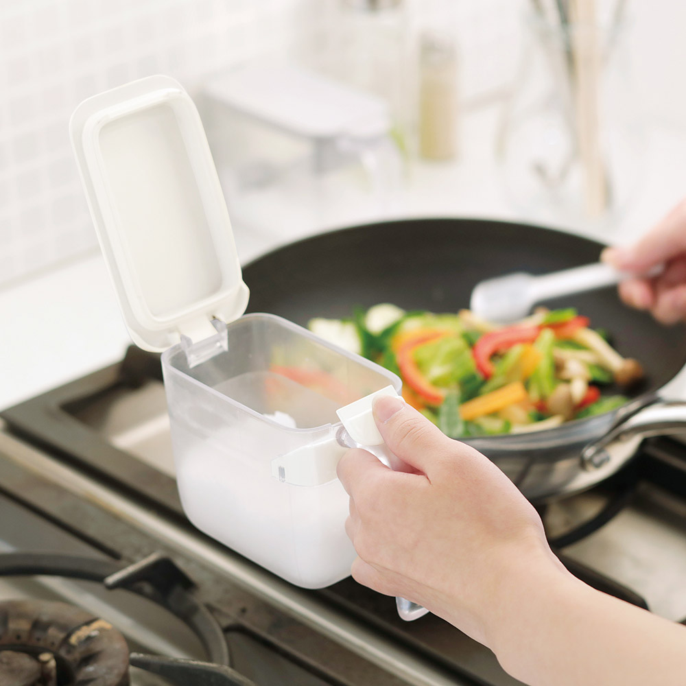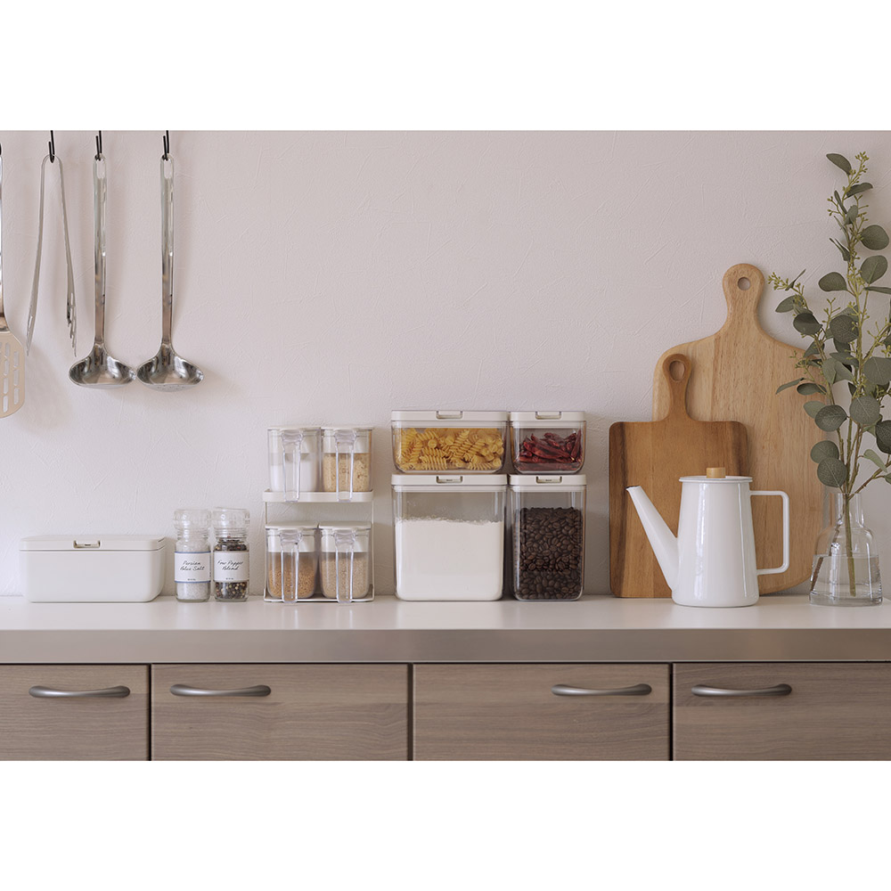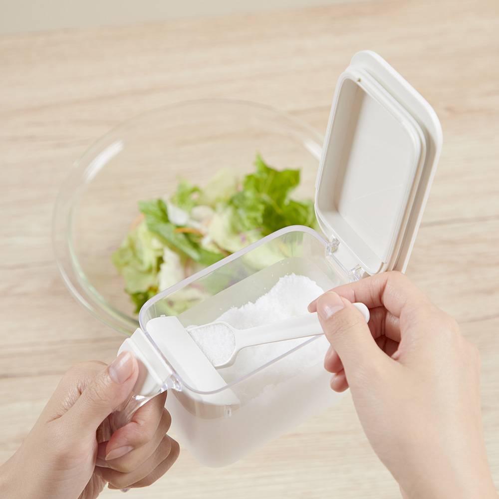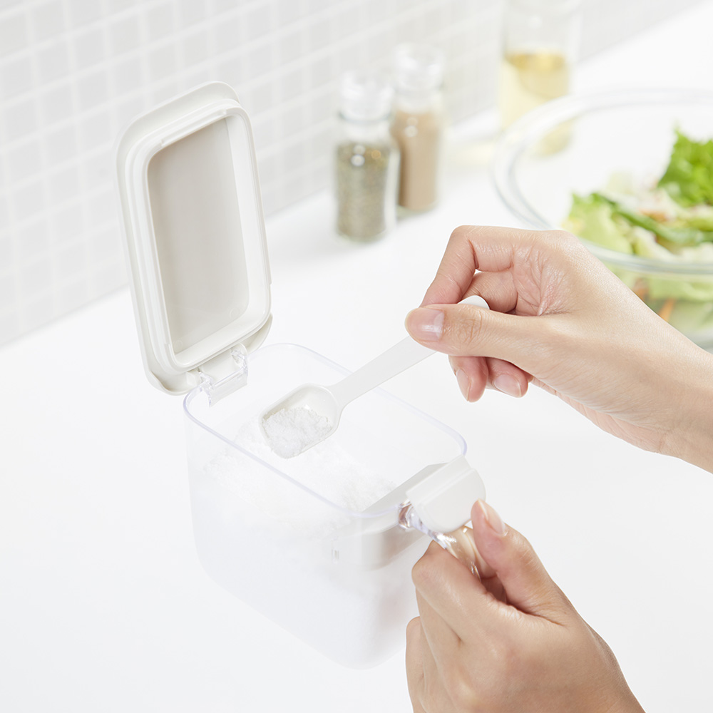 密閉性と操作性を兼ね備えた、使う人に寄り添う収納用品のシリーズです。いつまでも、まるで開封したてのように買ったときの風味を保ってくれる保存容器シリーズです。●ワンタッチで簡単にオープン!フタの置き場に困らないのも嬉しいポイントです。●フタが奥に開くため手元が見やすく、さっと調味料をすくえます。●シリコーンゴムのパッキンが付いているので、しっかり閉まって湿気を防ぎます。●付属のスプーン小さじ1(5ml)をすり切れる板付きです。●埋もれがちなスプーンは、すりきり板に立て掛けられます。●満量位置がわかりやすく落ち着いた印象になる、すりガラス調。●パッキンとすり切り板が取り外せるので、衛生的にお使いいただけます。