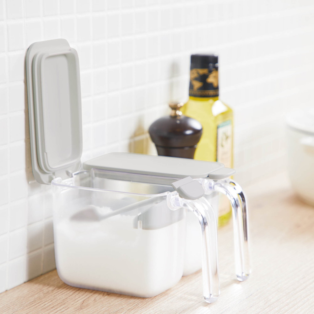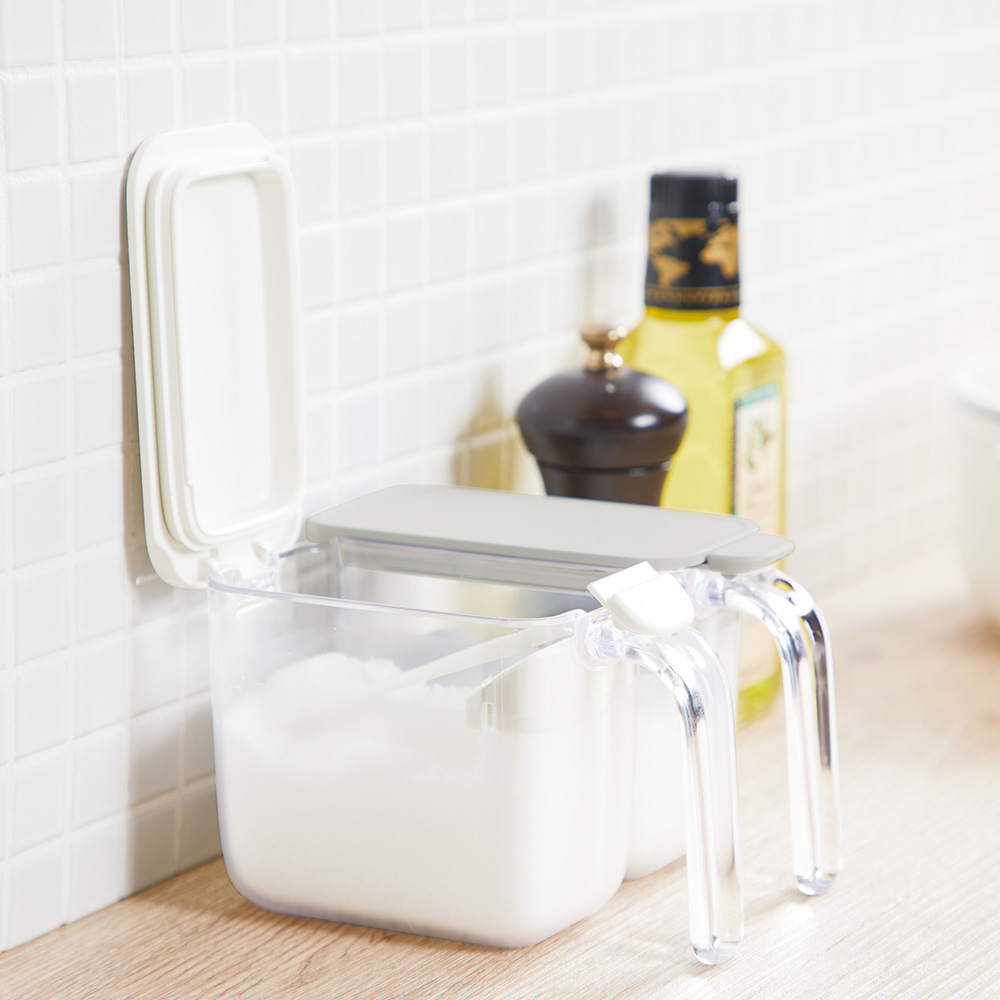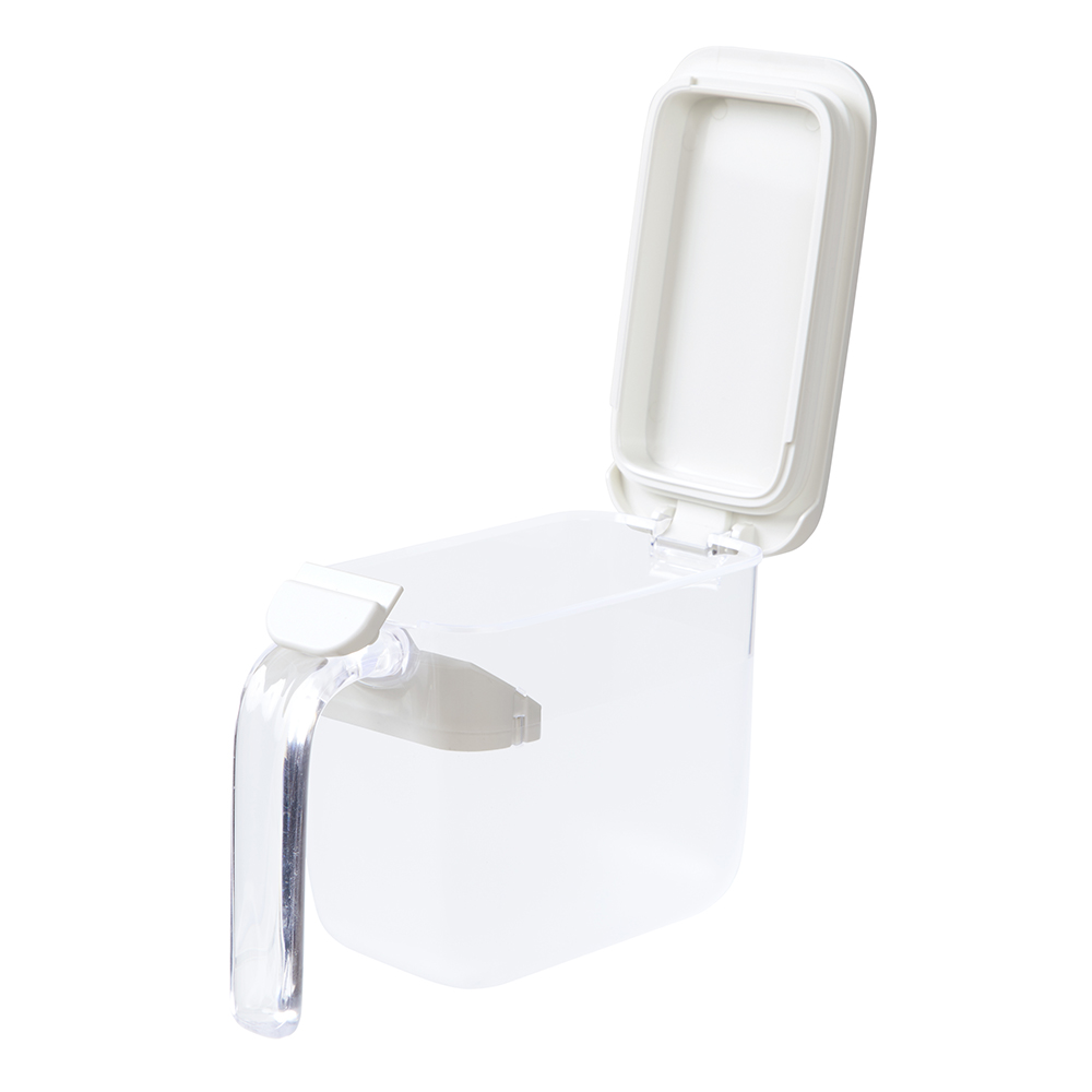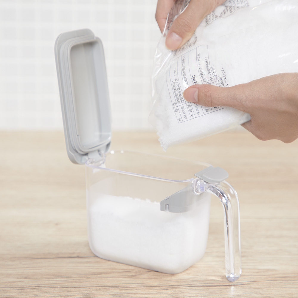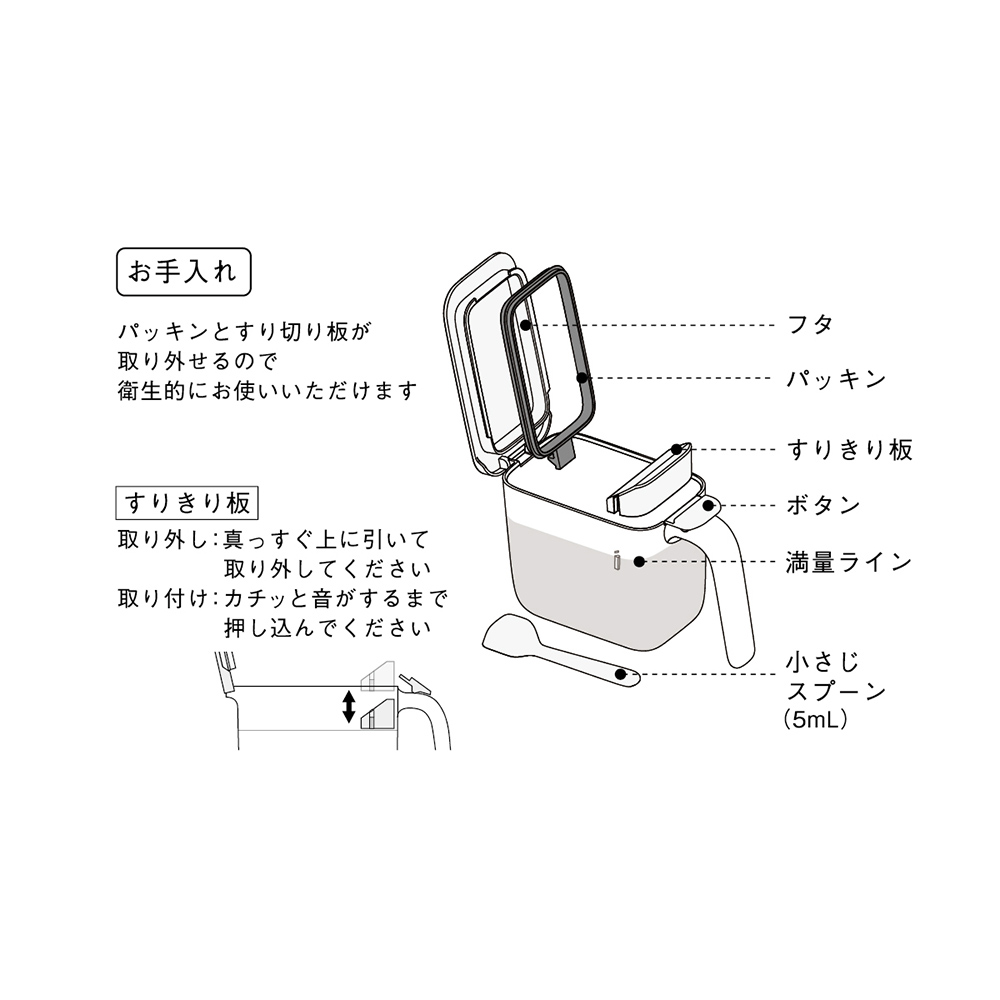密閉性と操作性を兼ね備えた、使う人に寄り添う収納用品のシリーズです。いつまでも、まるで開封したてのように買ったときの風味を保ってくれる保存容器シリーズです。●ワンタッチで簡単にオープン!フタの置き場に困らないのも嬉しいポイントです。●フタが奥に開くため手元が見やすく、さっと調味料をすくえます。●シリコーンゴムのパッキンが付いているので、しっかり閉まって湿気を防ぎます。●付属のスプーン小さじ1(5ml)をすり切れる板付きです。●埋もれがちなスプーンは、すりきり板に立て掛けられます。●満量位置がわかりやすく落ち着いた印象になる、すりガラス調。●パッキンとすり切り板が取り外せるので、衛生的にお使いいただけます。
