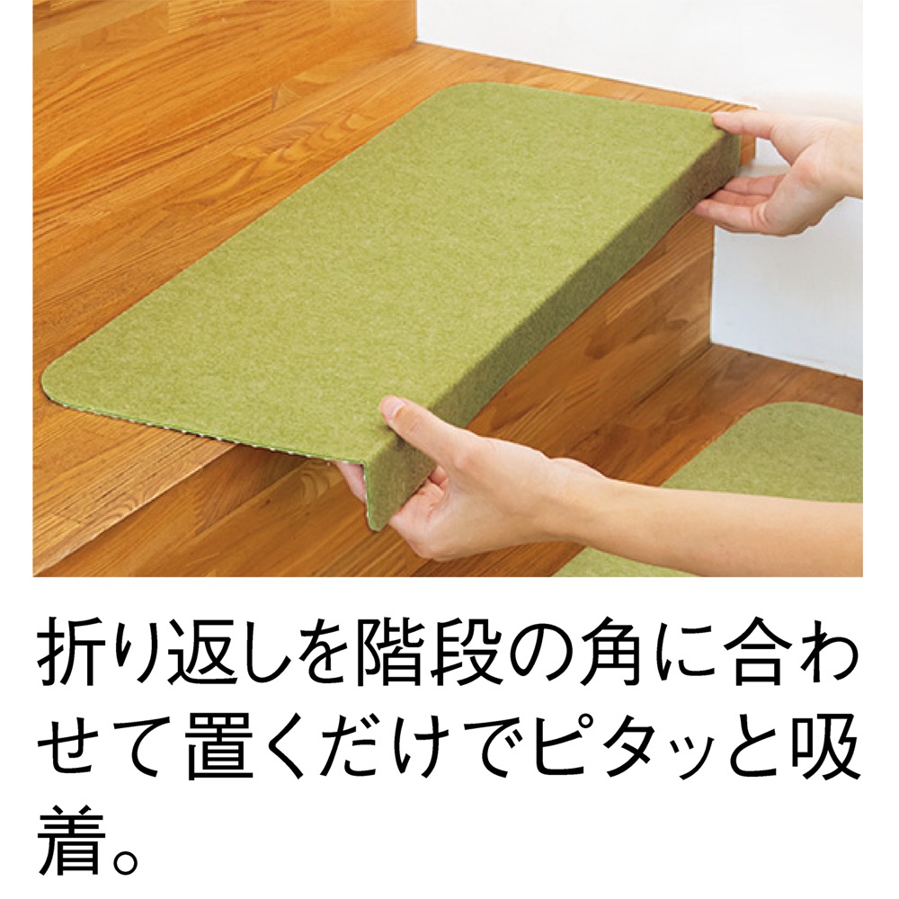 大人気おくだけ吸着マットの階段マット。折り曲げ部分がついて更にしっかり固定!【大人気!おくだけ吸着マットシリーズの階段用マット】折り曲げ部分があるのでズレにくく、すべりやすい材質や傾斜の急な階段にもおすすめ!ワンちゃん、ネコちゃんの昇り降りのバタバタ音の軽減にも有効です。【おくだけで固定、ズレにくいのに取り外しやすい】特殊な裏側の構造が吸盤のように張り付いて、置くだけでピタッと吸着するので設置もラクラク。掃除機をかけても吸いつきにくいからお掃除もスムーズです。しかも、粘着性の物質を使用しているわけではないので、跡を残さずキレイに取り外せます。汚れたら繰り返し洗って使える機能性も、おくだけ吸着シリーズならではです。約50回洗っても吸着力が持続!※洗濯ネットを利用すればご家庭の洗濯機で洗えます。