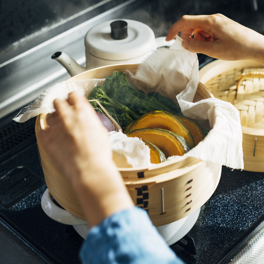 蒸し物で使うと食材のくっつきを防ぎ、余分な水分を吸収して美味しく仕上がります。