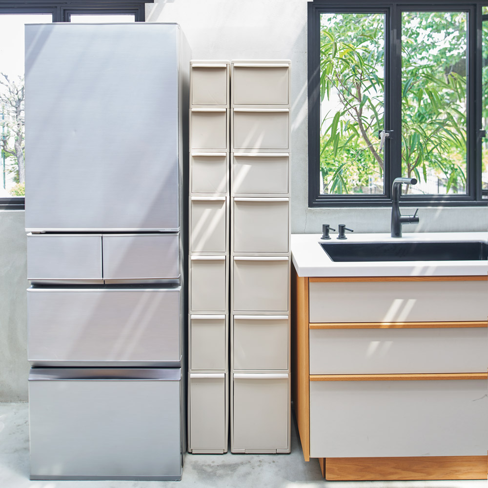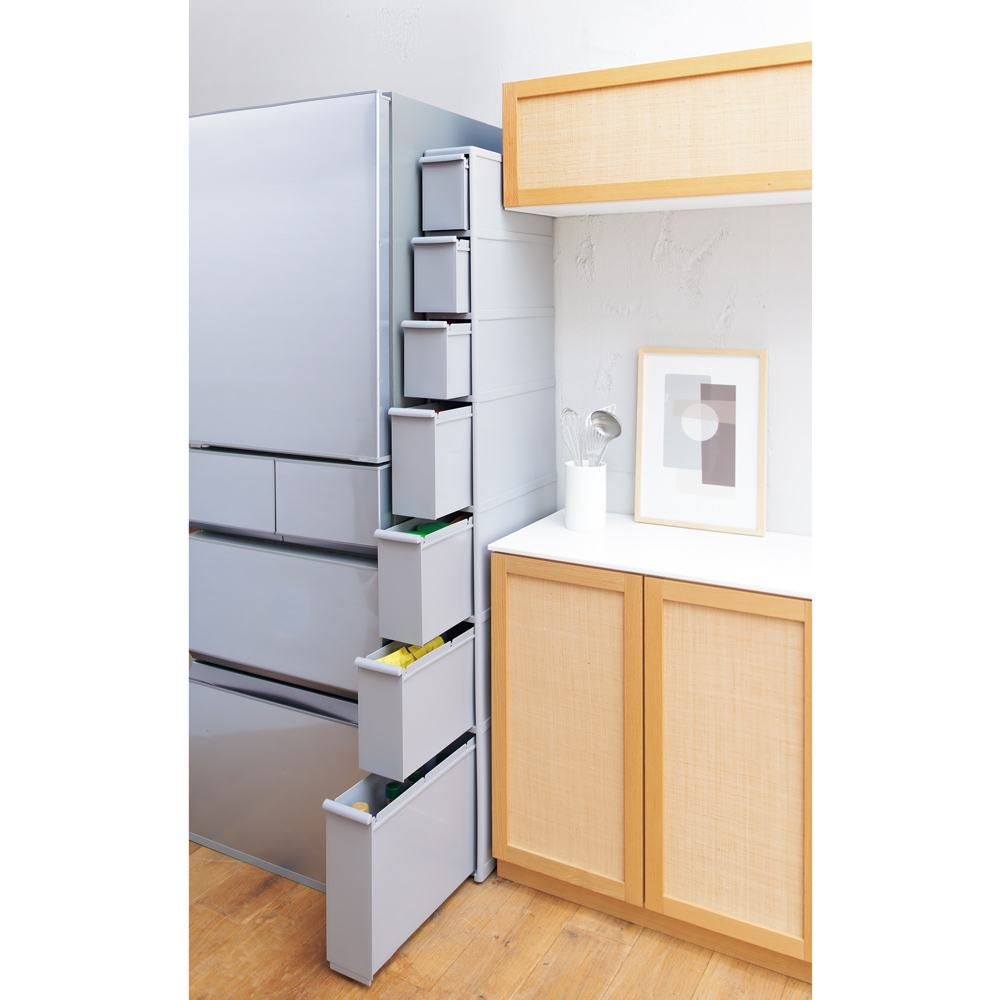 キッチンのすき間収納の中でも見映えのよさで選ぶならコレ!旬のニュアンスカラーが空間のおしゃれ感を壊さず、こだわりのインテリアに美しく調和します。トレンドのニュアンスカラーをキッチン収納にも♪●「スタイリッシュな家電を揃えても、収納用品が無粋で興ざめ」「インテリアになじむ素敵なデザインが見当たらない」とお嘆きの方におすすめのおしゃれなすき間収納です。●(ア)ホワイト(イ)ベージュ(ウ)グレーから、キッチンの雰囲気に合わせてお好きな色が選べます。●どの色も今の時代のトーンに合ったセレクト。少しくすみを加味したきれいめカラーで、チープな印象を与えません。●引き出し内の収納物が透けて見えないから、生活感もしっかり隠せます。●汚れがサッと拭き取れるポリプロピレン素材でお手入れも簡単。きれいな姿を長くキープします。●当商品は「グッドデザインロングライフデザイン賞」受賞のスリムストレージシリーズに、「隠す収納」のコンセプトを取り入れました。〜グッドデザイン賞とは〜デザインによって私たちの暮らしや社会をよりよくしていくという活動理念のもと、かたちのある無しにかかわらず、人が何らかの理想や目的を果たすために築いたものごとをデザインととらえ、その質を評価・顕彰するものです。幅も高さも選べて「欲しかったサイズ」が手に入る●幅は14cm・17cm・25.5cmからすき間に合わせて選べます。●高さは82cmと170.7cmをご用意。奥行は全タイプ46.5cm(取っ手含む)です。●高さ82cmはシンク横に置いて作業の延長スペースにも。天板上にちょい置きもできて便利です。●高さ170.7cmは収納力たっぷり。計7杯の引き出しに調味料から食品ストックまで、さまざまな物が整理できます。●このページでご購入できるのは「幅17cm・高さ82cmタイプ」です。引き出しの深さに合わせた効率収納が叶う!●引き出しの深さが各段で容量が違うので、収納物のサイズに合わせて細かく仕分けられます。・最上段はSサイズの引き出し。袋入りラーメンやレトルト食品、缶詰などを入れやすい内寸高16.2cm。・2段目はMサイズの引き出し。500ミリリットルのボトルやカセットボンベがスポッと収まる内寸高22.6cm。・最下段はLサイズの引き出し。2リットルのボトルが入る内寸高31cm。●引き出しにはストッパー付きで、抜け落ちの危険を防ぎます。●底面にはちょっと動かしたい時に便利なキャスター付き。●キッチンだけなく、洗面所やダイニングにも置けるルックスが自慢。家中あらゆるところで活躍します。●組立不要の完成品だから、届いたらすぐに使えます。●丈夫で丁寧なつくりの日本製です。シリーズ商品のご案内インテリアに調和する多段スリム収納は以下のシリーズ商品がございます。・ロータイプ・3段 高さ82cm 幅14cm・ハイタイプ・7段 高さ170.7cm 幅14cm・ロータイプ・3段 高さ82cm 幅17cm・ハイタイプ・7段 高さ170.7cm 幅17cm・ロータイプ・3段 高さ82cm 幅25.5cm・ハイタイプ・7段 高さ170.7cm 幅 25.5cm