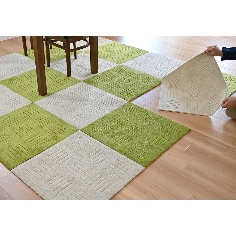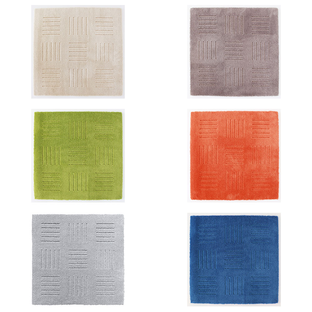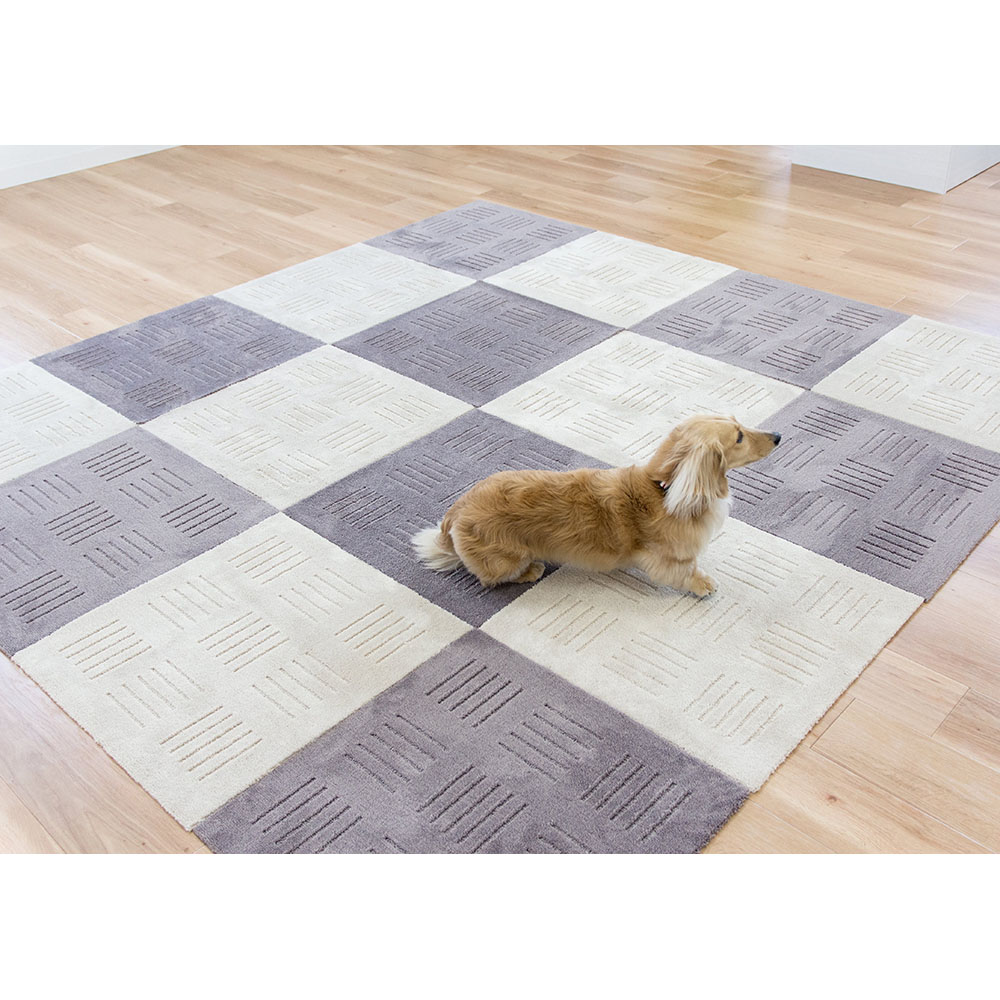 (写真は、(ア)ベージュ4枚と (イ)ブラウン12枚を使用) 凹凸で表現したシンプルなスクエア柄のマットが、オシャレなリビングラグに。