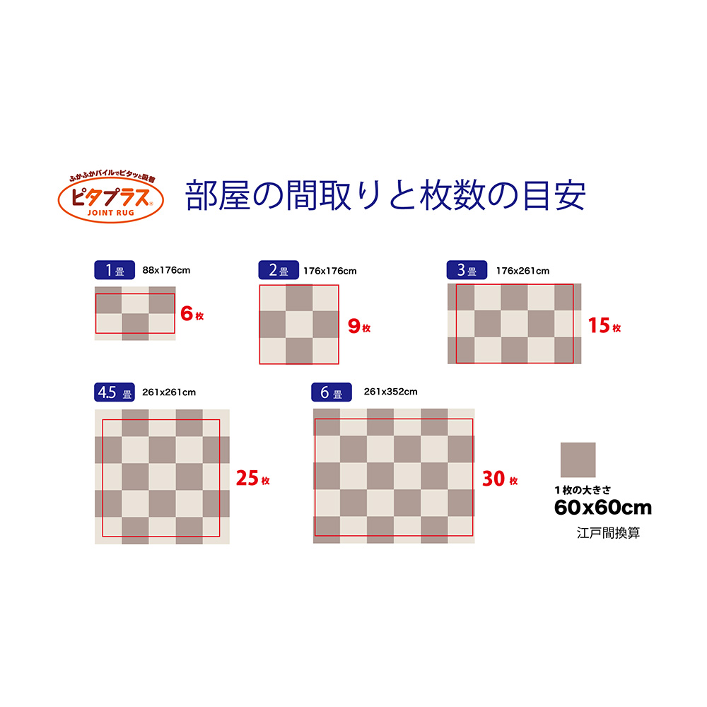 つなぎ合わせたり組み合わせたり。自分だけのマットやラグが完成!厚さ約10ミリのしっかりた素材で、ふかふかな踏み心地。スペースに合わせて枚数を決めてから、色やデザインを自由に考えるだけ!キッチンマット、リビングのラグ、ペットの遊びスペース、用途や好みに合わせて枚数と色の組み合わせが自在にできる、ふかふかのタイルマット。固いタイルマットと違ってやわらかで、足ざわりも気持ちいい!しっかりとした踏み心地のキッチンマットが好みの方にもおすすめです。裏面が吸着加工になっているので、敷きたいと思った場所に簡単にピタッと設置することができます。1枚1枚取り外して手軽に洗えるので、ペットを飼われている方にもおすすめです。※約45×60cmタイプもご用意しています。※無垢材にはご使用いただけません。※ホットカーペットカバー、こたつ敷きにはお使いいただけません。【ポイント1】まるで1枚のラグやマットのよう1枚1枚プラスして、好きな場所で好きな分だけつなげて使うピタプラス(R)。四辺は、つなげた際につなぎ目が分かりにくく、きれいに見える特殊なカットになっています。まるで1枚のラグやマットのような美しい見た目。キッチン、リビング、廊下、玄関、ベッドルームと使い方はいろいろ。実用性と見た目の良さを兼ね備えたマットです。【ポイント2】ピタッと吸着してズレにくい裏面は吸着加工で、フローリングなどの床にピタッと吸着。掃除機をかけても吸い上がりにくく、ズレにくく快適に使えます。ロボット掃除機もスイスイ動きます。裏面に汚れが付くと吸着力は落ちますが、洗えば吸着力が復活します。【ポイント3】キッチンでの立ち仕事も疲れにくい厚さが約10ミリあるのでクッション性があり、高密度のふかふかの毛足が足への負担を和らげてくれます。長時間立ちっぱなしでも疲れにくく、冬場は冷え対策としても活躍します。自由な形に設置できるので、アレンジがラクラク。I型キッチンはもちろん、L字型キッチン、アイランド型キッチン、対面型キッチンにも対応します。【ポイント4】床下収納のあるキッチンにも床下収納を開くために、キッチンマット全体を移動させなくても、床下収納のところだけ外せばOKなので便利です。【ポイント5】ペットの足元用としても大活躍しっかりとした厚みがあるので、走り回るペットの足にも優しくなっています。ペットの憩いのスペースとして使用すれば、大切なワンちゃんの足腰の負担を軽減できます。【ポイント6】丸洗い可能、簡単お手入れでいつも清潔汚れやすいキッチンマットは洗濯の回数が増えるもの。また、大きなラグだと重くて洗うのは本当に大変。このマットなら、汚れたらその部分だけをサッと外して手軽に洗濯機で洗えます。全体を洗う必要がないので、軽くて干すのも簡単。乾いたらもとの場所に戻すだけです。つなぎ目が分かりにくい特殊カットにより、お洗濯を繰り返してもパイルがほつれにくく、ふかふか感が損なわれにくくなっています。もちろん、繰り返し洗っても吸着力はそのままです。※洗濯機でお洗濯する場合は必ずネットをご使用ください。※乾燥機・ドラム式洗濯機は使用できません。【ポイント7】床暖房対応床暖房に対応しているので、キッチンだけではなくリビングでも活躍します。※床暖房の長時間の連続使用や高温でのご使用は避けてください。※ホットカーペットカバーとしては使用できません。