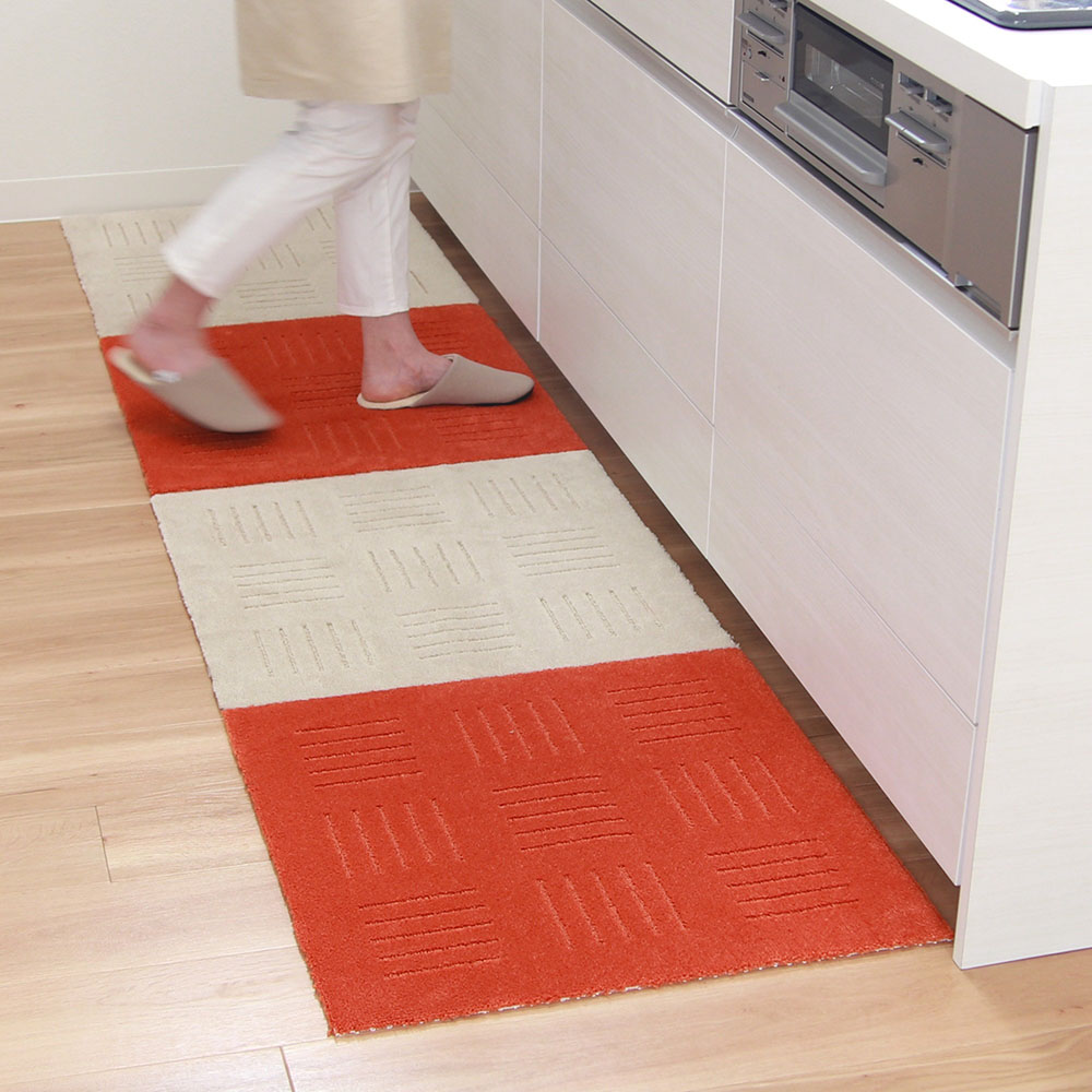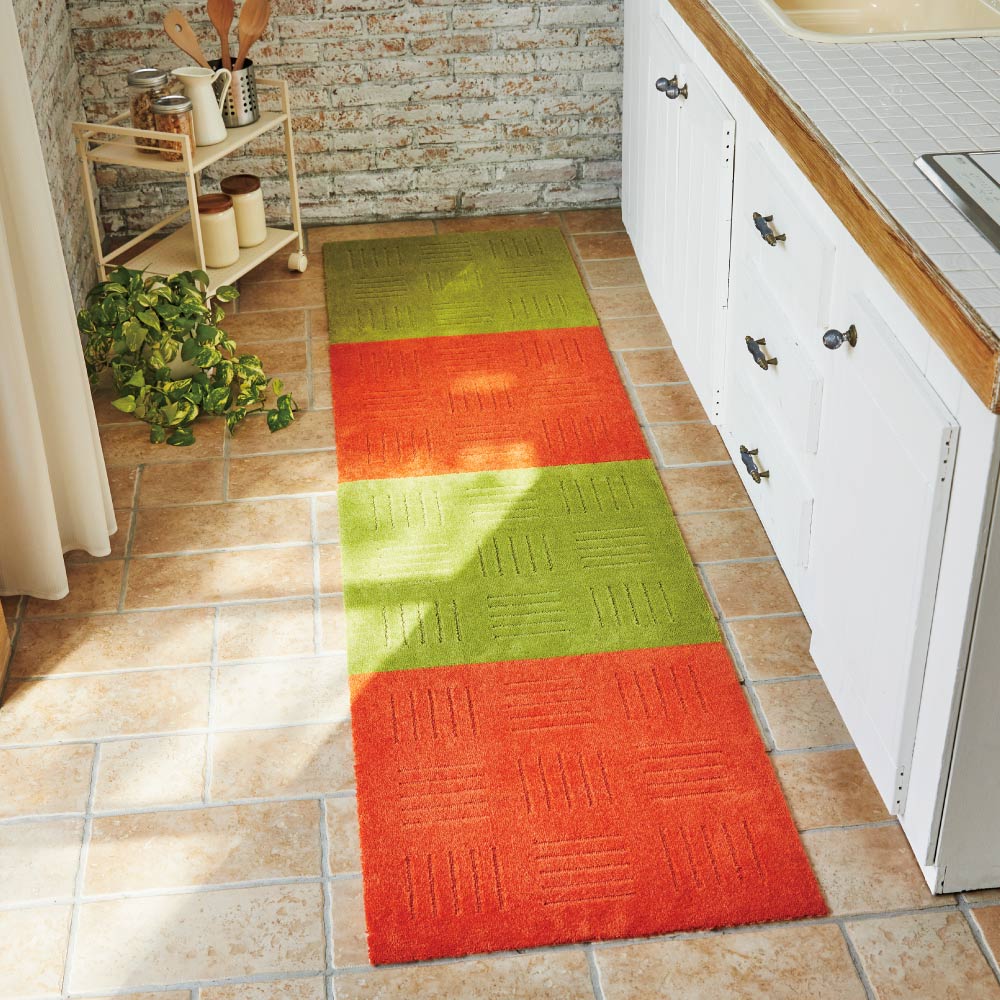手前から(エ)オレンジ (ウ)グリーン(写真は各色2枚計4枚使用) 1列にピタッと繋げてキッチンマットに。約60幅のゆったりサイズで汚れをしっかりカバー。 ※お届けは同色2枚組になります。