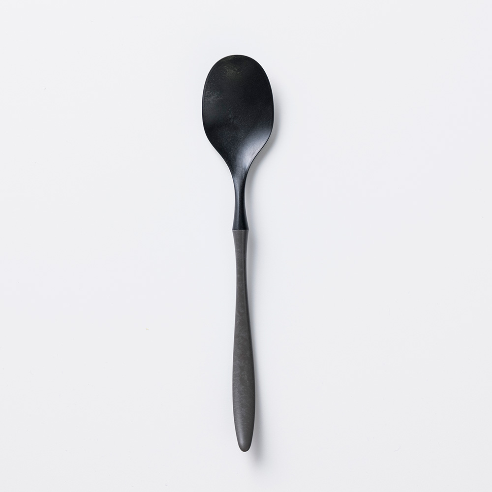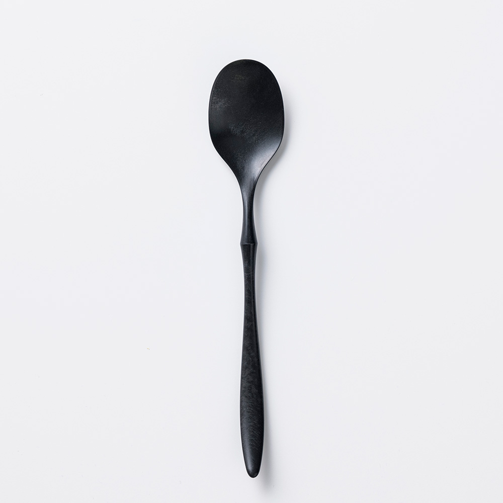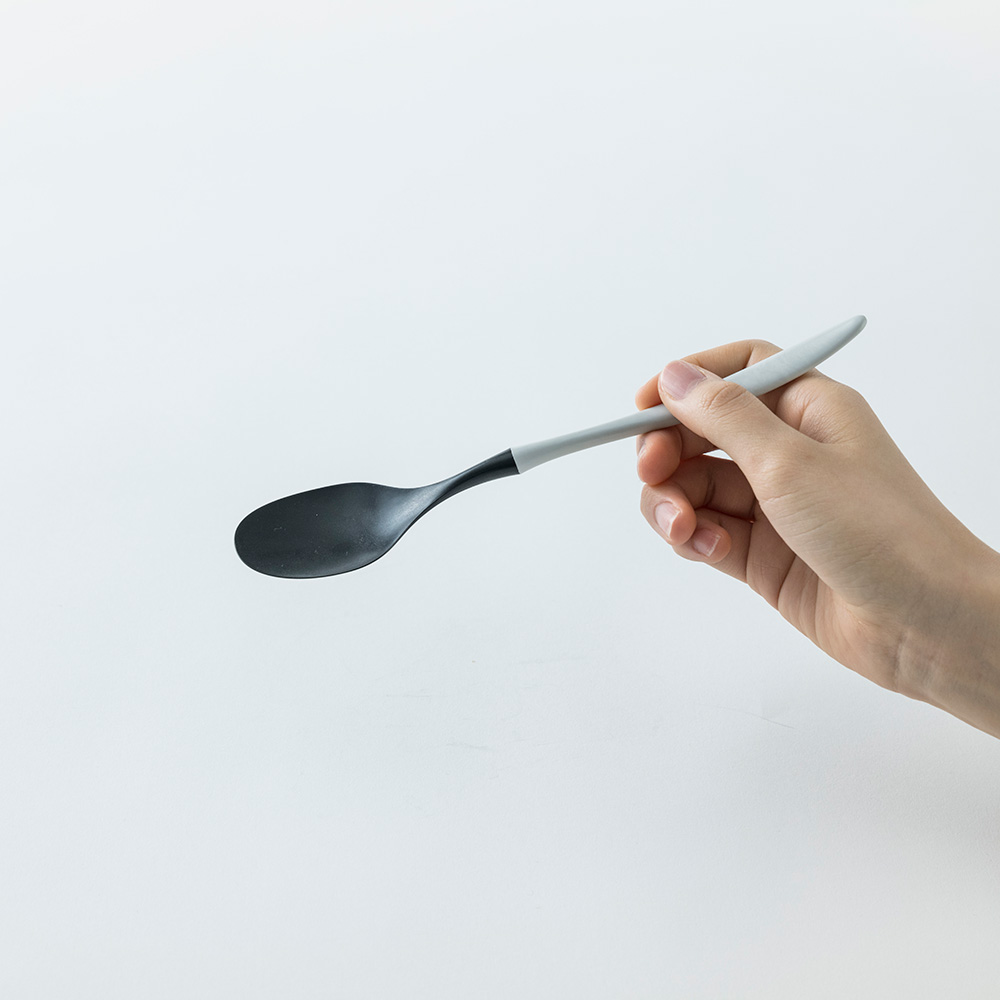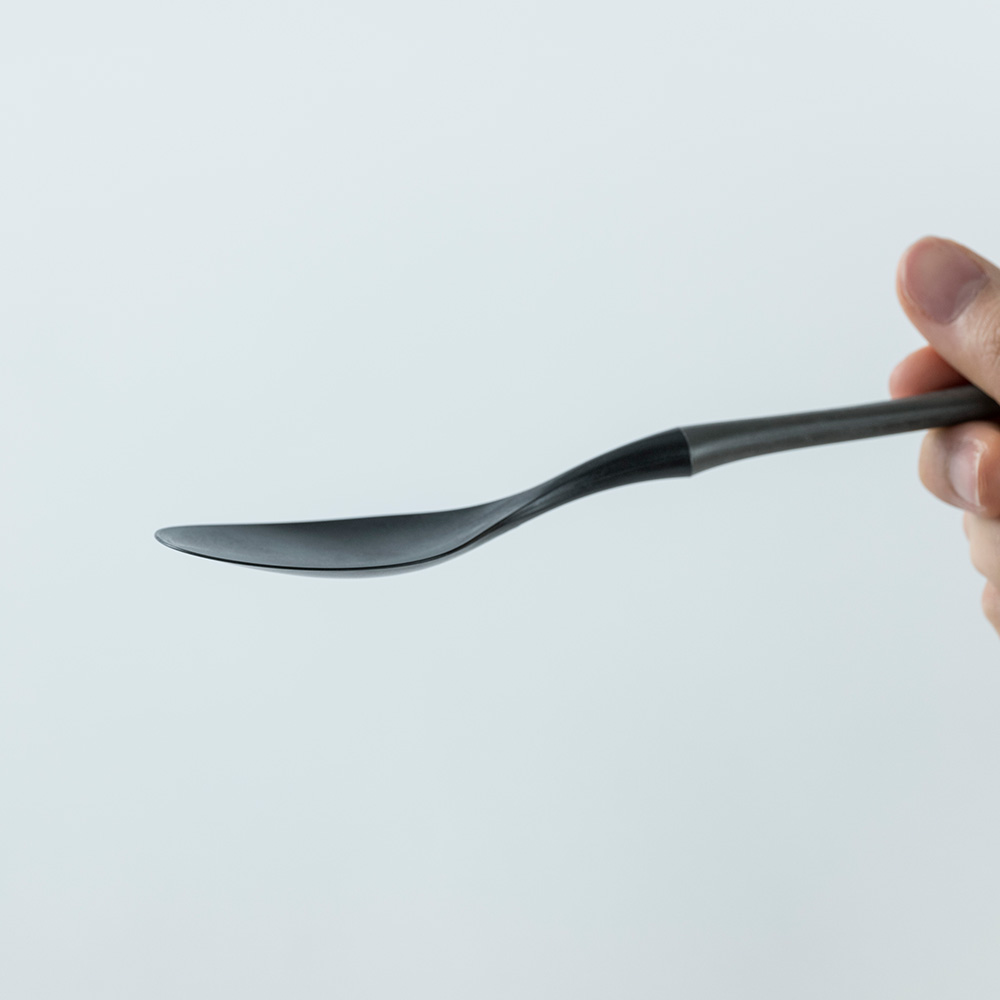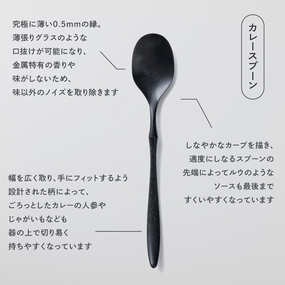 非常に薄い0.5mmの縁。薄張りグラスのような口抜けが可能になり、金属特有の香りや味がしないので、食材の味を楽しめます。幅を広く取り、手にフィットするよう設計された柄によって、ごろっとしたカレーの人参やじゃがいもなども器の上で切り易くなっています。しなやかなカーブを描き適度にしなるスプーンの先端によってルウのようなソースも最後まですくいやすくなっております。