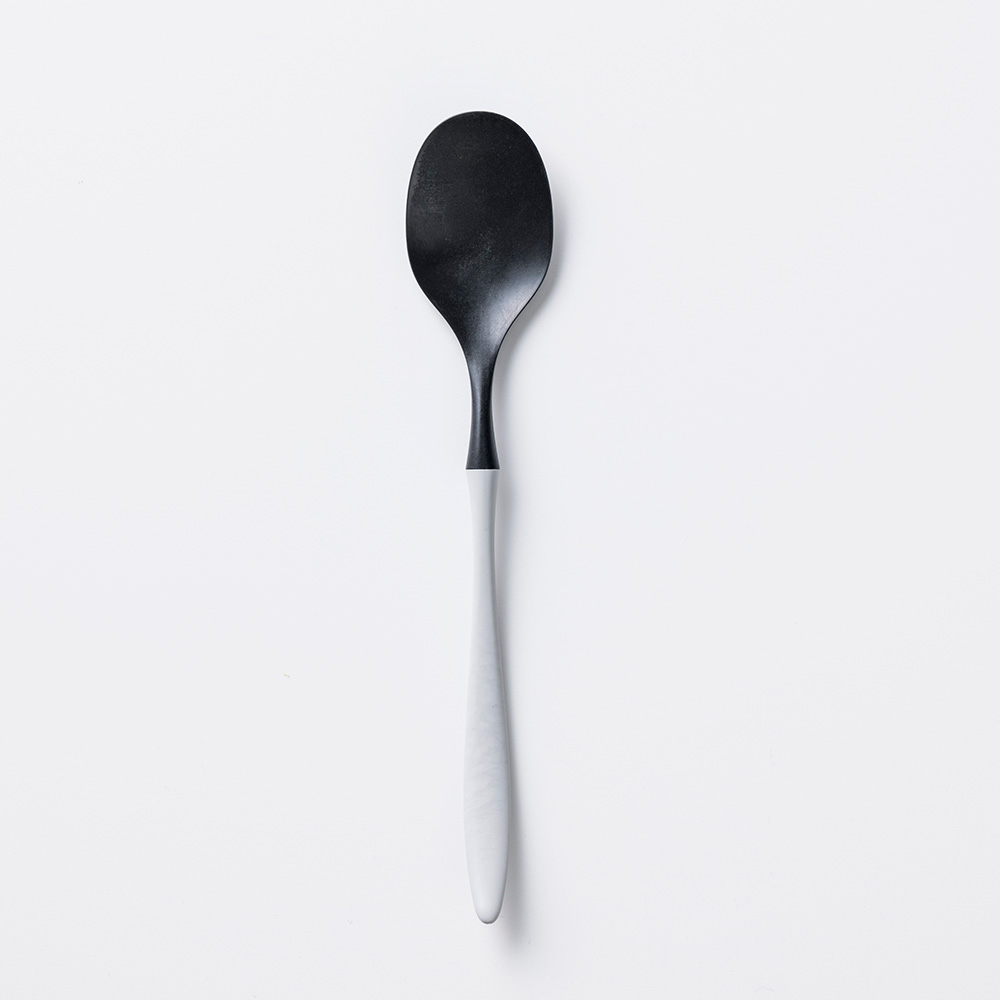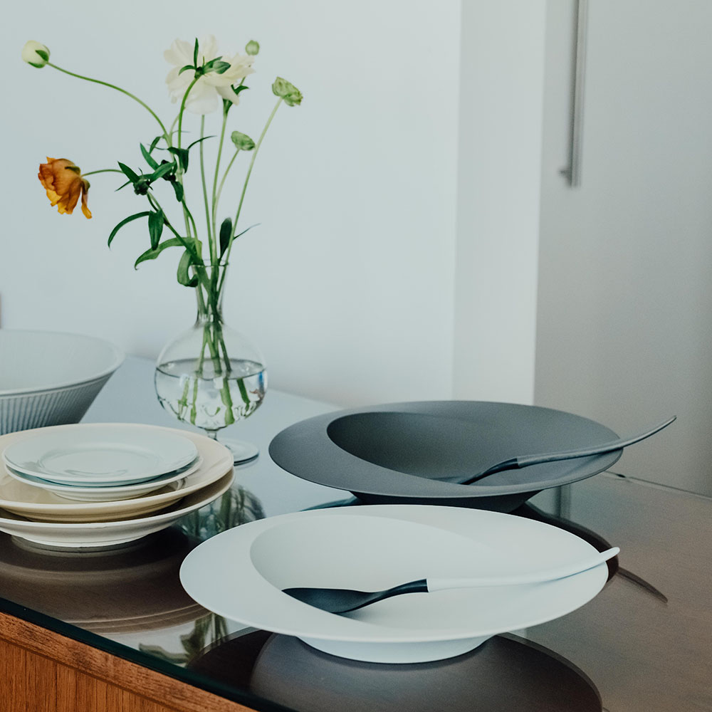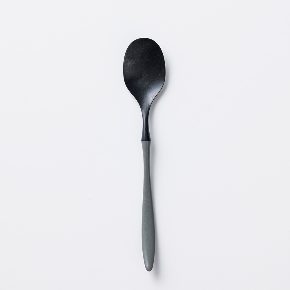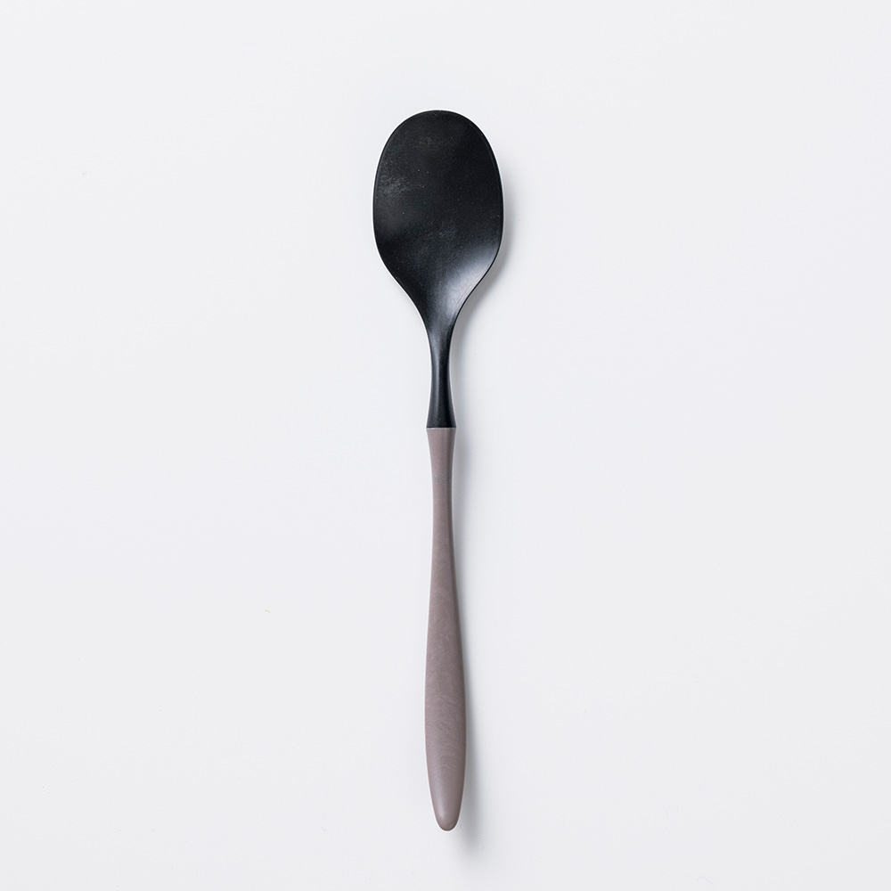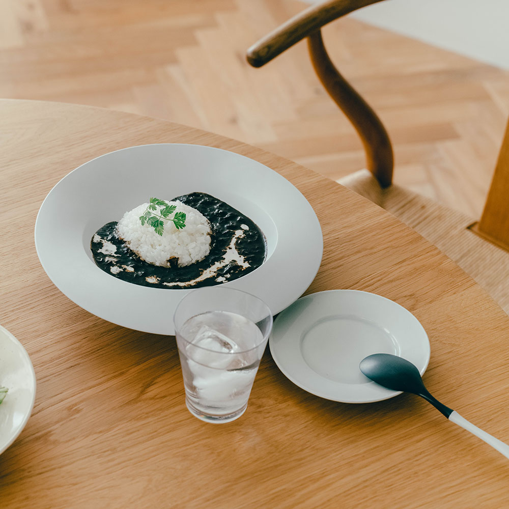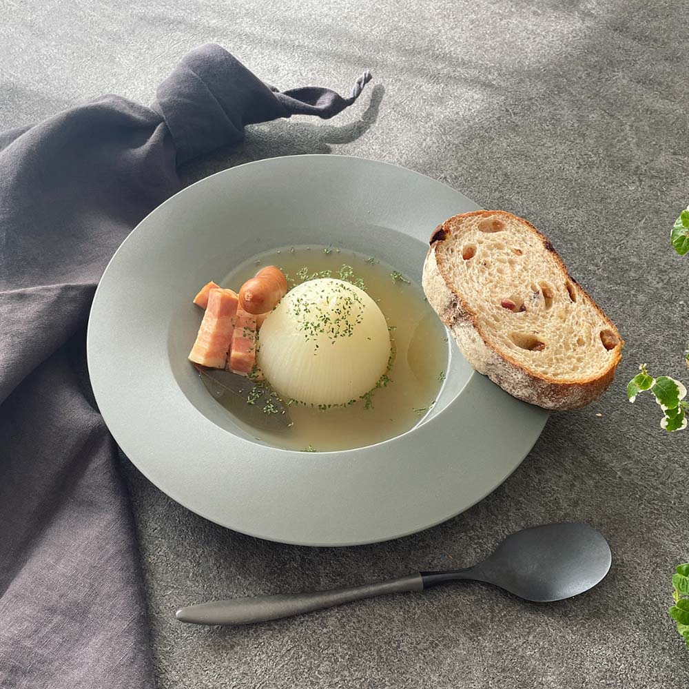 非常に薄い0.5mmの縁。薄張りグラスのような口抜けが可能になり、金属特有の香りや味がしないので、食材の味を楽しめます。幅を広く取り、手にフィットするよう設計された柄によって、ごろっとしたカレーの人参やじゃがいもなども器の上で切り易くなっています。しなやかなカーブを描き適度にしなるスプーンの先端によってルウのようなソースも最後まですくいやすくなっております。