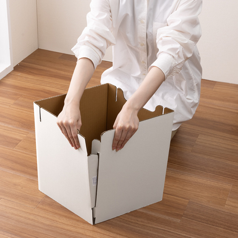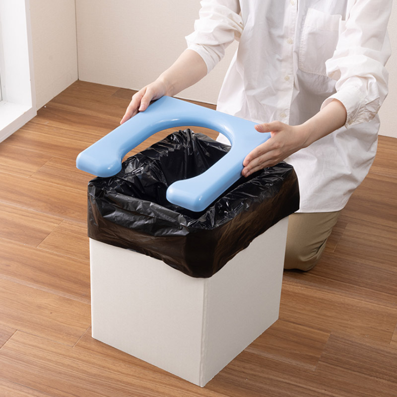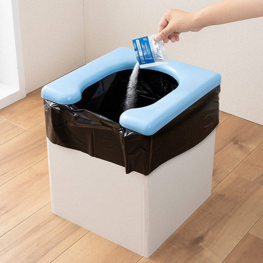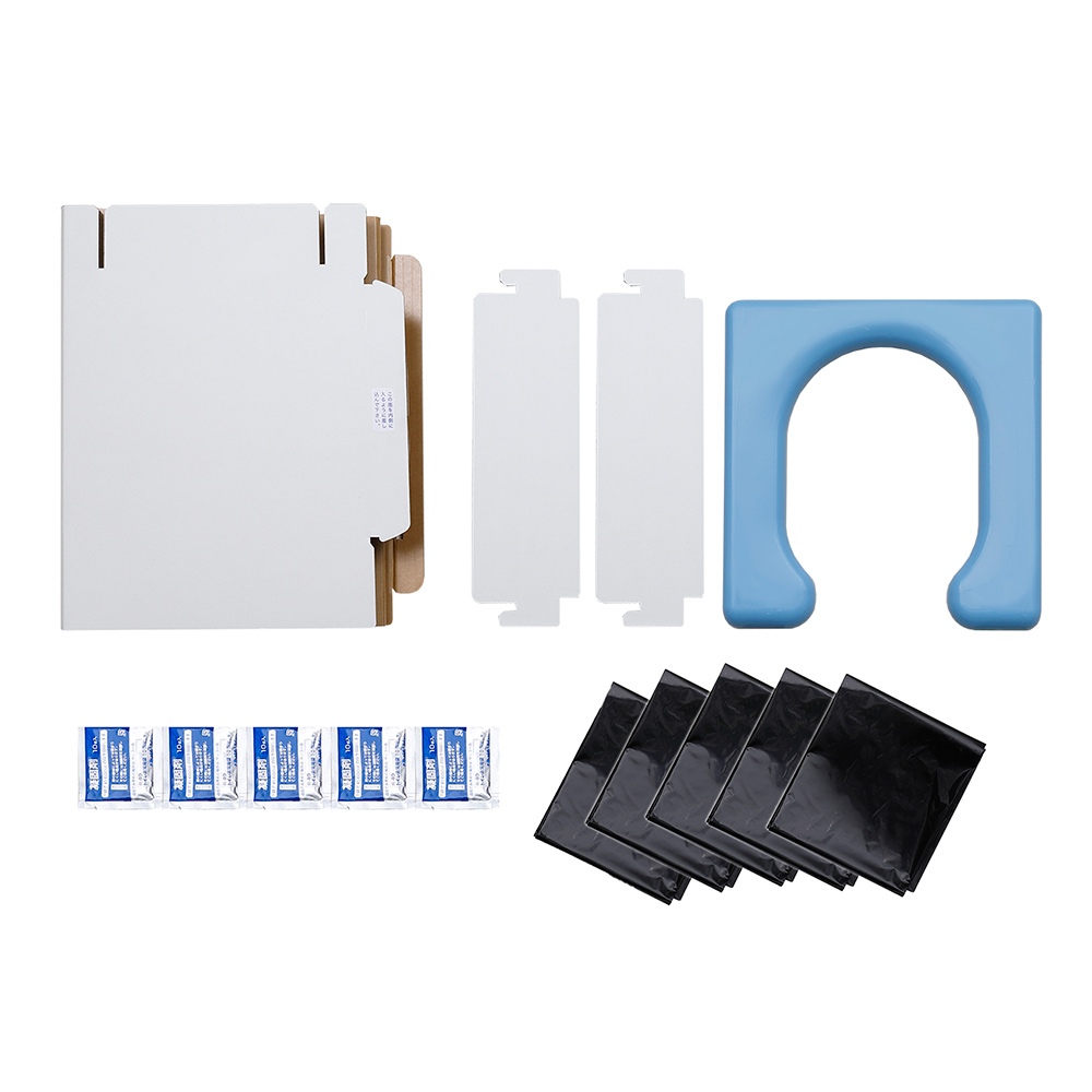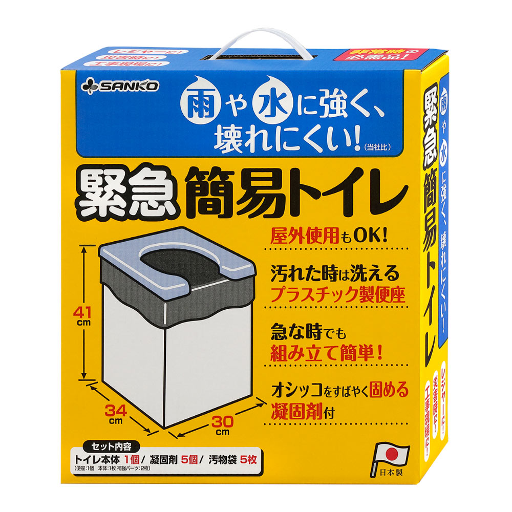 災害時に備えておく簡易トイレ。本体を開いて、補強パーツを差し込み、便座をのせるだけで簡単に組み立てできます。耐荷重約120kgの頑丈な構造で、耐水ダンボールを使用しているので、雨や水に強く、屋外使用もできます。組み立て時の高さが41cmあるので男性でも使いやすいサイズです。●耐水ダンボールを使用していますので、雨や水に強く壊れにくくなっています。(当社比)●折りたためますので持ち運びに便利です。(外装箱を収納箱として使用できます。)●男性でも使用しやすいU型便座です。●約120kgの体重まで支えることができます。●室内でポータブルトイレとしても使用できます。●本体は軽くて丈夫な紙なので非常時も持ち運びしやすいです。●凝固剤、汚物袋は5回分をセット。