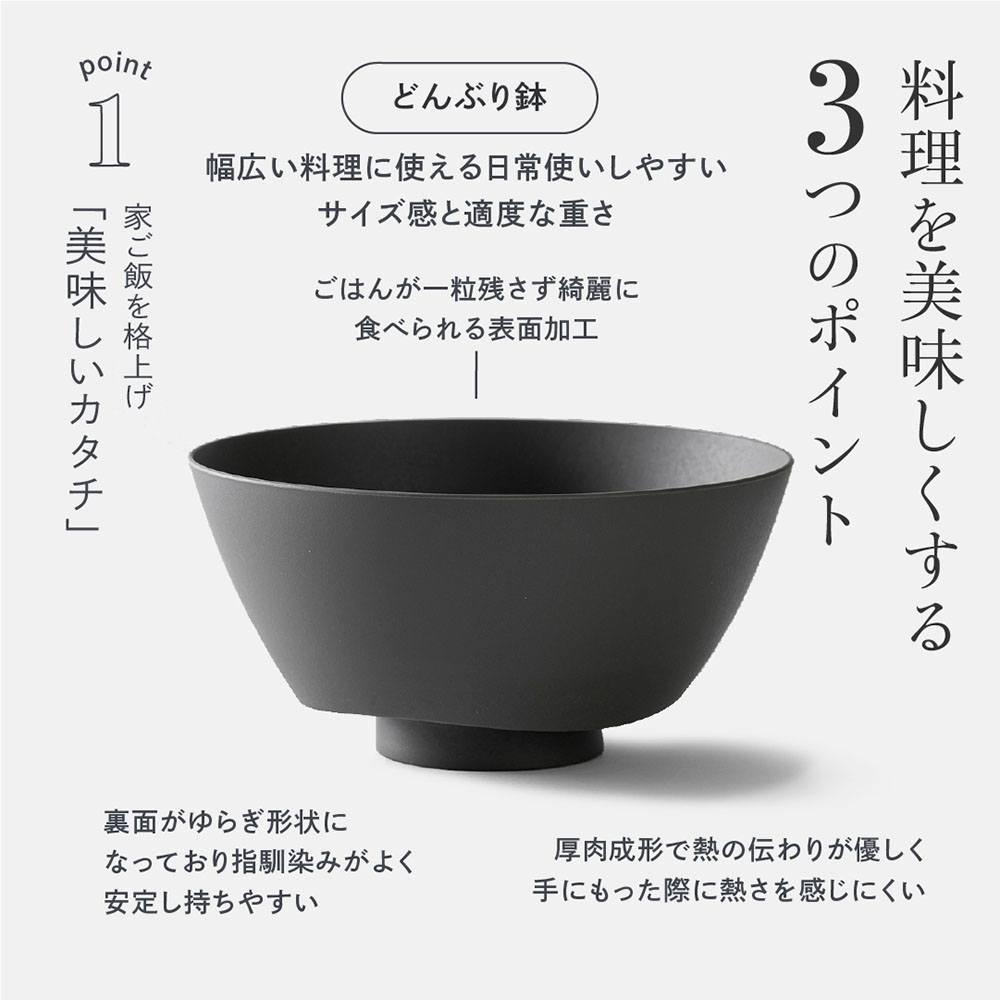 熱さを感じにくく、安定して持ちやすい丼鉢と蓋になる浅鉢のセットです。使いやすく、料理をより美味しくする最新素材を採用。お手入れが簡単で、割れることがないから、手軽にずっと使える。 星付きレストランのシェフも認めるデザイナーが手掛けた食器です。幅広い料理に使える日常使いしやすいサイズ感と適度な重さのどんぶり鉢です。料理を美味しくする3つのポイント(1)ご飯が一粒残さずきれいに食べられる表面加工(2)厚肉成形で熱の伝わりが優しく手に持った際に厚さをか感じにくい(3)表面が揺らぎ形状になっており指なじみが良く安定し持ちやすい和洋中なんにでもマッチする!定番の親子丼やうな丼はもちろん、熱くなりにくいのでお出汁たっぷりのお蕎麦やうどんを入れても便利に使えます。すっとオシャレなたたずまいなので、いつもの鉄火丼がモダンジャパニーズ風に変身しますよ。和風はもちろん、ロコモコ丼など洋風のお料理にもピッタリ合います♪とにかく軽くて扱いやすいと大人気です。どんぶり鉢の蓋にもなる浅型鉢がセットになっています。こちらは単品でも幅広い料理に使え日常使いしやすいサイズ感です。直径約16.2cm高さ3.9cmとテーブル上でも使いやすいサイズなので、各自の取り皿としてご使用するのにも便利です。一人前のお刺身や天ぷらも美しく盛れるサイズ感。ほうれん草のお浸しやお漬物もたっぷりのります。高台付きなので、いつもの料理もぐっと高級感のあるエレガントな雰囲気に演出できます。一緒にお届けするドンブリ鉢の蓋としてご使用すると冷めにくく、オシャレでもグンとアップします!ARASシリーズとはお気に入りの食器を持っていても、割れる心配があったり手入れが必要だったりと、なかなか普段使いしずらい。「だけど、毎日の食事をこだわりたい!」ARASは、こだわりのある人が普段使いできる食器を目指し、使いやすく、料理をより美味しくする、新素材の食器を発明しました。いちから設計して誕生した今までにないカタチで使いやすく、料理をより美味しくする最新素材を採用。お手入れが簡単で、割れることがないから、手軽にずっと使える。 星付きレストランのシェフも認めるデザイナーが手掛けた食器です。 盛り付けから片付けまで使いやすく心地よい重さを感じられます。ガラスと樹脂を掛け合わせた新素材これまでの常識をひっくり返し、素材、技術、カタチ、全てを一から考え直しました。永く使い続けてもらうために、ガラスと樹脂を掛け合わせた新素材を開発。熟練した日本の職人の技術によって、表現が難しかったデザインを実現し、環境に優しく、暮らしを豊かに彩るカタチ。先進と伝統の技術が融合して生まれる、新しい食器です。お気に入りのお皿と一緒に使ってもお皿を傷つける心配が少なくく、永くお使いいただけます。1000回落としても割れない・欠けない素材で様々なシーンで使用できます自信をもってお届けできる耐久性だから、「生涯破損保証」をお付けします。万が一割れ欠けが起こった場合、弊社にお送りいただければ無償で新しいものと交換致します。※送料はご負担となります。※メーカーが続く限りのご提供となります。食洗機、漂白剤対応。BPAフリー
