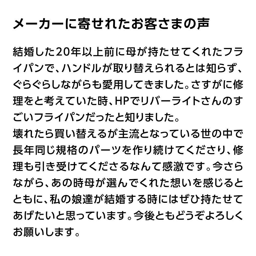 特殊熱処理による加工を施しているのでサビにくく、使い始めの「から焼き」や洗い終わった後の「油引き」が不要。お手入れ簡単なので、鉄フライパン初心者も安心して使えます。調理するたびに自然に鉄分摂取が期待できるのも鉄鍋の長所。健康を心地よくサポートします。鉄フライパン初心者にも、うれしい使い勝手を追求。「リバーライト」で目指せプロの味。「鉄鍋は扱いが難しそう」なんていう心配はいりません。特殊熱処理を施したこのフライパンならサビにくく、面倒なお手入れは不要。届いたその日からすぐに使えます。強火調理が可能なので、プロ顔負けの仕上がりをおうちで簡単に実現!ステーキは表面はカリッと、中はジューシーに焼き上げます。鉄フライパンは蓄熱性と放熱性が高く、一度温まると高温をキープ。食材を投入しても温度が下がりにくく、さらにその熱をたっぷりと食材に伝えるという特徴があり、お肉もおいしく焼き上げます。強火調理ができるので、パラパラ炒飯があっという間に作れます。たっぷりの熱量でご飯の水分を一気に飛ばせば、お店で食べるようなパラパラ炒飯が完成します。 ※画像は炒め鍋28cmです。面倒なお手入れ不要だから初心者でも扱いやすい!基本のお手入れは、調理後フライパンが温かいうちにたわしで洗って水気を拭くだけ。油を塗る必要はありません。タフなので、こびり付いた汚れはたわしでゴシゴシこすってもOK。特殊熱処理「窒化加工」により、鉄の弱点であるサビを防ぎます。左が本品。右は窒化加工をしていないフライパン。窒化加工により表面に「窒化鉄層+酸化鉄層」が作られ、新品なのに使い込まれた鉄フライパンの状態を再現。フライパンの半分を23時間水道水につけたテストでも、窒化加工を施したリバーライトにはサビが発生しませんでした。鉄フライパンは、たくさん使うほど、使いやすく育ちます。こちらは15年間使い込んだフライパン。鉄フライパンはコーティング加工していないので劣化しません。むしろ使えば使うほど、フライパン表面に油がなじんでこびり付きにくく、サビにくく、より使いやすく変化していきます。フライパンは3サイズ。左から20cm、26cm、28cm。20cmは目玉焼きがちょうど2枚焼けるサイズ。朝ごはんやお弁当のおかずなど、ちょっとした一品を作るときに便利です。26cmは一度に3?4人分を調理できるのでファミリー層におすすめ。28cmはハンバーグ4個が余裕で焼けます。素材にまでこだわった質の高い調理道具で、健康によく、おいしい料理を。「良い道具は、使い手の生活の質を向上させ、人生をより豊かにするきっかけにもなり得るものだ。そういう道具を作っていこう」。それがリバーライトの仕事です。シリーズでそろえれば、用途に合わせて使い分けることができます。上から28cmの炒め鍋、26cmのフライパン、卵焼きフライパン。