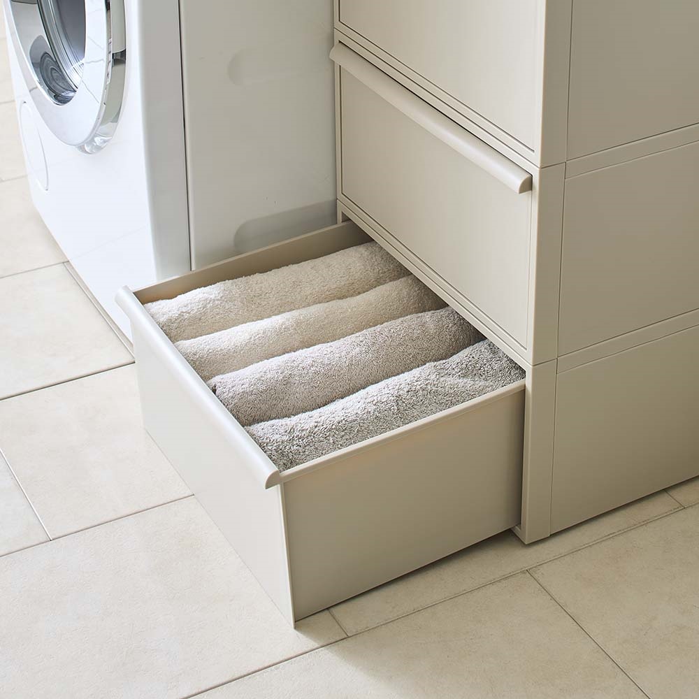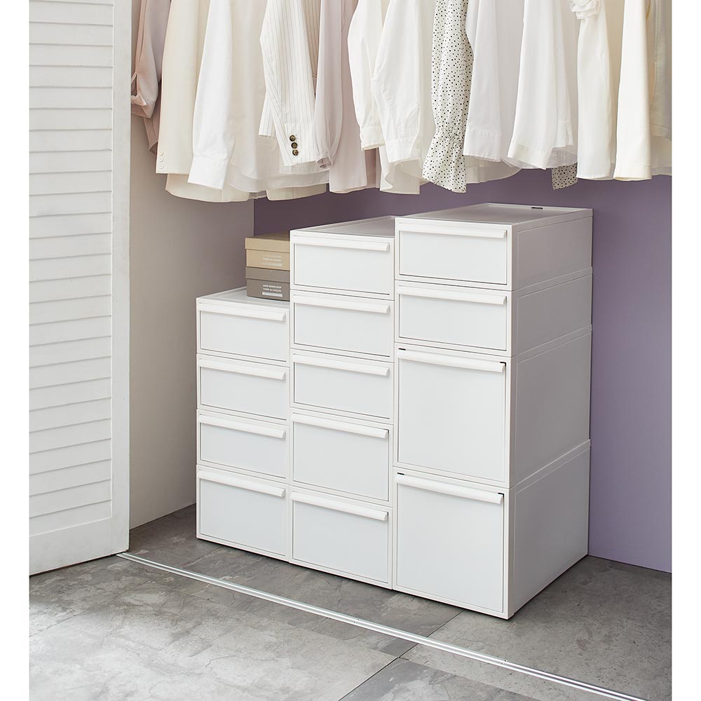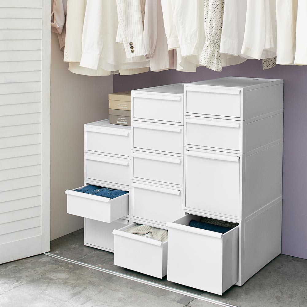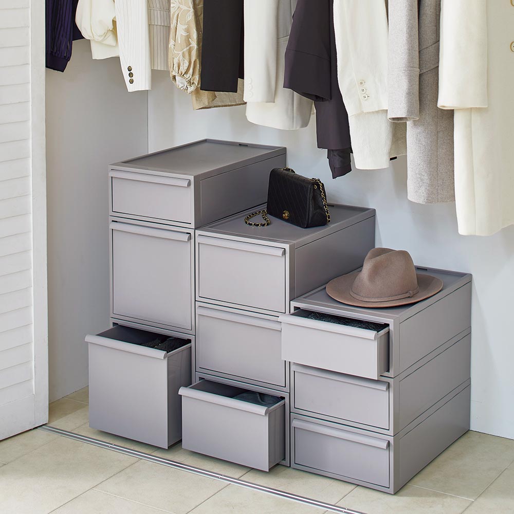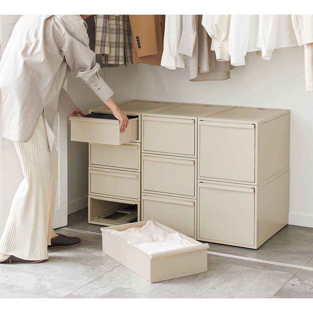 おしゃれなニュアンスカラーで、リビングやサニタリーでも使える収納ケース。クローゼットにもすっきり納まるサイズです。シンプルなデザインにこだわった衣類チェストミニマルデザインのスクエアフォルムにこだわったお洒落な洋服収納ケースのご紹介。隠せる収納で整理整頓ができます。シンプルなデザインで場所を選びません。クローゼットの中はもちろんお部屋で使ってもオシャレなクローゼット収納です。用途に合わせて選べるサイズお好みに合わせて高さが選べます。■浅型:下着やハンカチの収納におすすめ。※幅32cm奥行52cm高さ16.1cm(1個あたり)■中型:シャツやスポーツタオルの収納に。※幅32cm奥行52cm高さ21.5cm(1個あたり)■深型:トレーナーやニットなども収納可能。※幅32cm奥行52cm高さ31.8(1個あたり)■大型:幅が広く薄型のモデルです。※幅45cm×奥行39.5cm高さ24.7cm(1個あたり)浅型×4個、中型×3個、深型×2個は縦に積み上げた時に、同じ高さになる設計です。衣替えにも便利なスタッキング仕様重ねて使用できるので季節ごとの衣替えもそのまま入れ替えるだけで簡単に完了♪浅型・中型・深型は幅と奥行きは同じなので積み方・組み合わせは自由自在です。薄型収納にでスリムなサイズ幅45cm×奥行39.5cmなのでサニタリチェストにも。樹脂ケースなので汎用性が高く、キッチン収納、ストッカー、サニタリ収納、サニタリチェスト、トイレ収納など衣類収納以外でも活躍します。汚れづらくお手入れが簡単なのもポイント。スリムさはもちろん、シャツを畳んでちょうどよく収まるサイズも意識した設計です。