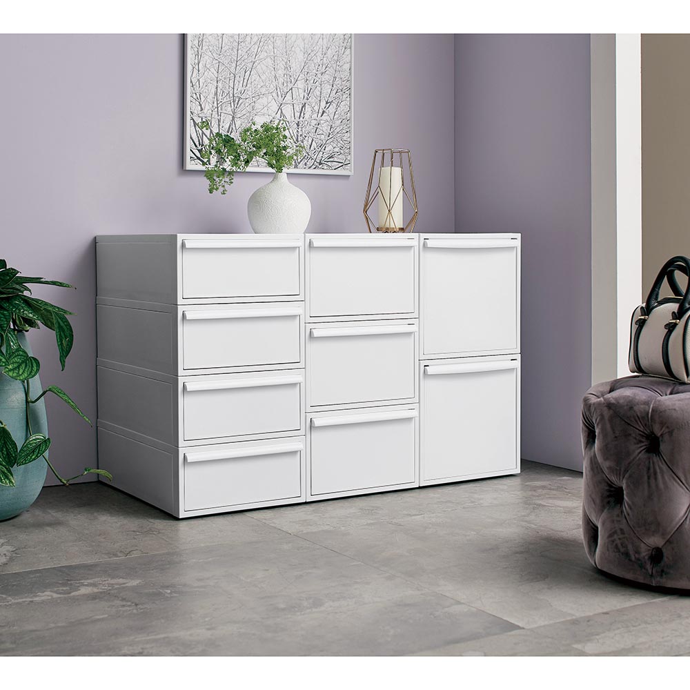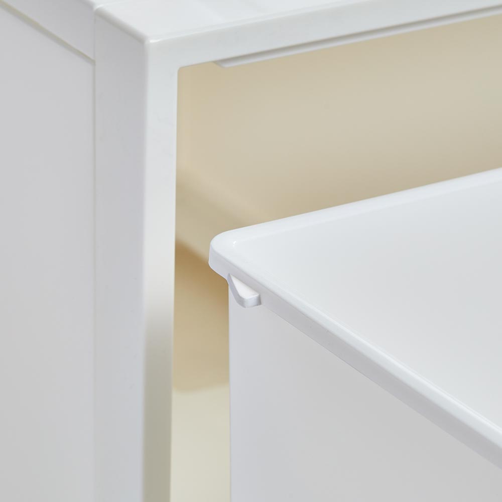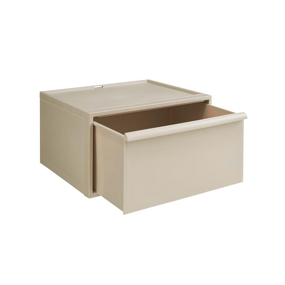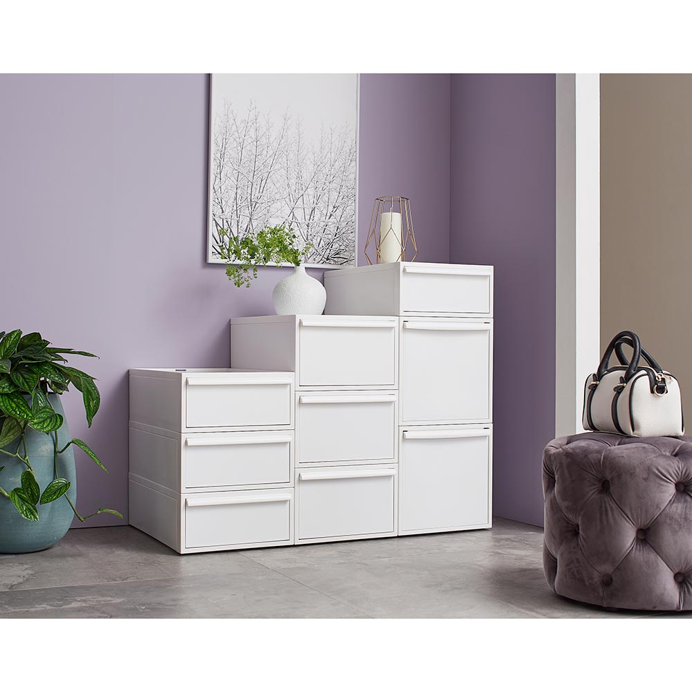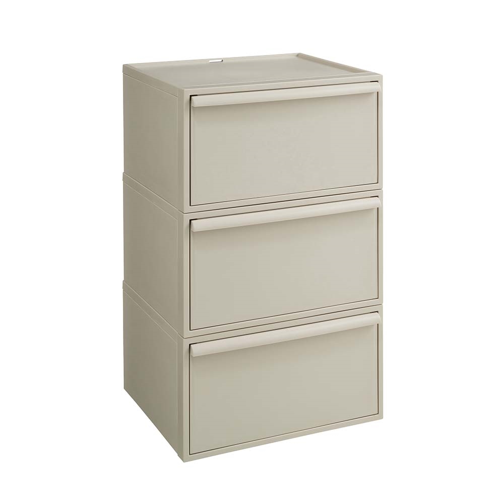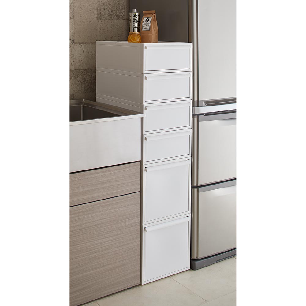 おしゃれなニュアンスカラーで、リビングやサニタリーでも使える収納ケース。クローゼットにもすっきり納まるサイズです。シンプルなデザインにこだわった衣類チェストミニマルデザインのスクエアフォルムにこだわったお洒落な洋服収納ケースのご紹介。隠せる収納で整理整頓ができます。シンプルなデザインで場所を選びません。クローゼットの中はもちろんお部屋で使ってもオシャレなクローゼット収納です。用途に合わせて選べるサイズお好みに合わせて高さが選べます。■浅型:下着やハンカチの収納におすすめ。※幅32cm奥行52cm高さ16.1cm(1個あたり)■中型:シャツやスポーツタオルの収納に。※幅32cm奥行52cm高さ21.5cm(1個あたり)■深型:トレーナーやニットなども収納可能。※幅32cm奥行52cm高さ31.8(1個あたり)■大型:幅が広く薄型のモデルです。※幅45cm×奥行39.5cm高さ24.7cm(1個あたり)浅型×4個、中型×3個、深型×2個は縦に積み上げた時に、同じ高さになる設計です。衣替えにも便利なスタッキング仕様重ねて使用できるので季節ごとの衣替えもそのまま入れ替えるだけで簡単に完了♪浅型・中型・深型は幅と奥行きは同じなので積み方・組み合わせは自由自在です。薄型収納にでスリムなサイズ幅45cm×奥行39.5cmなのでサニタリチェストにも。樹脂ケースなので汎用性が高く、キッチン収納、ストッカー、サニタリ収納、サニタリチェスト、トイレ収納など衣類収納以外でも活躍します。汚れづらくお手入れが簡単なのもポイント。スリムさはもちろん、シャツを畳んでちょうどよく収まるサイズも意識した設計です。