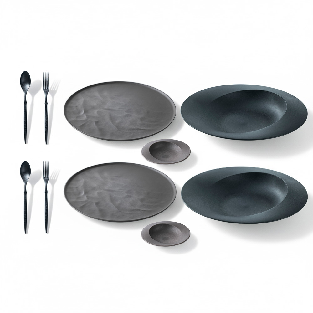 セット内容・・・イ)ブラック系 ・スプーン&フォーク×2(ブラック) 大皿ウェーブ(グレー)×2 深皿スクープ(ブラック)×2 豆皿スクープ(グレー)×2
